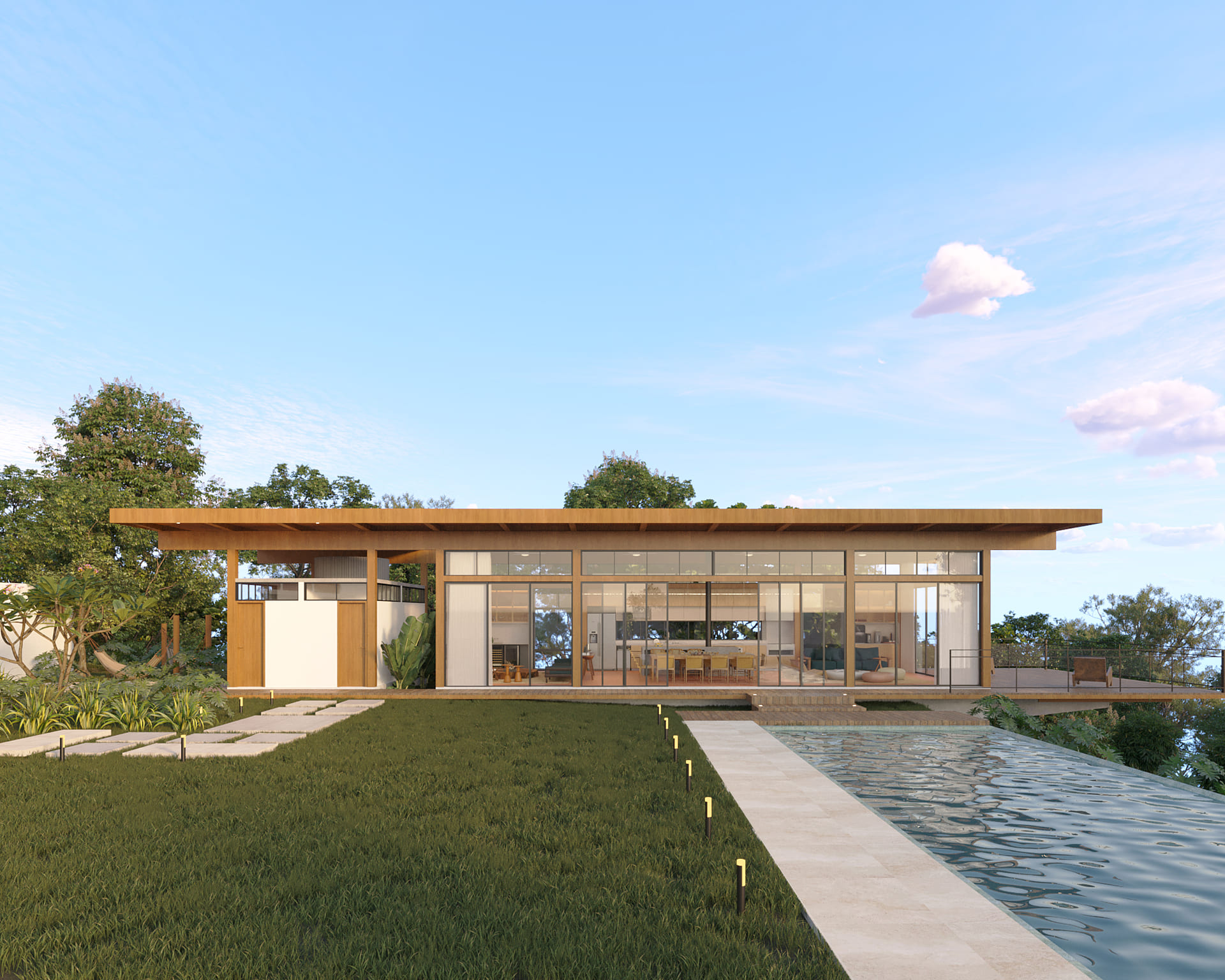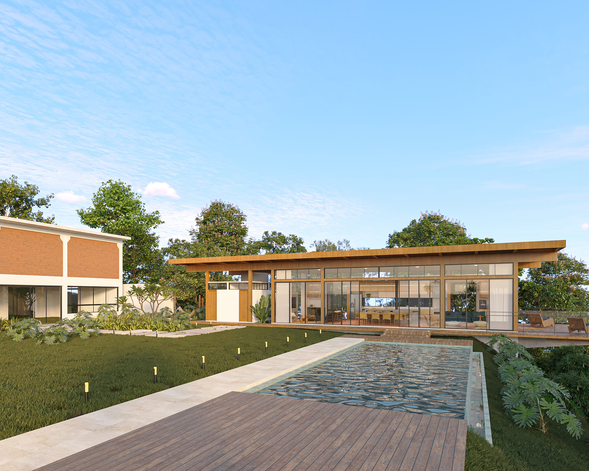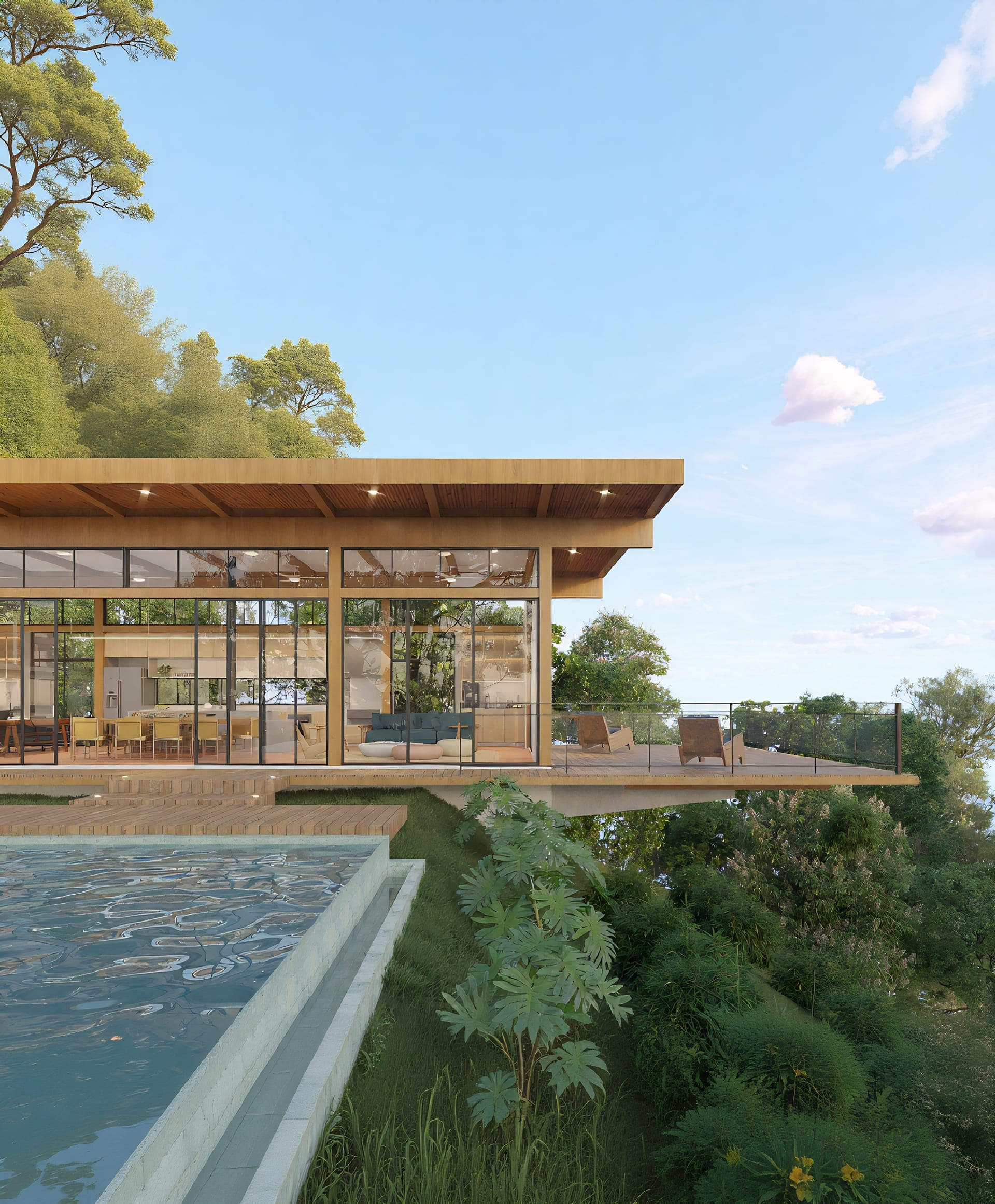 A nova edificação avança em balanço sobre o declive, projetando-se na direção do lago que repousa abaixo. A piscina, com sua borda infinita, marca a transição entre a área plana e o terreno em queda: mergulhar na água é também mergulhar na paisagem.