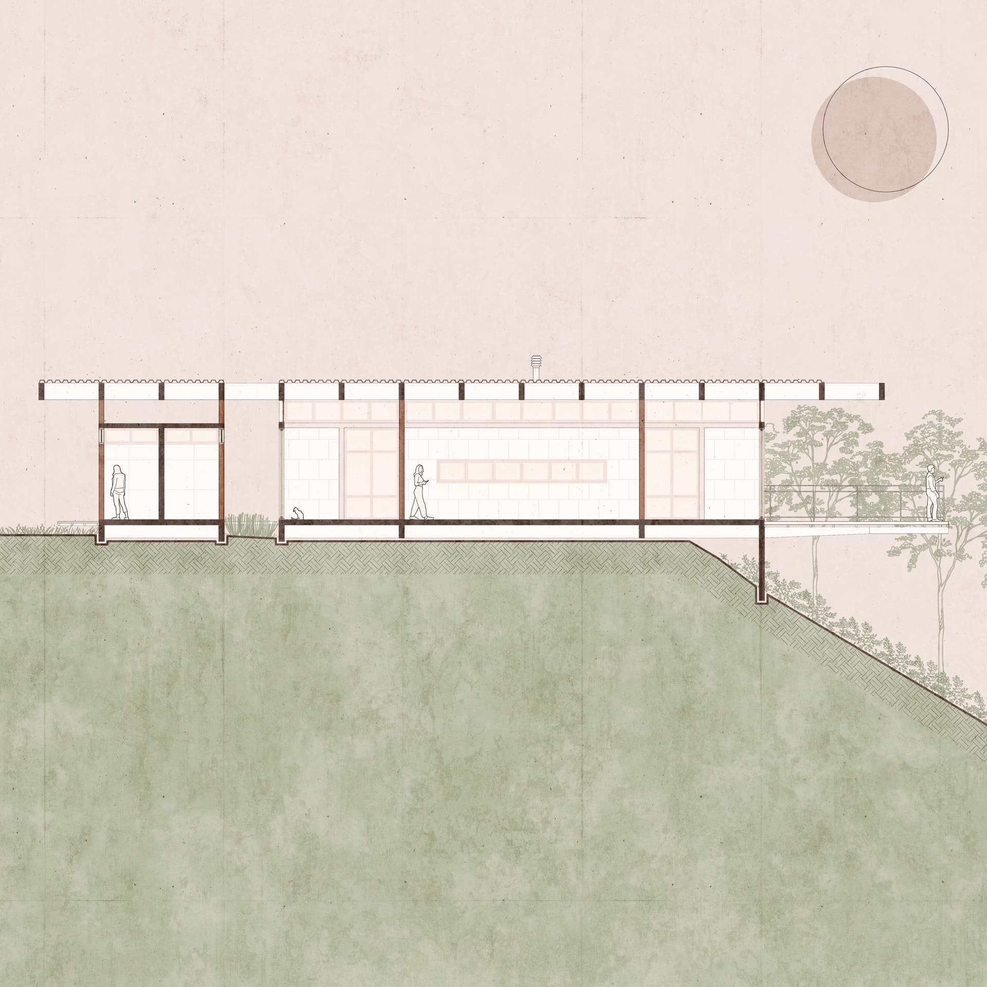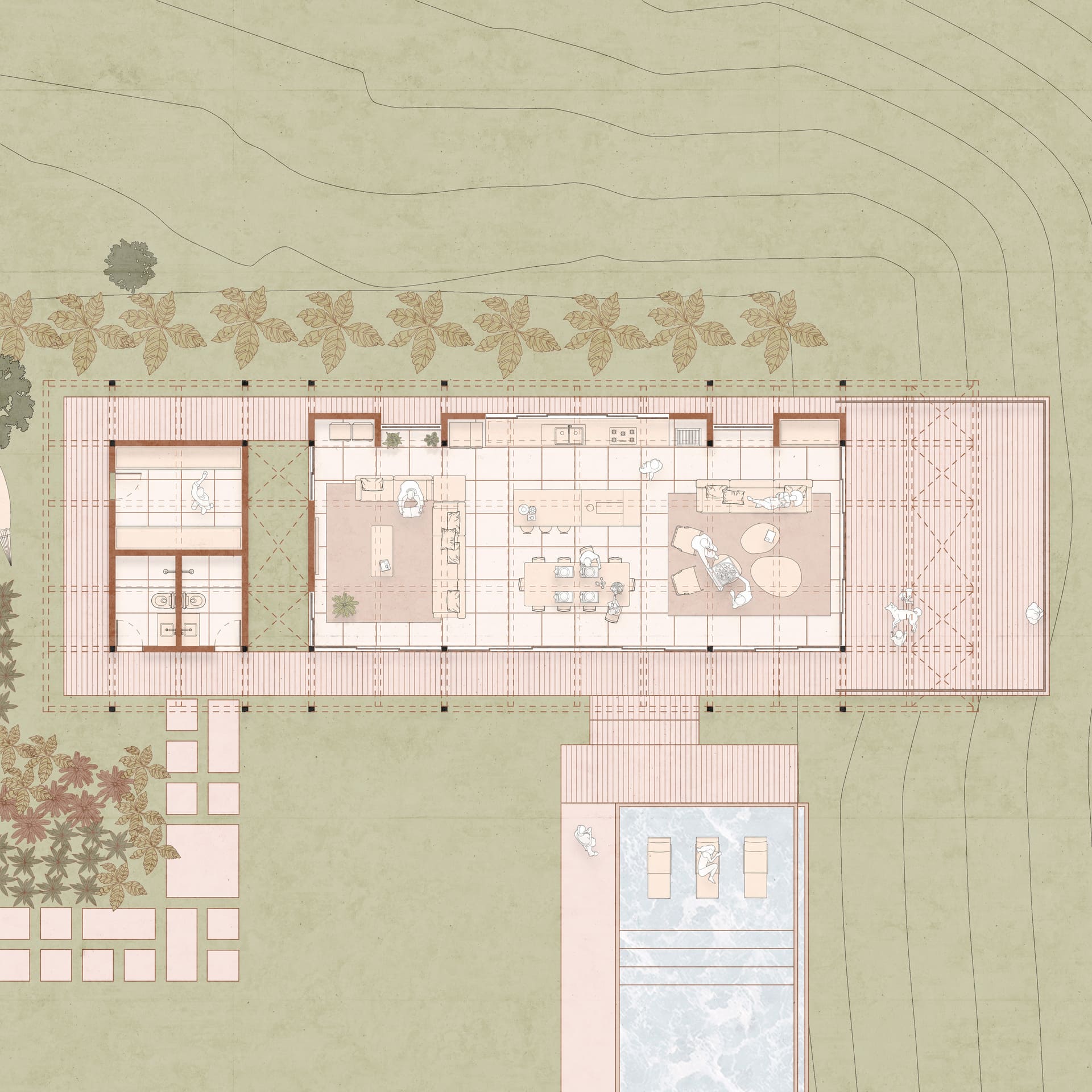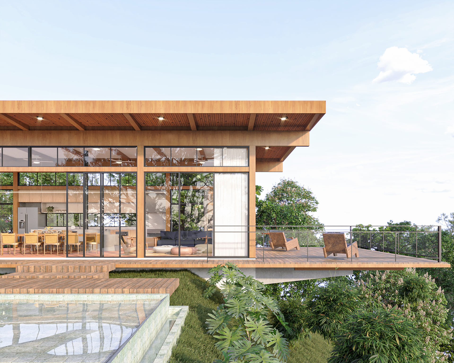 A nova edificação avança em balanço sobre o declive, projetando-se na direção do lago que repousa abaixo. A piscina, com sua borda infinita, marca a transição entre a área plana e o terreno em queda: mergulhar na água é também mergulhar na paisagem.
