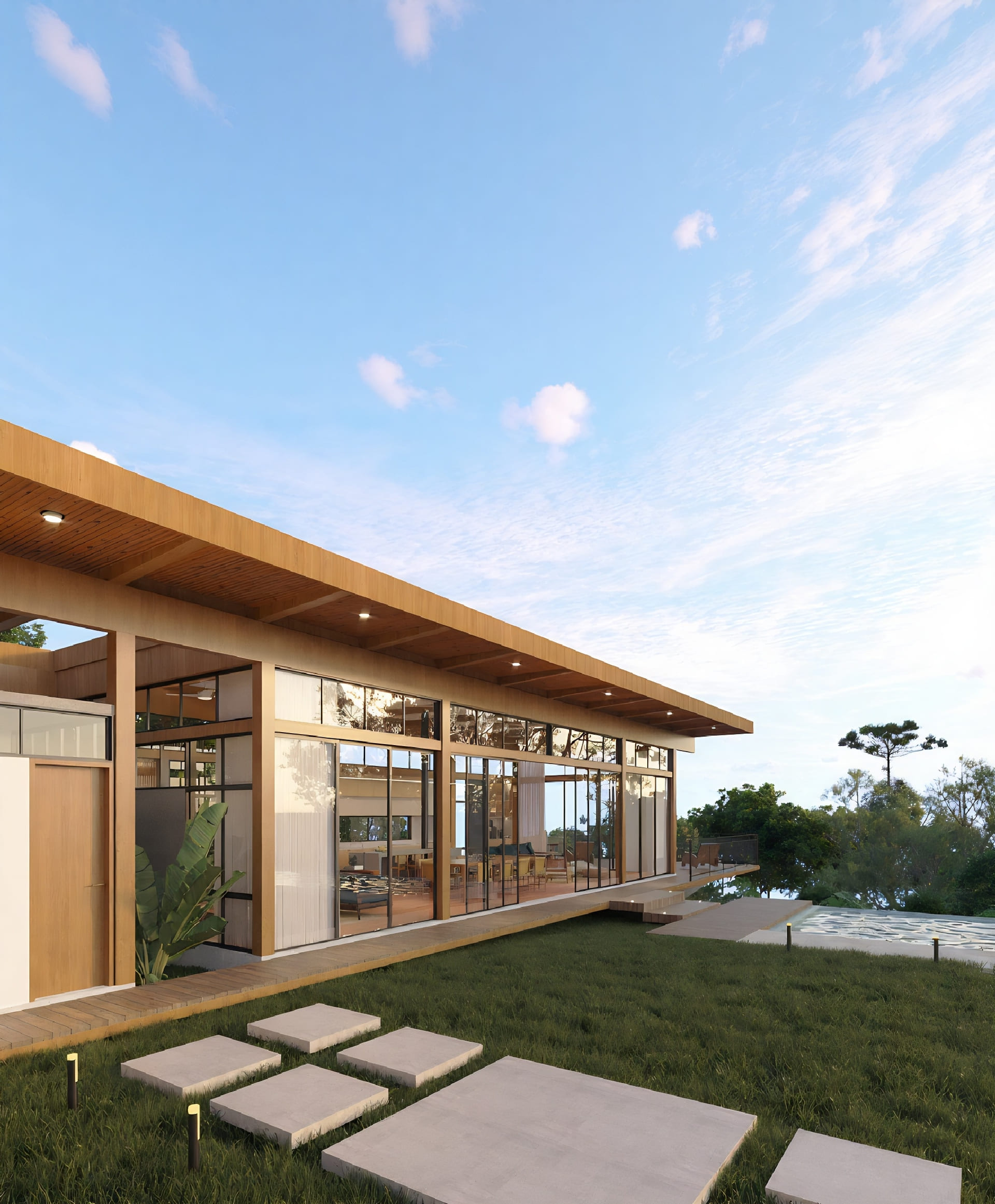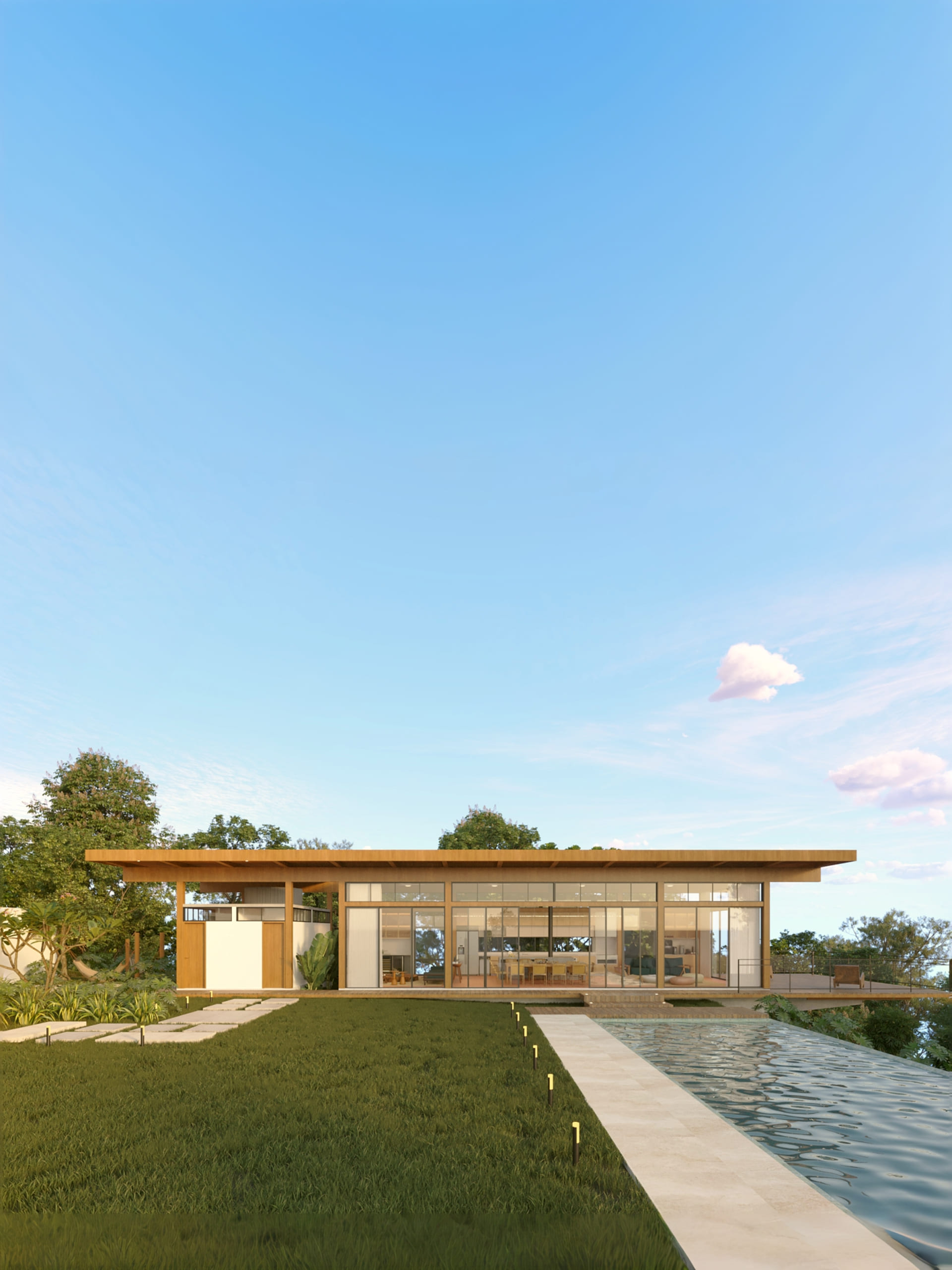A solução veio em forma de uma construção linear em projetada em madeira maciça, marcada por amplos panos de vidro que integram totalmente interior e exterior. Estar dentro é estar fora — imerso na paisagem, no horizonte, na natureza.