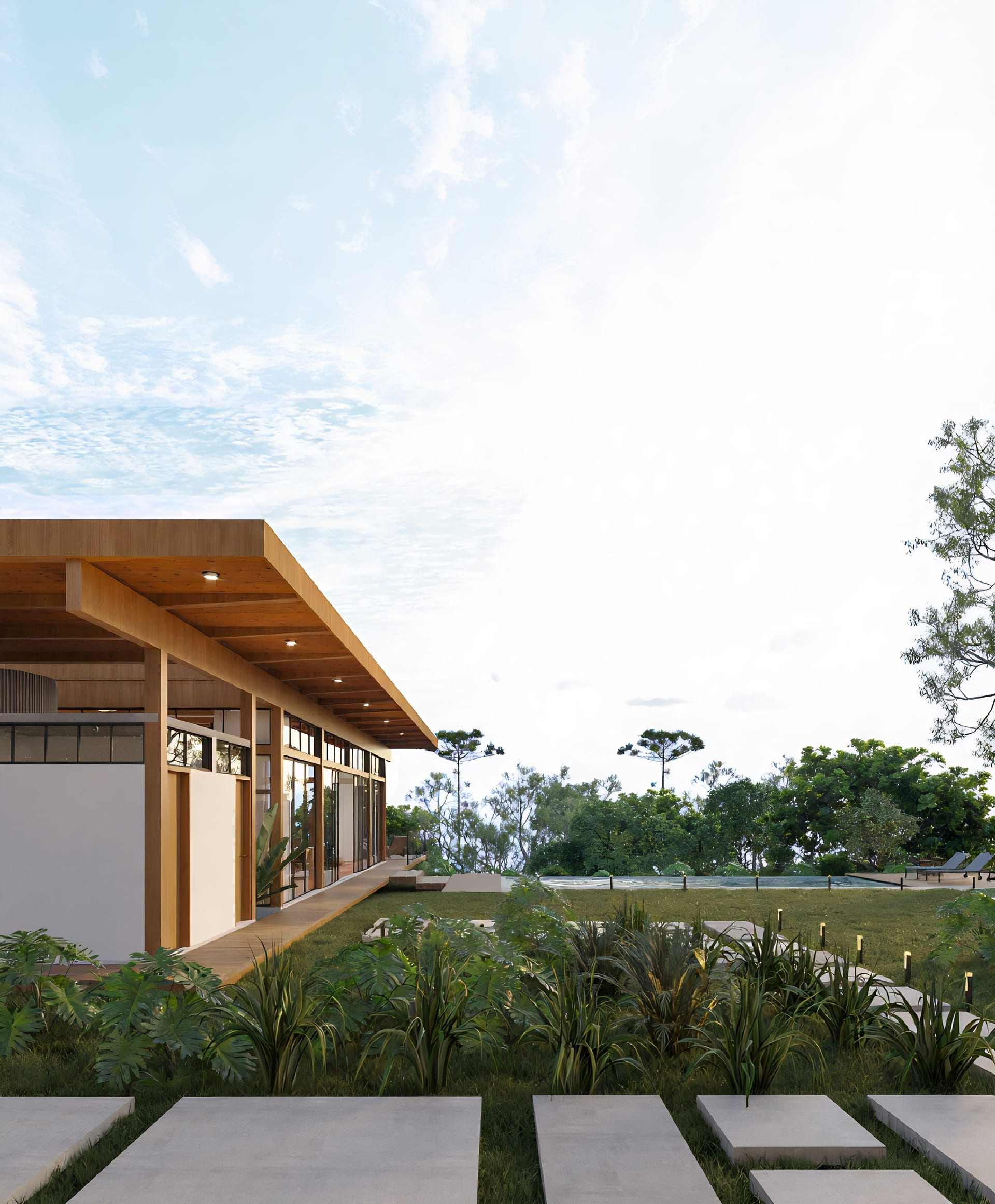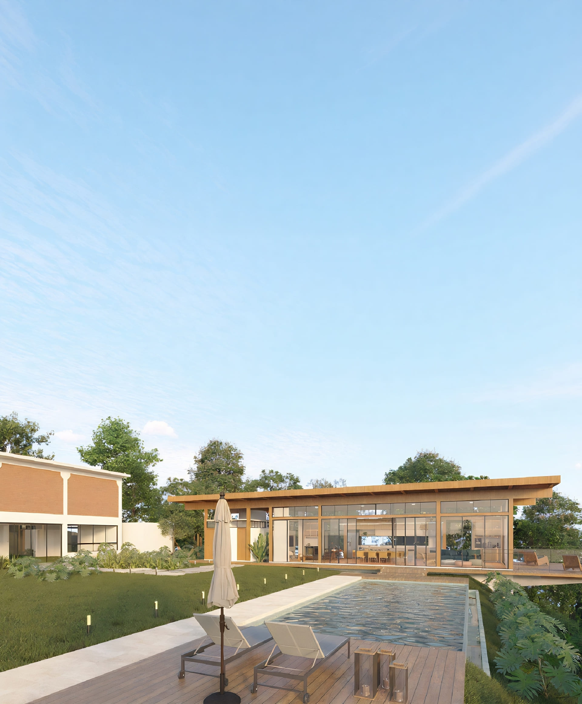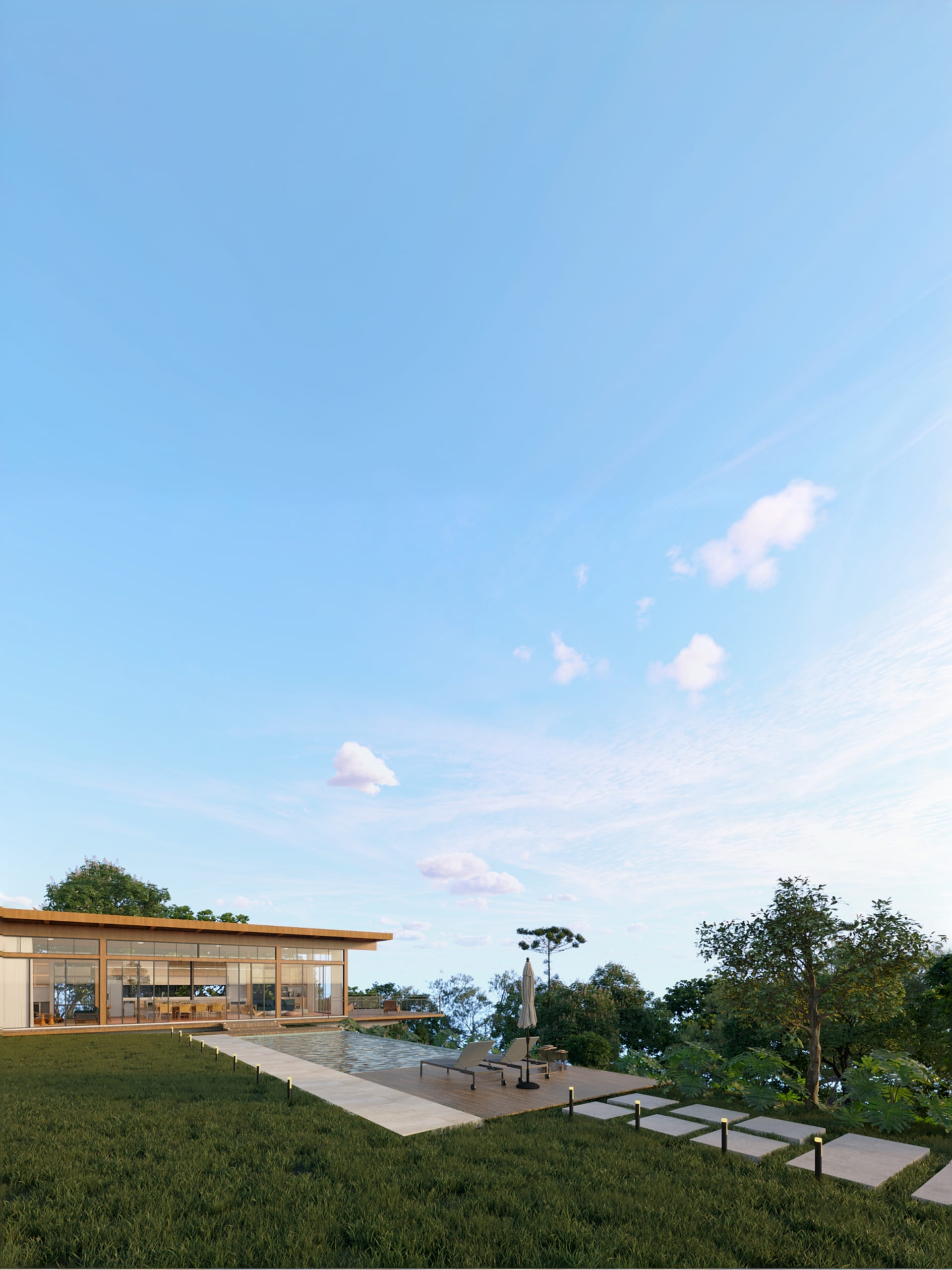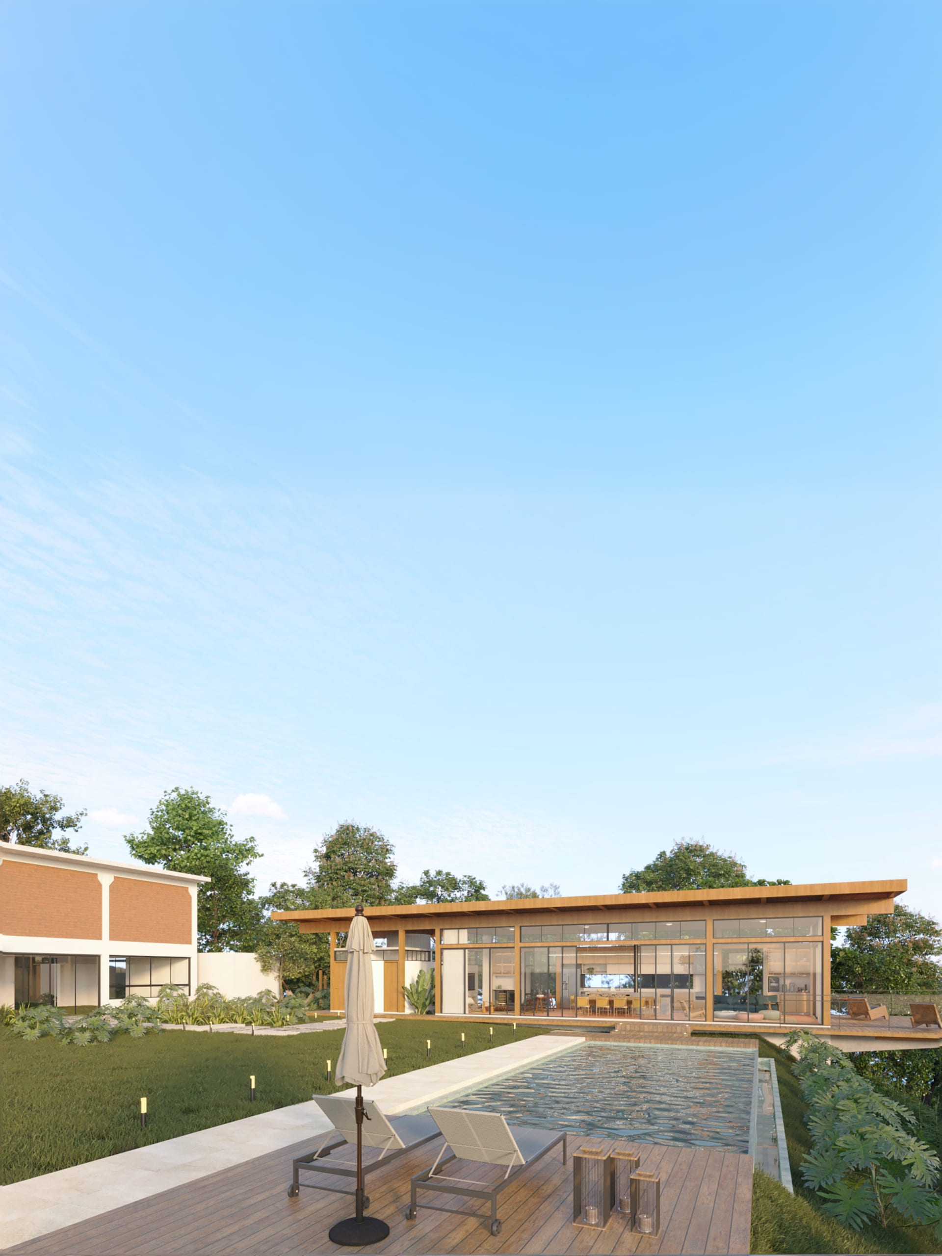 O terreno, com generosos 5.000 m², carecia de espaços de lazer — piscina, churrasqueira, sala de jogos e deck — e foi a partir dessa necessidade que os clientes nos procuraram. Após adquirirem o imóvel, surgiu o desejo de ampliar a área construída com um projeto que respeitasse tanto a arquitetura existente quanto as características do terreno, seu relevo acidentado e suas visuais privilegiadas.