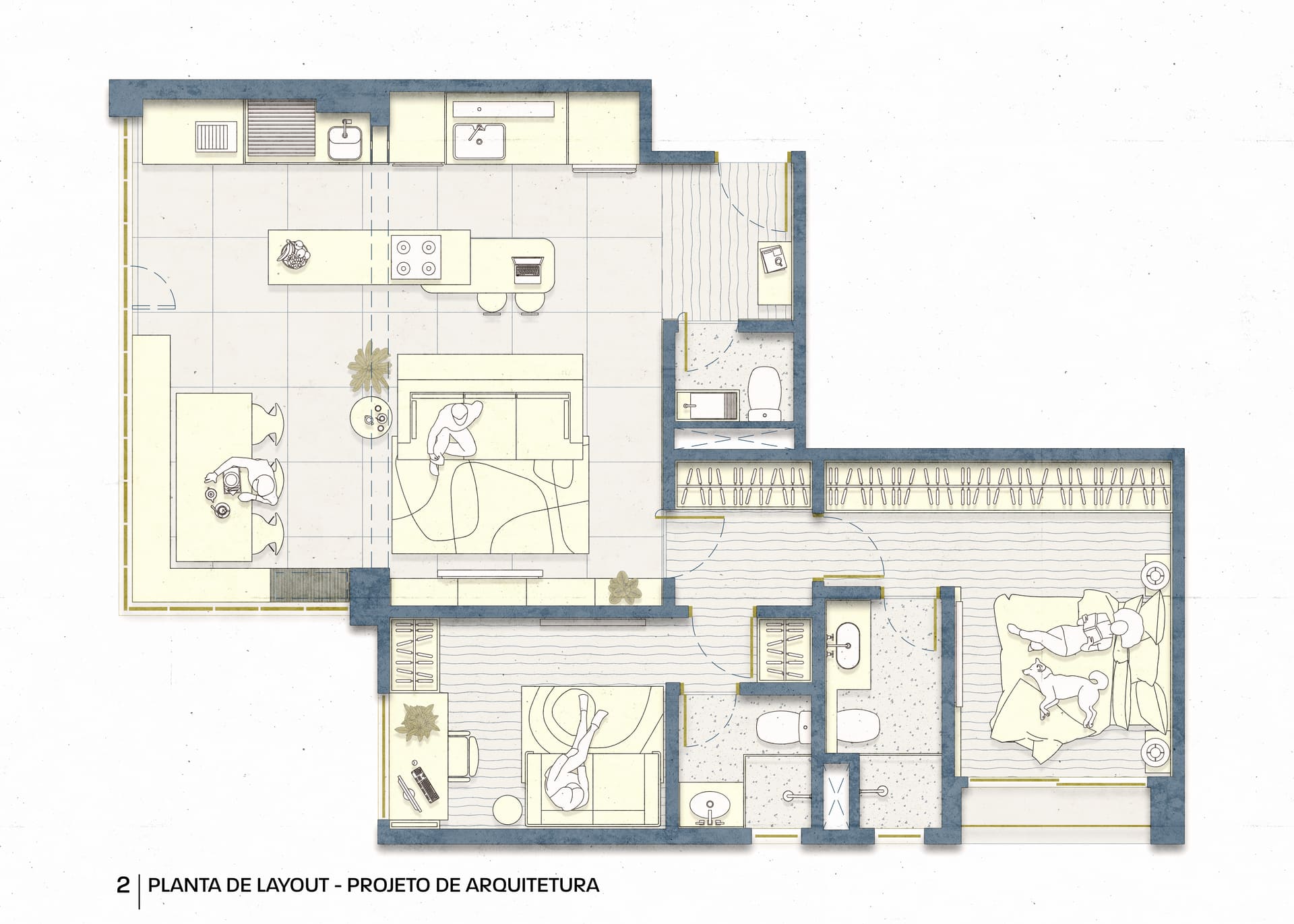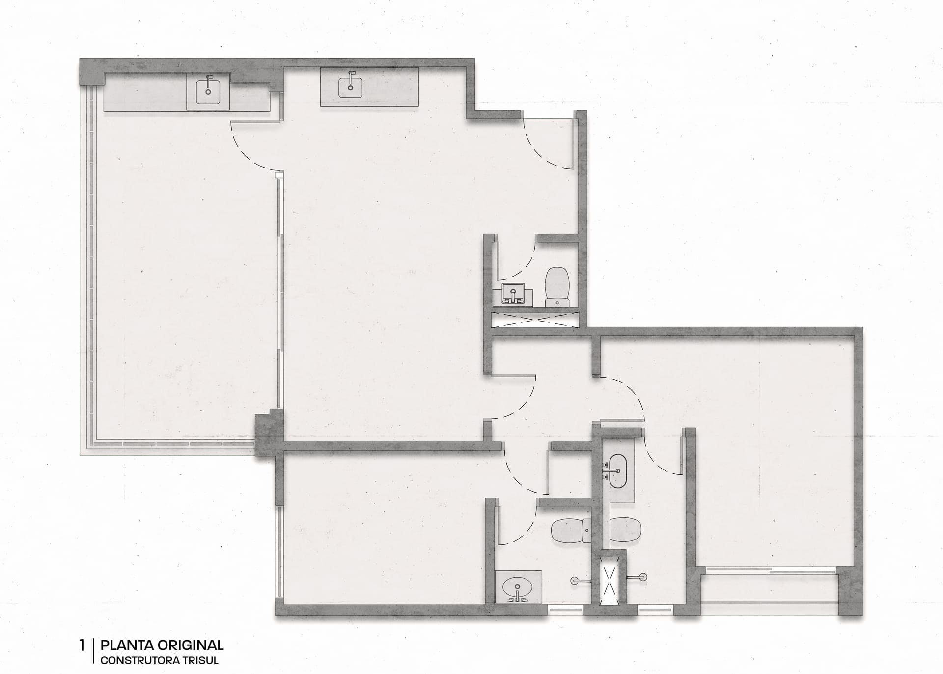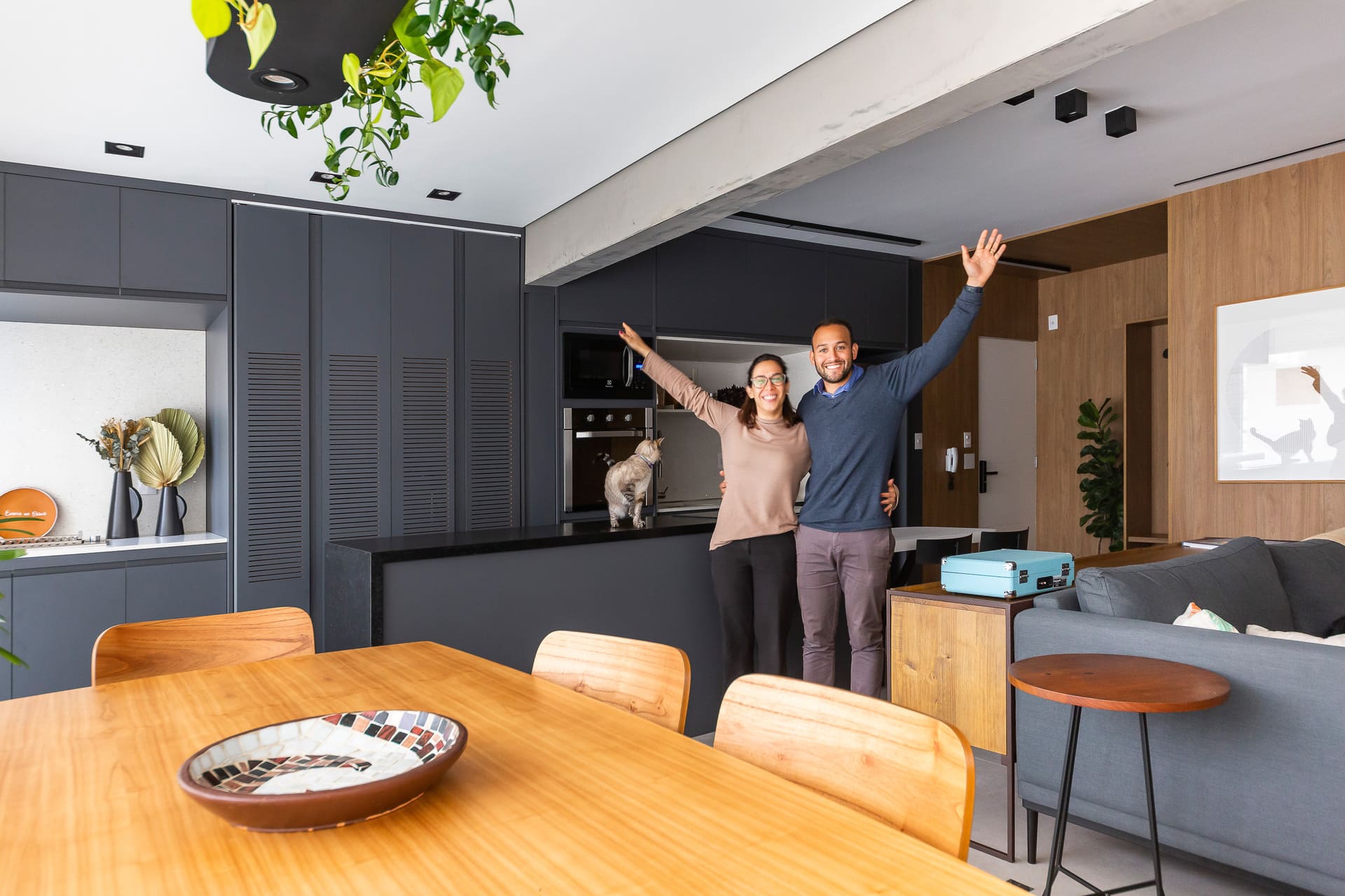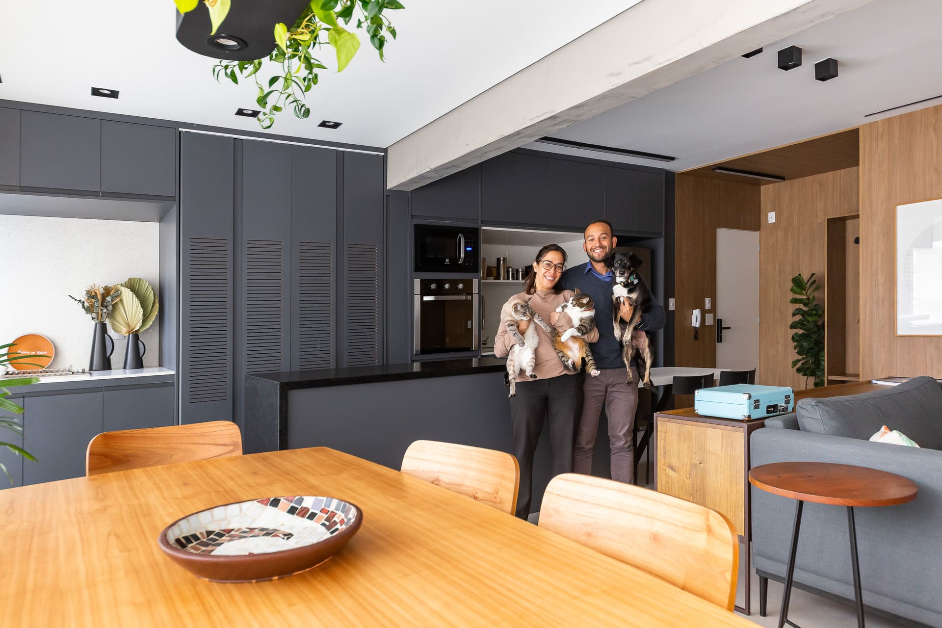 Um jovem casal de médicos veio para São Paulo para realizarem a residência e aqui se estabeleceram. Após 2 gatos e um cachorro compraram um apartamento na planta decididos a seguir carreira na capital paulista, identificados com sua dinâmica e suas oportunidades. O apartamento foi entregue pela construtora com uma planta cada vez mais usual no mercado: a cozinha sem separação com a sala e uma ampla varanda que invade o espaço social da residência. O pedido do jovem casal para o projeto de arquitetura foi simples: “um apartamento com a cara de São Paulo: minimalista nas cores e intenso nas sensações”.