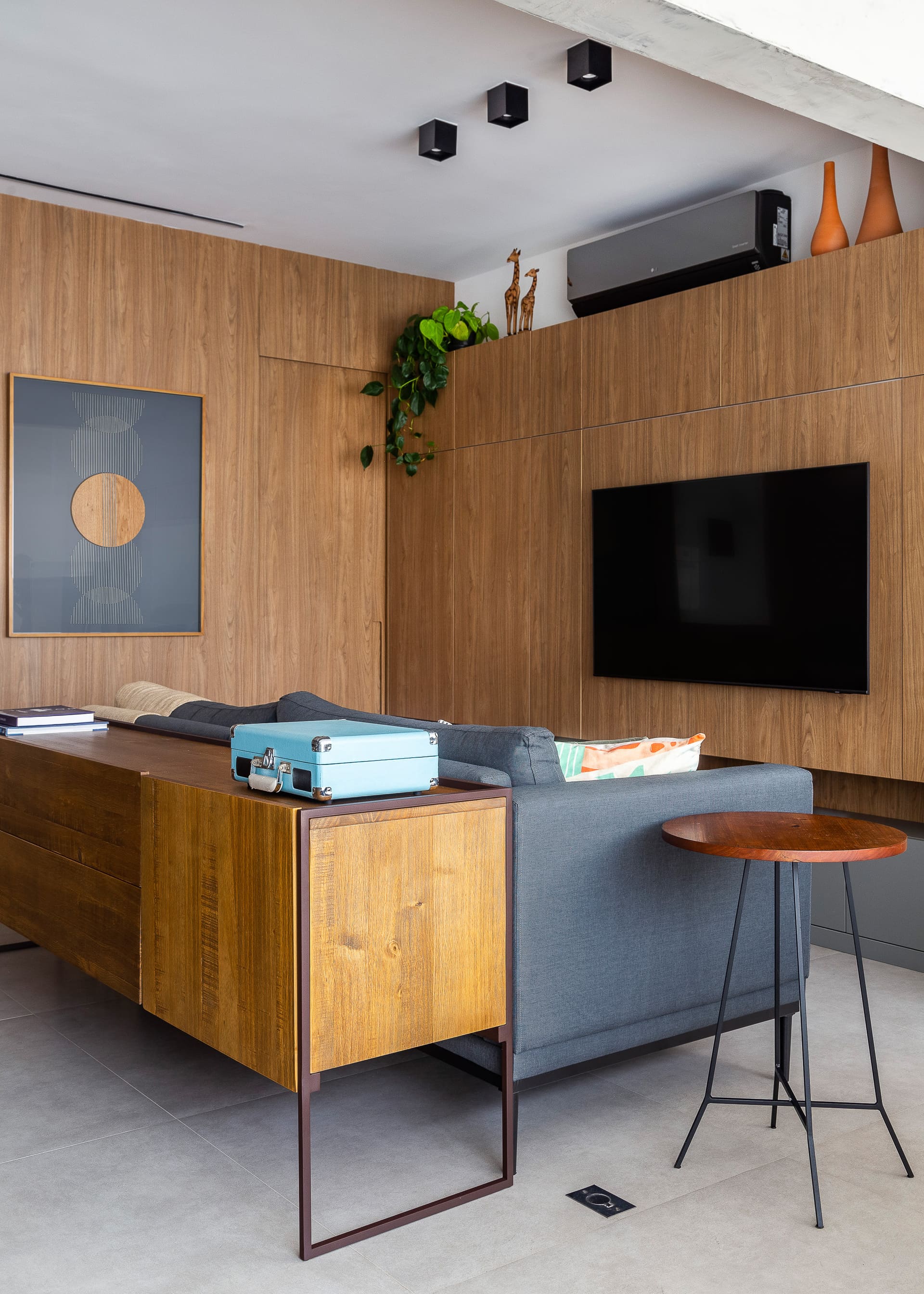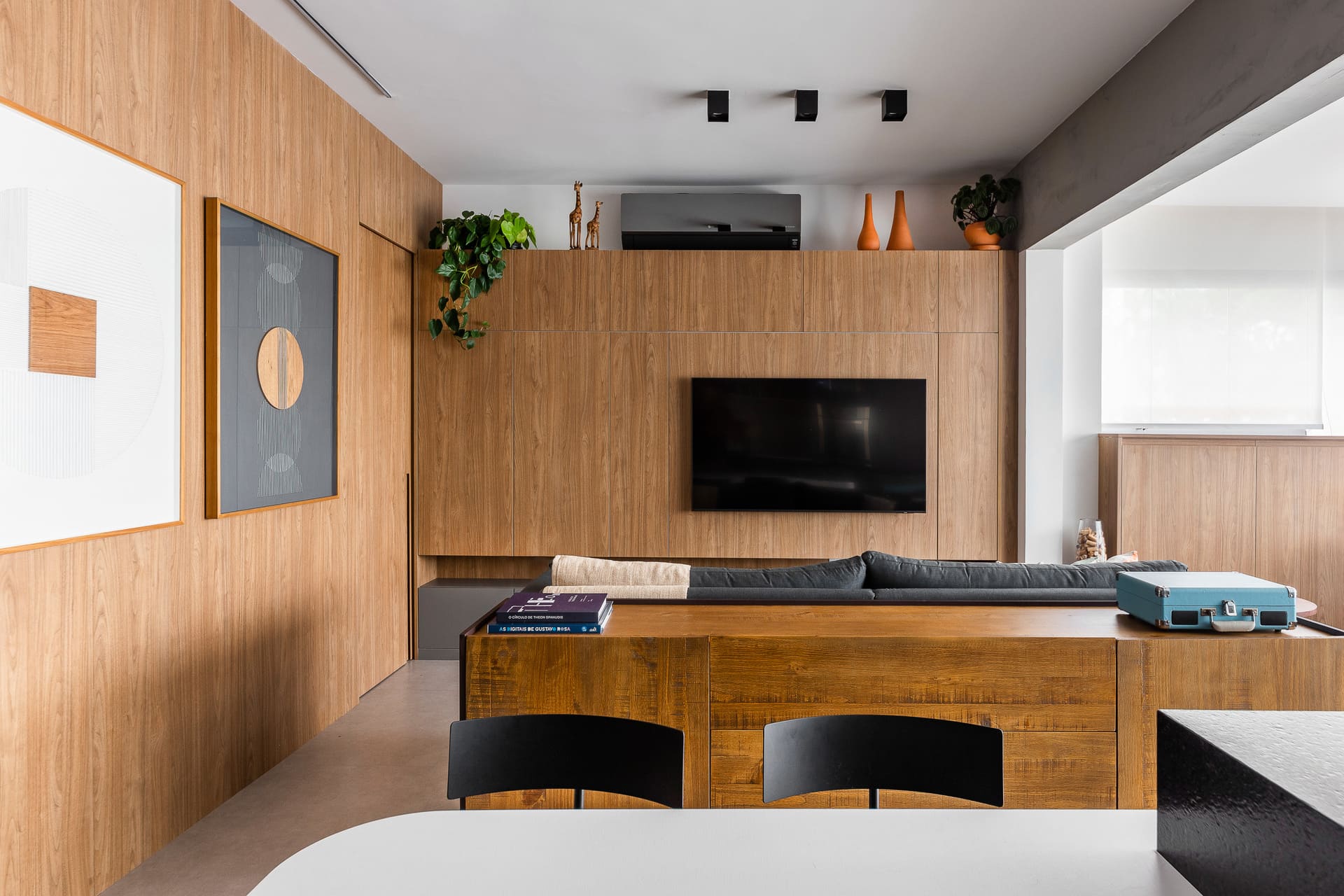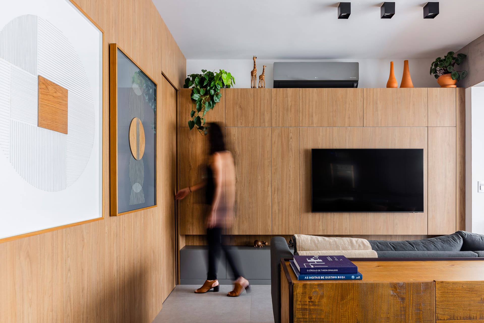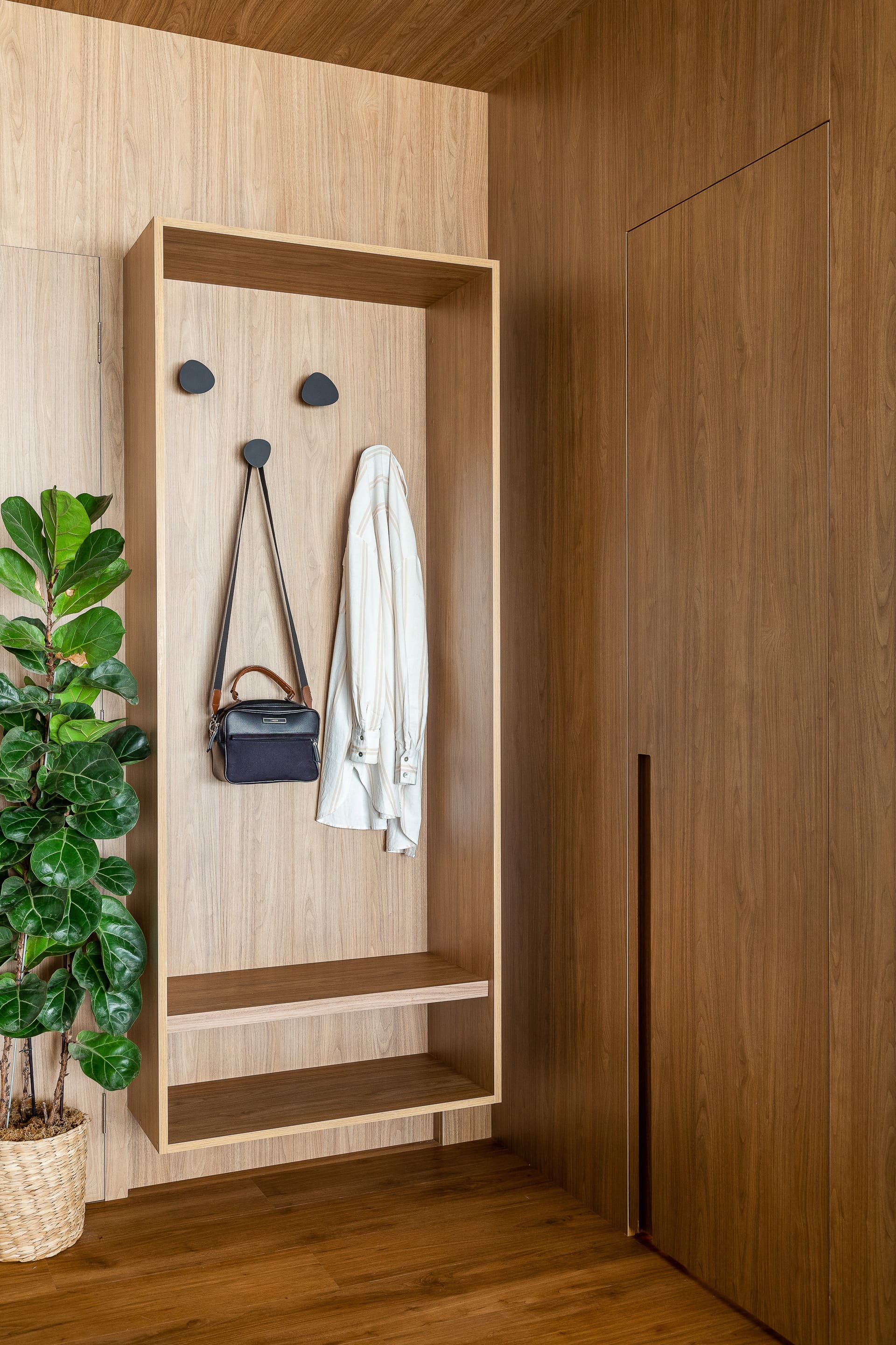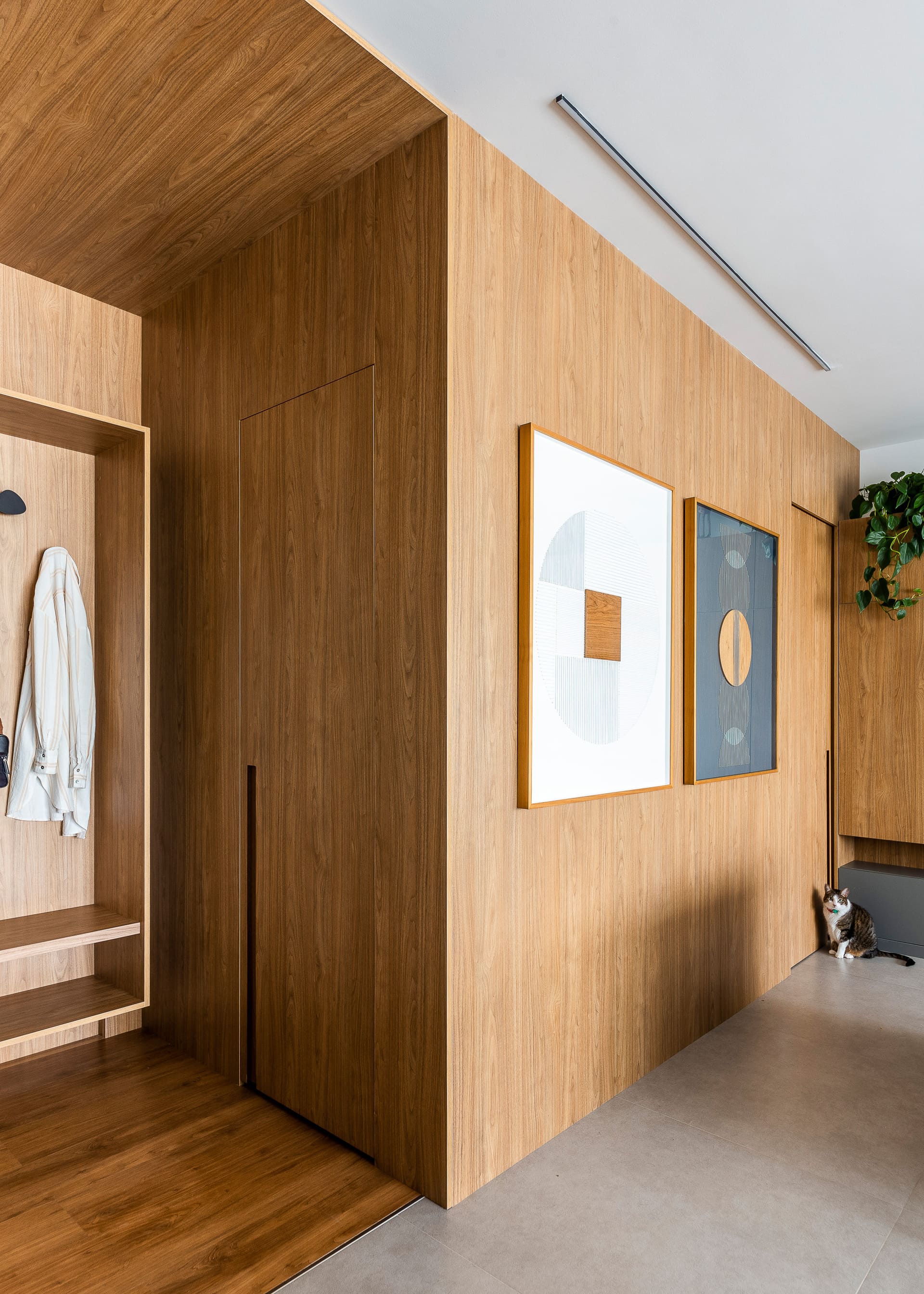 A madeira utilizada no banco e na mesa de jantar se espalham para o restante da sala, conformando o painel da televisão, e também contornando toda a entrada do apartamento e escondendo o lavabo. No hall de entrada esse painel de madeira se transforma em uma verdadeira caixa de madeira, ao criar um quadrado formando, paredes, piso e teto. O lavabo então, atrás dessa caixa de madeira vem de forma suave trazer a cor azul do granilite.