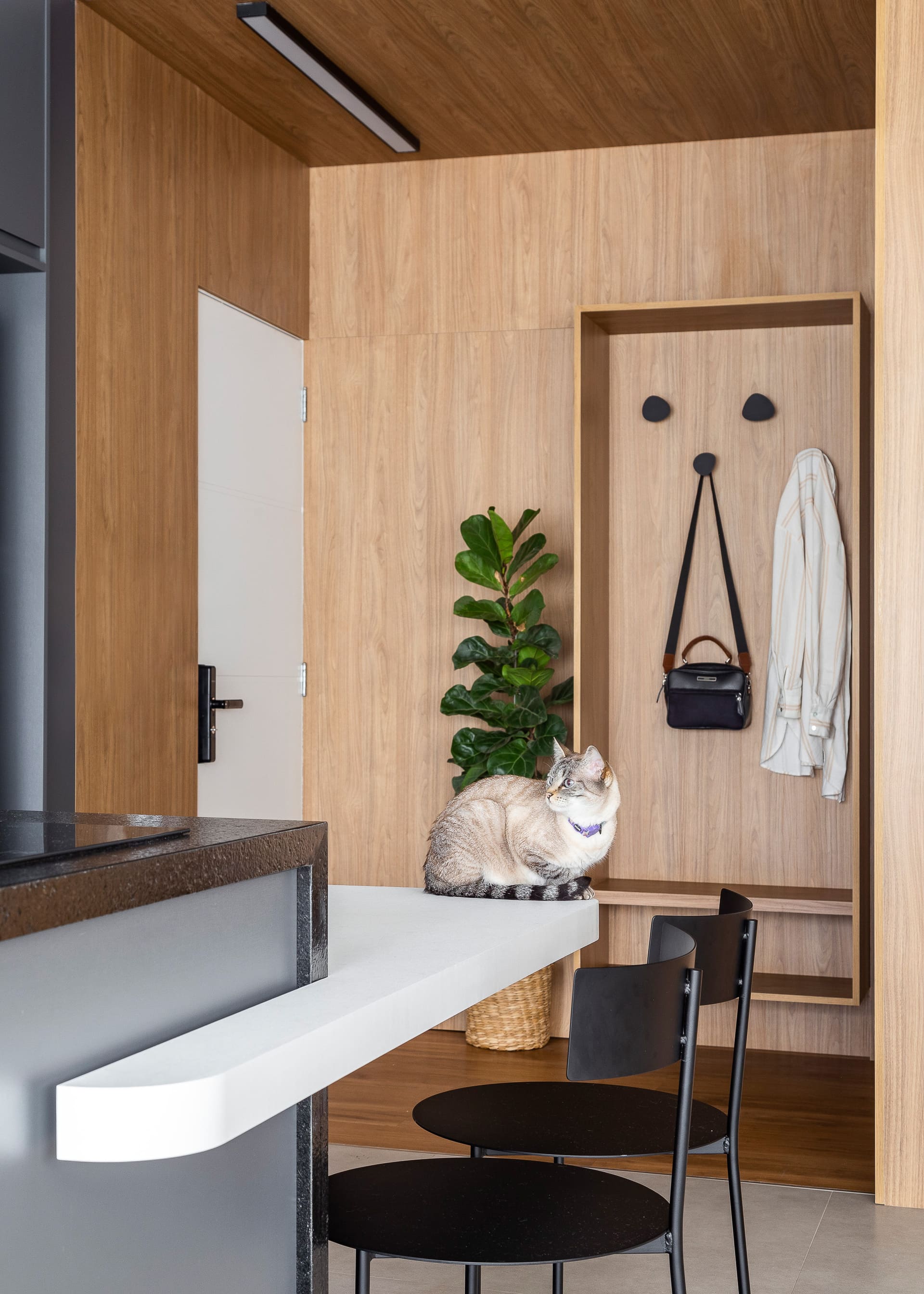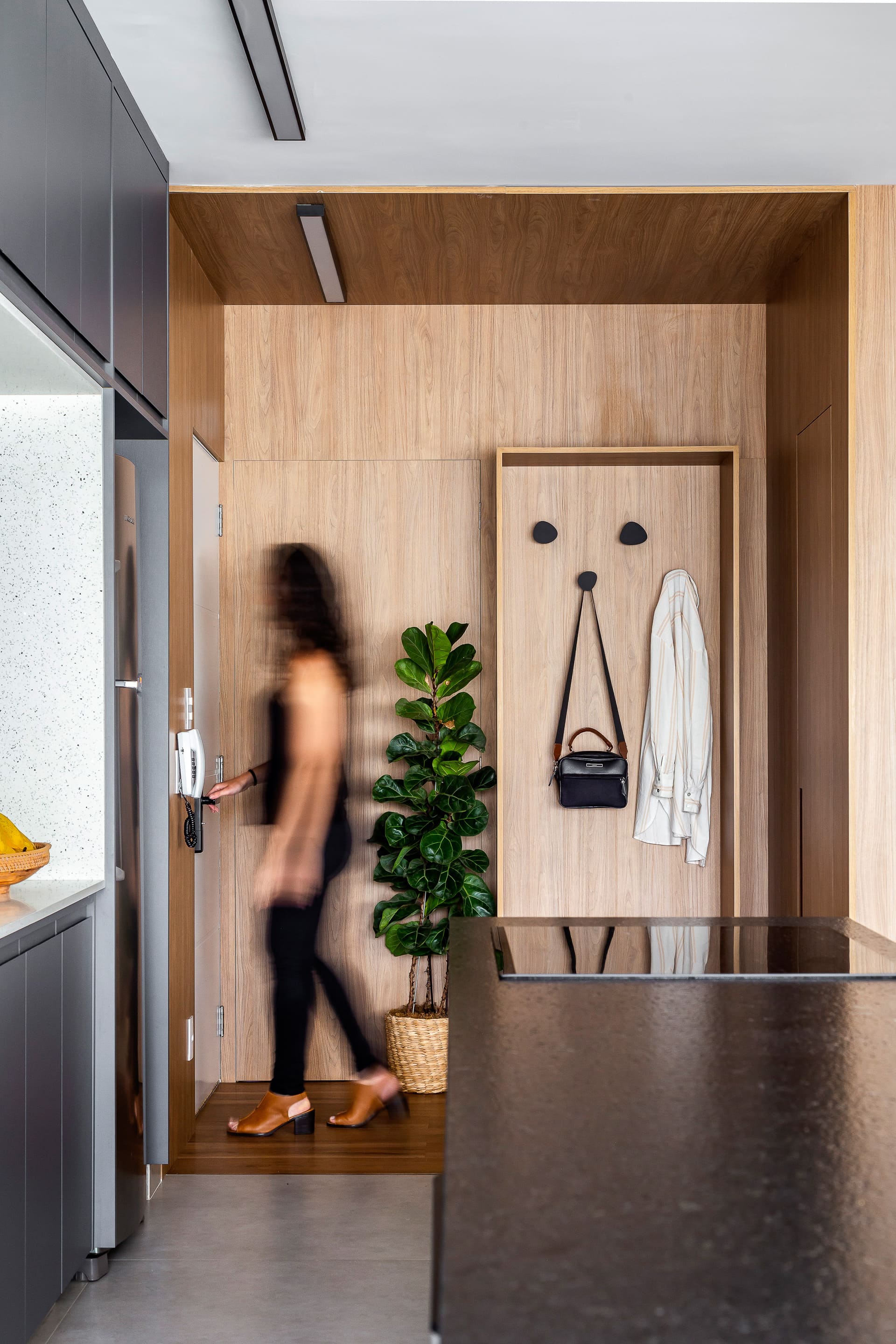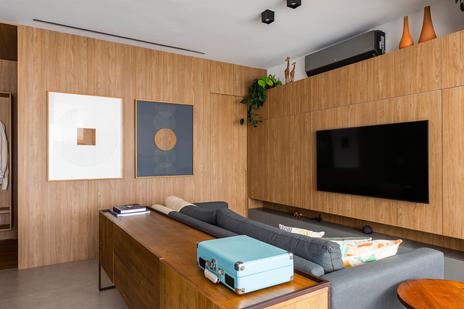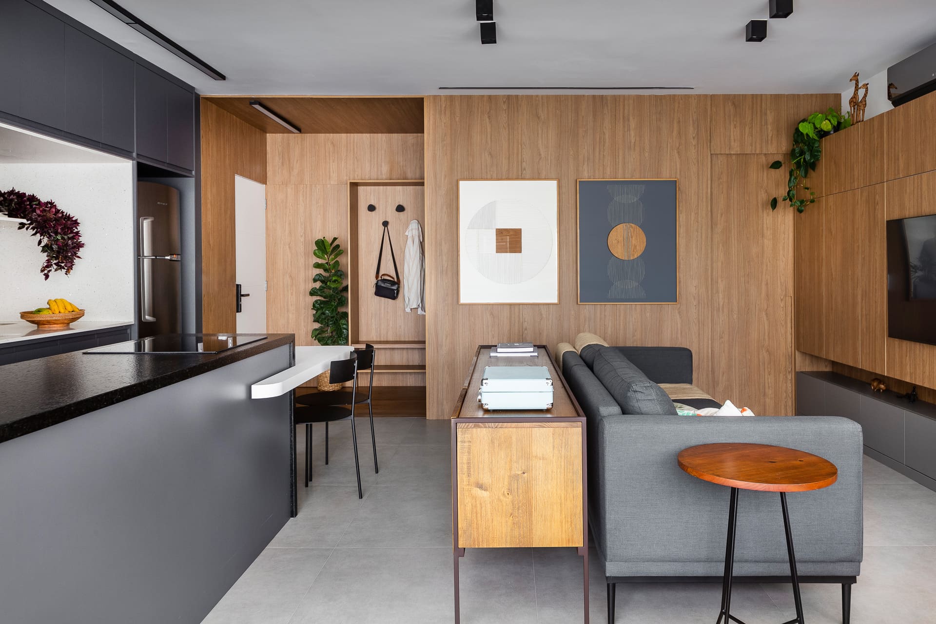 A madeira utilizada no banco e na mesa de jantar se espalham para o restante da sala, conformando o painel da televisão, e também contornando toda a entrada do apartamento e escondendo o lavabo. No hall de entrada esse painel de madeira se transforma em uma verdadeira caixa de madeira, ao criar um quadrado formando, paredes, piso e teto. O lavabo então, atrás dessa caixa de madeira vem de forma suave trazer a cor azul do granilite.