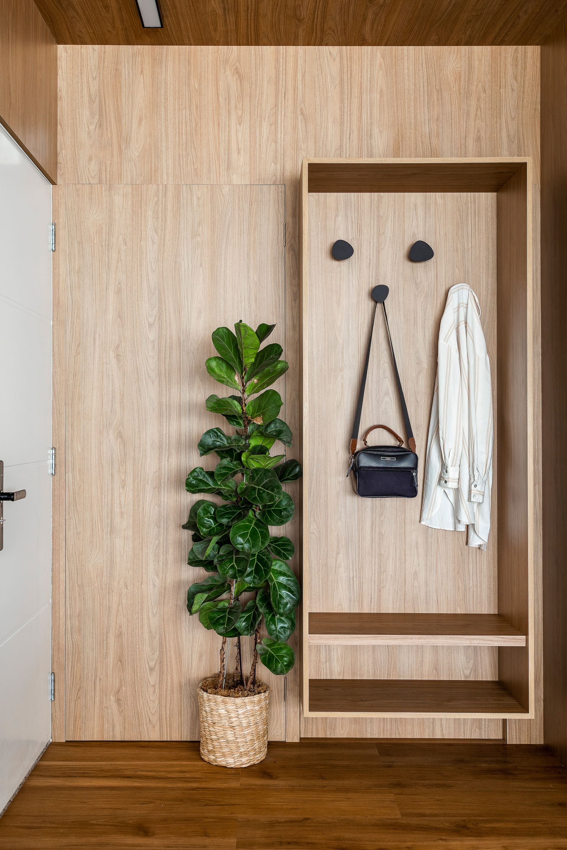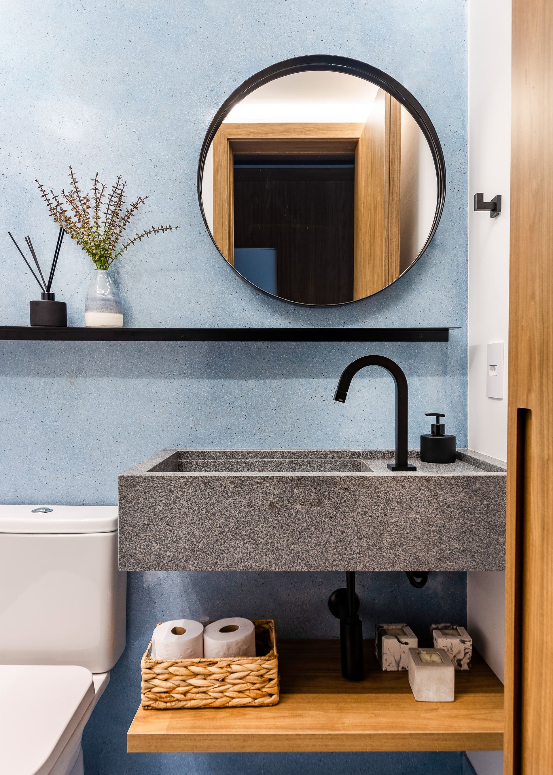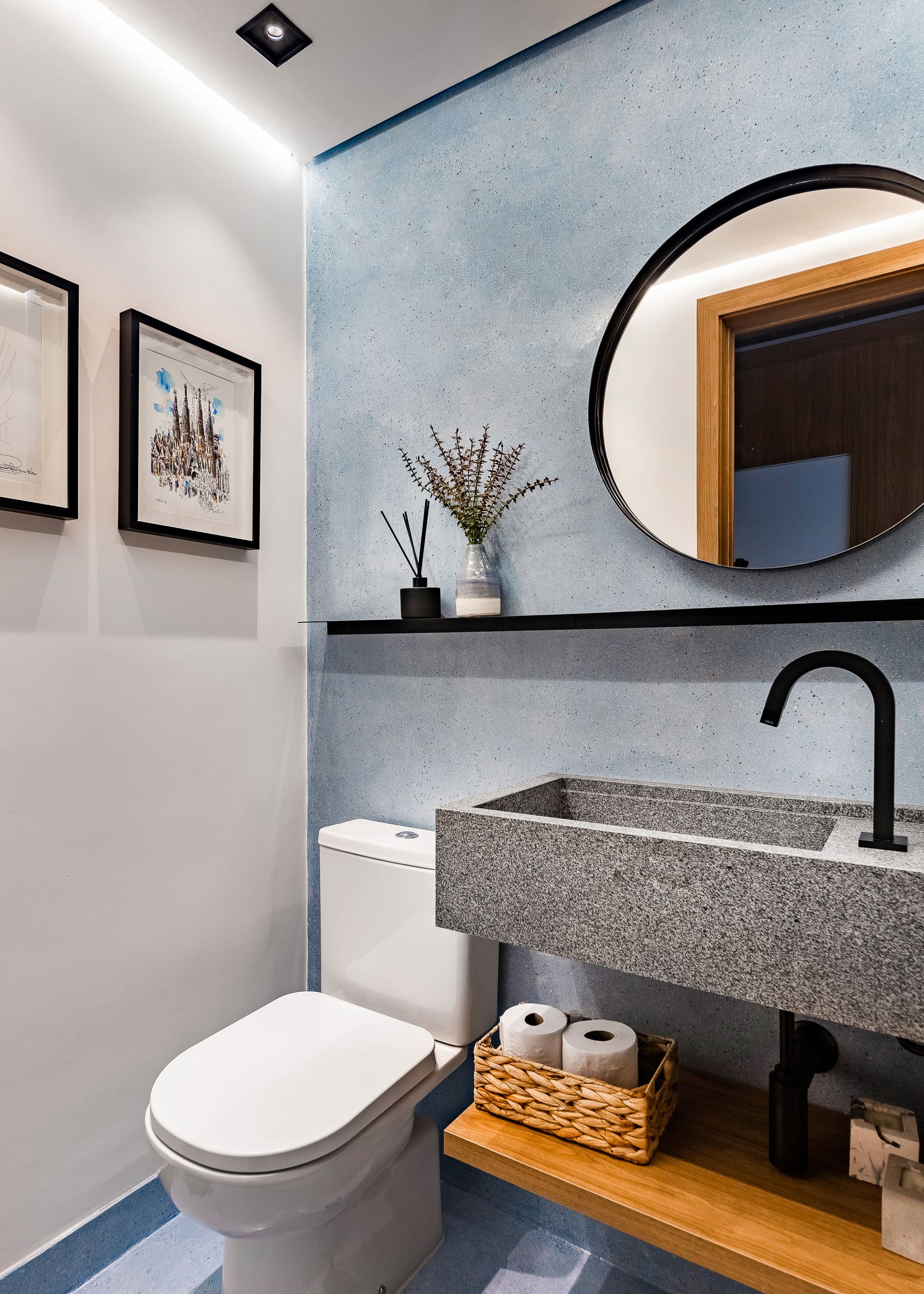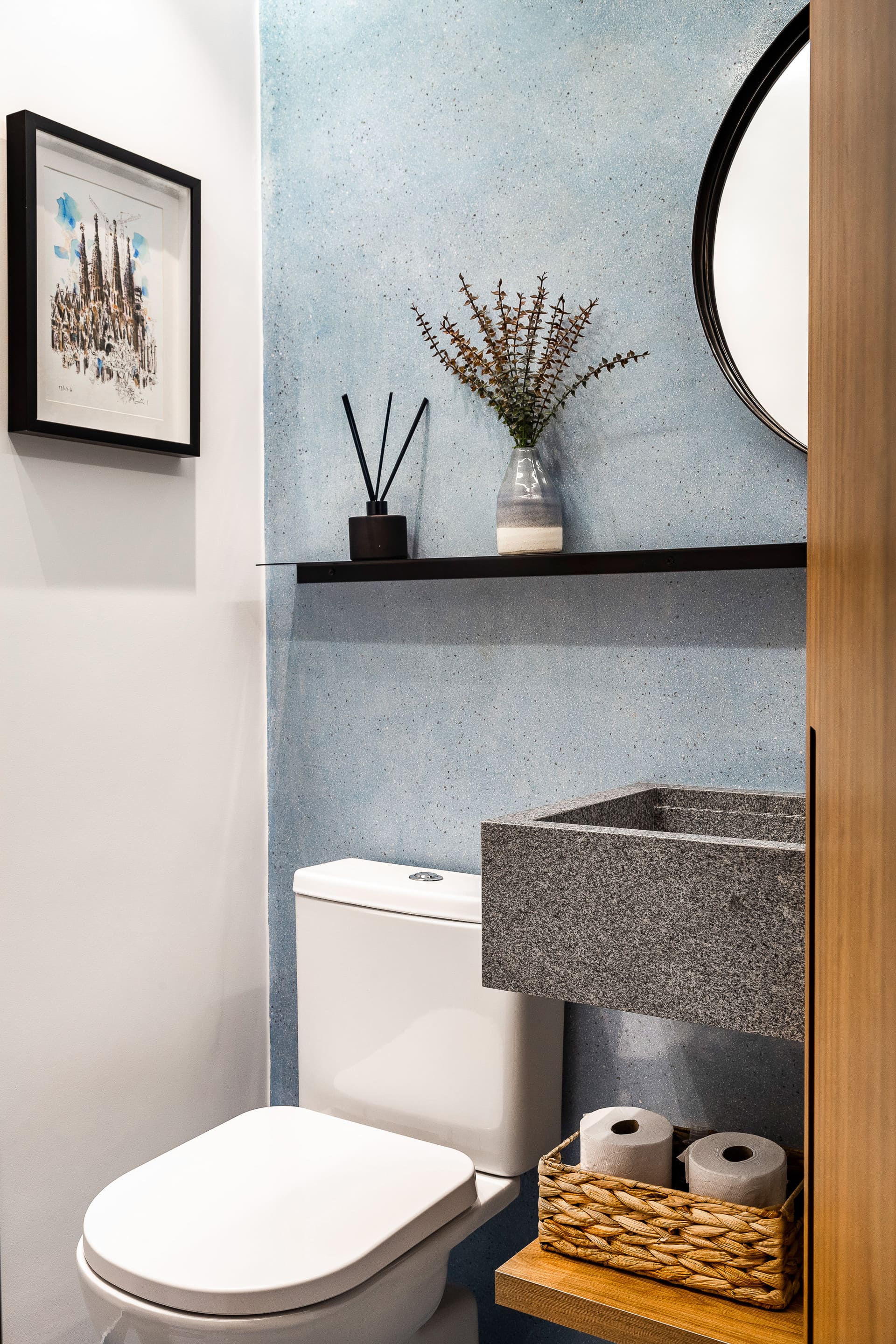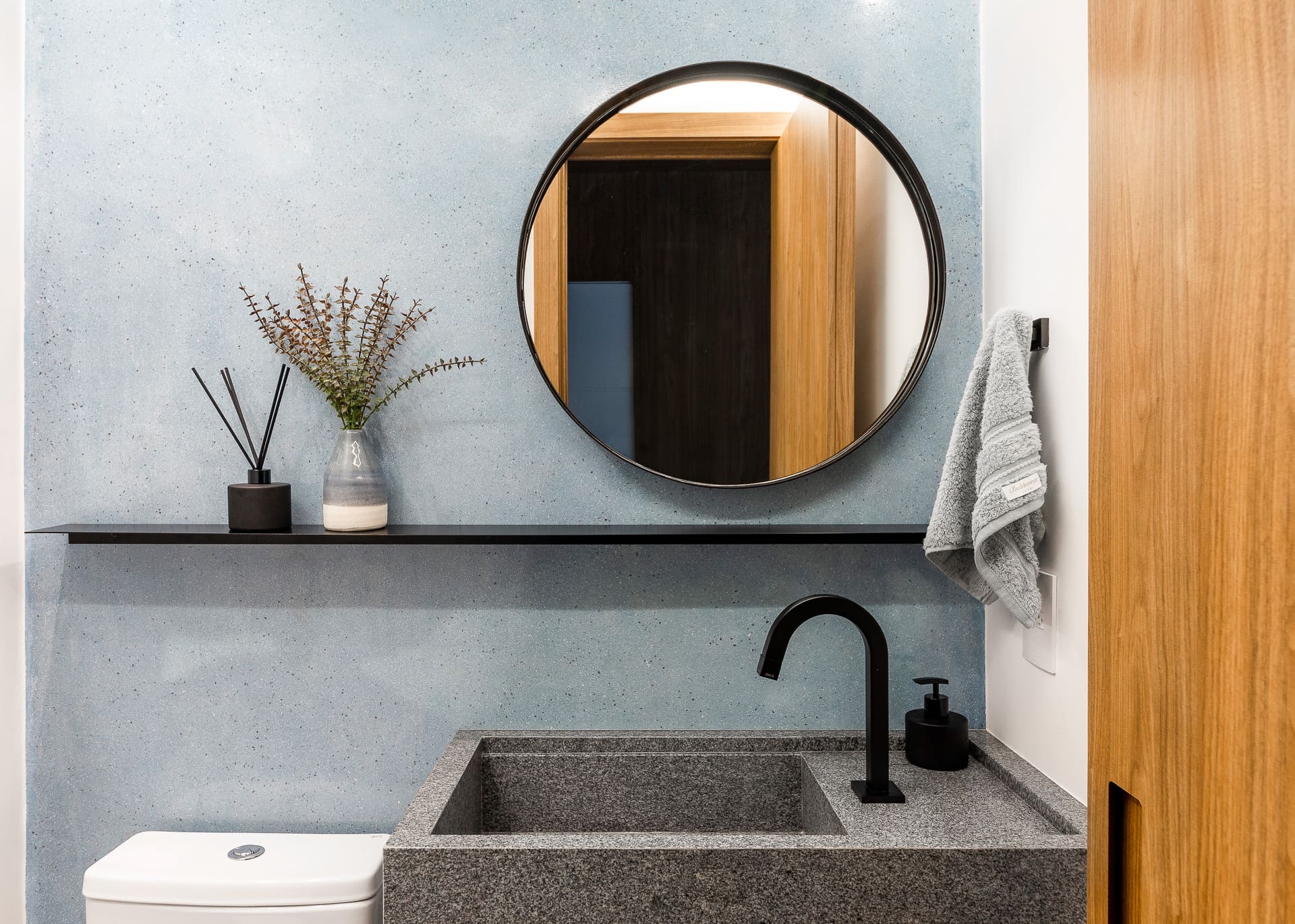 A madeira utilizada no banco e na mesa de jantar se espalham para o restante da sala, conformando o painel da televisão, e também contornando toda a entrada do apartamento e escondendo o lavabo. No hall de entrada esse painel de madeira se transforma em uma verdadeira caixa de madeira, ao criar um quadrado formando, paredes, piso e teto. O lavabo então, atrás dessa caixa de madeira vem de forma suave trazer a cor azul do granilite.