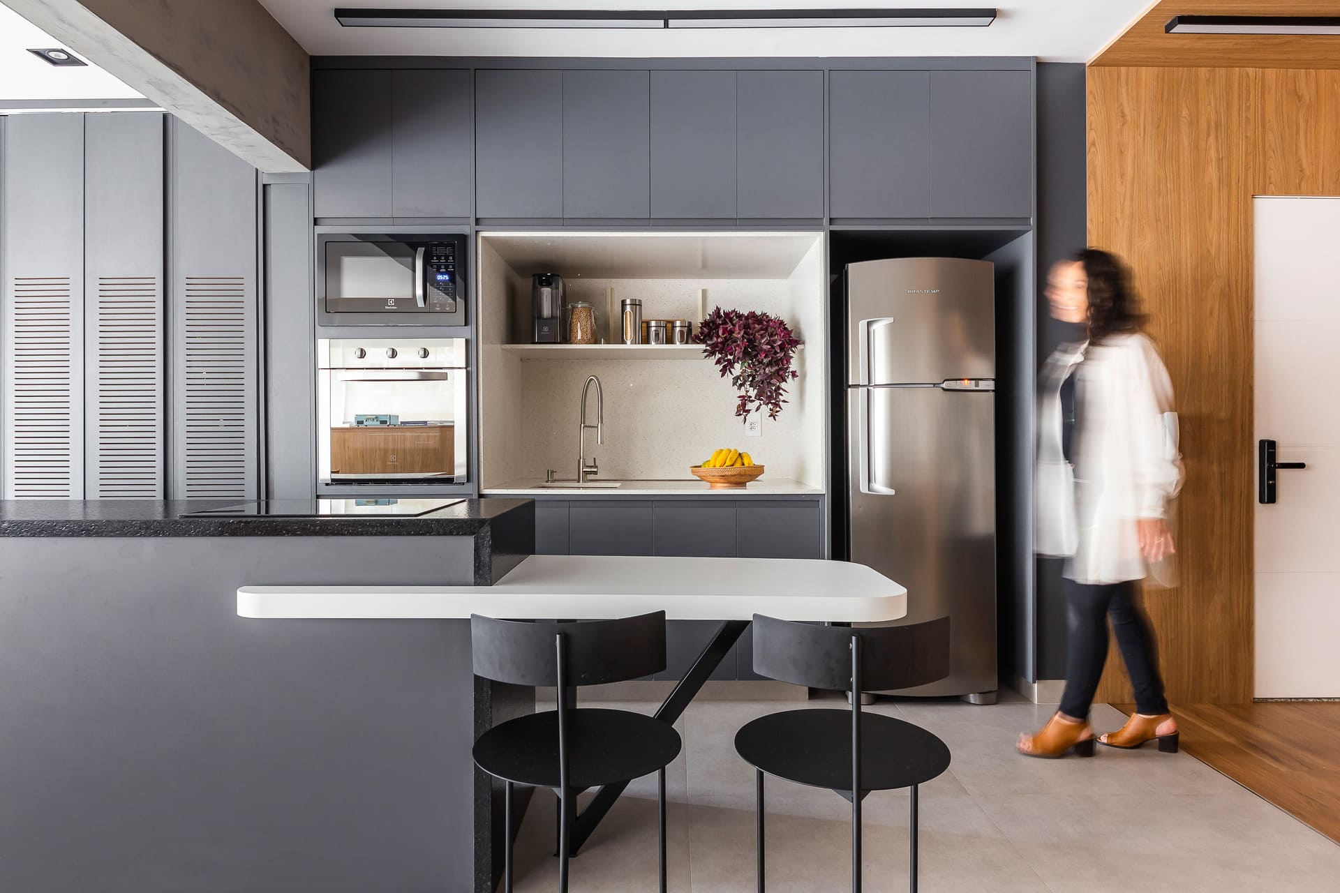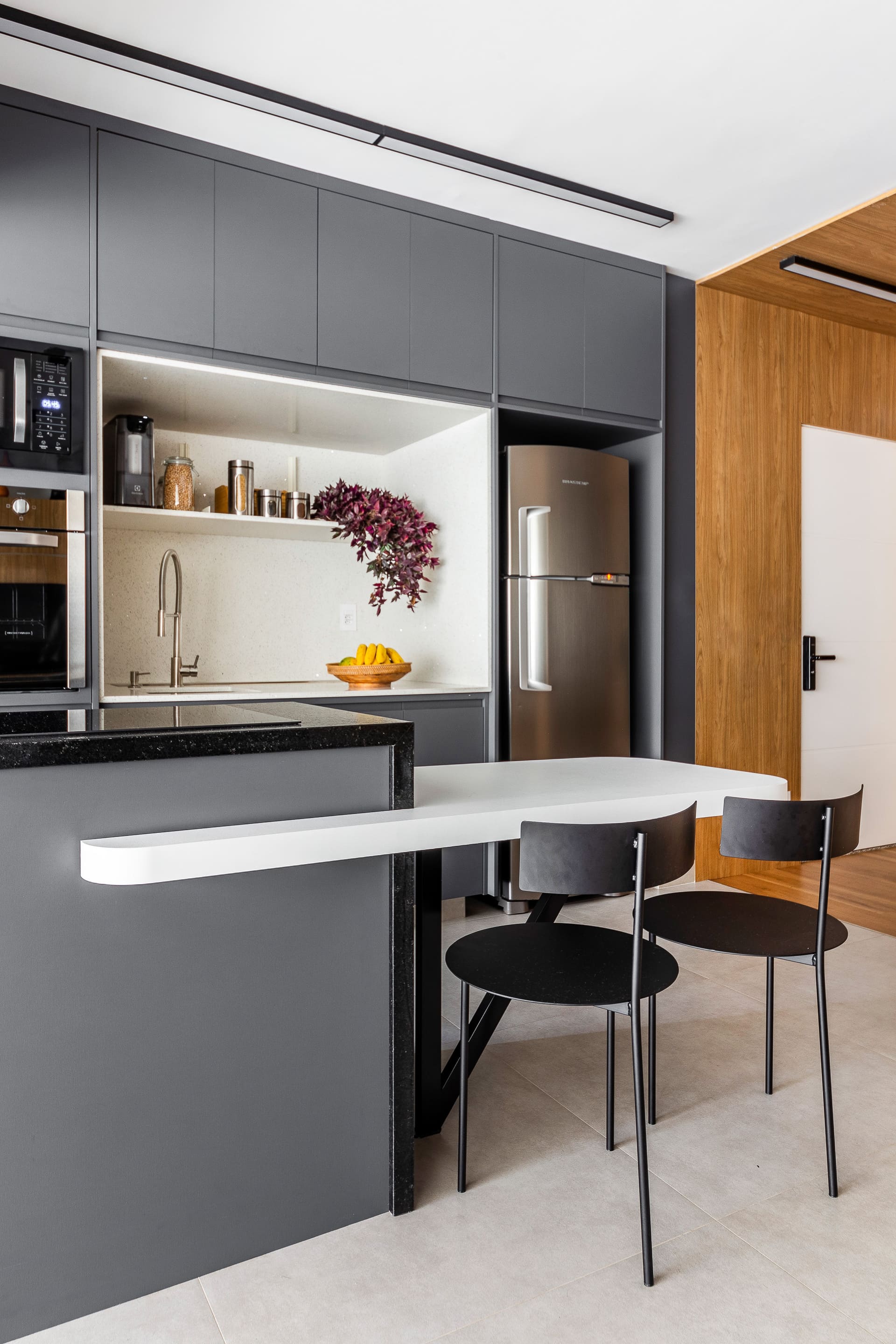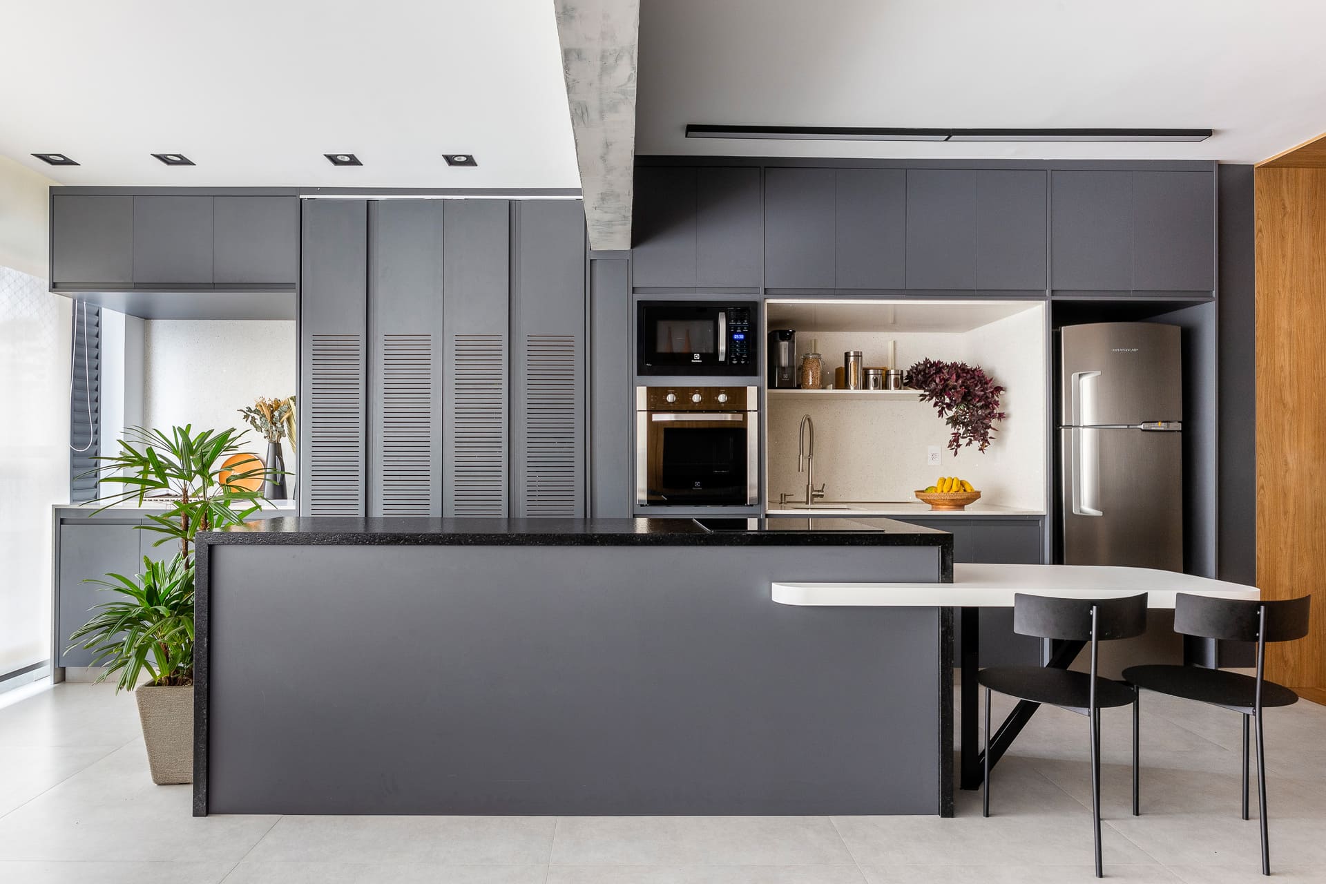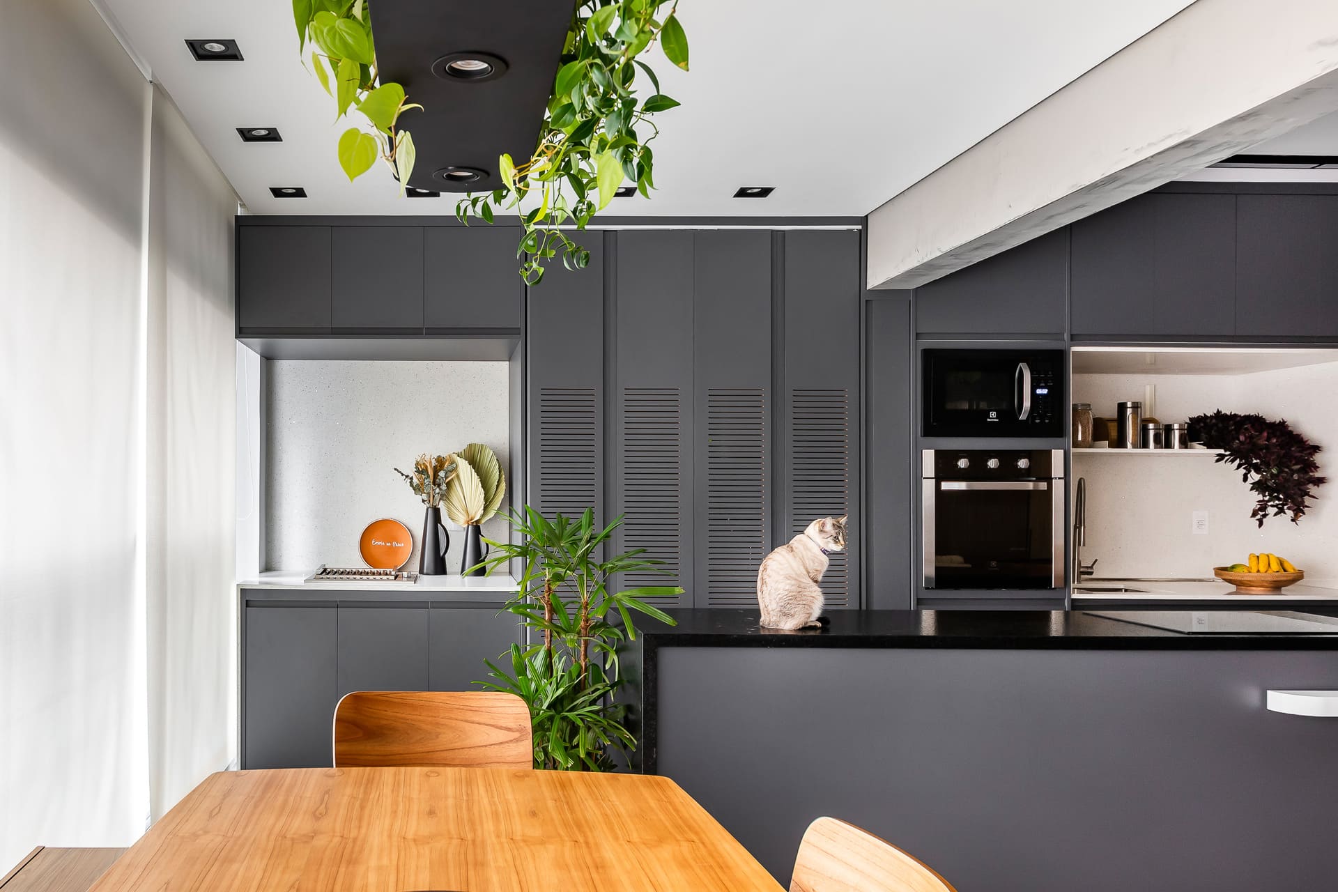 O projeto então estabeleceu uma cor como base: o cinza grafite e para contrastar e trazer um elemento quente a madeira fez o par perfeito com o grafite. Em complementação a esse par de grafite e madeira temos o preto e o branco e claro o verde vibrante da vegetação escolhida. O grafite e a madeira permeiam toda o desenho de marcenaria, que vai do teto (na área do hall de entrada), passando pelas portas dos armários e portas dos ambientes, até o banco da varanda e o piso dos dormitórios. O desenho de marcenaria da cozinha e lavanderia foi cuidadosamente pensado para “mostrar-esconder” todas as instalações necessárias nessas duas áreas. Formando um único pano em uma das laterais da sala-varanda, a cozinha e lavanderia se camuflam entre a decoração, mostrando somente o que é necessário. A ilha preta com a mesa branca auxiliar complementam o apoio a essas áreas, com a instalação do cooktop de indução e da adega, além de mais espaço de armazenamento.