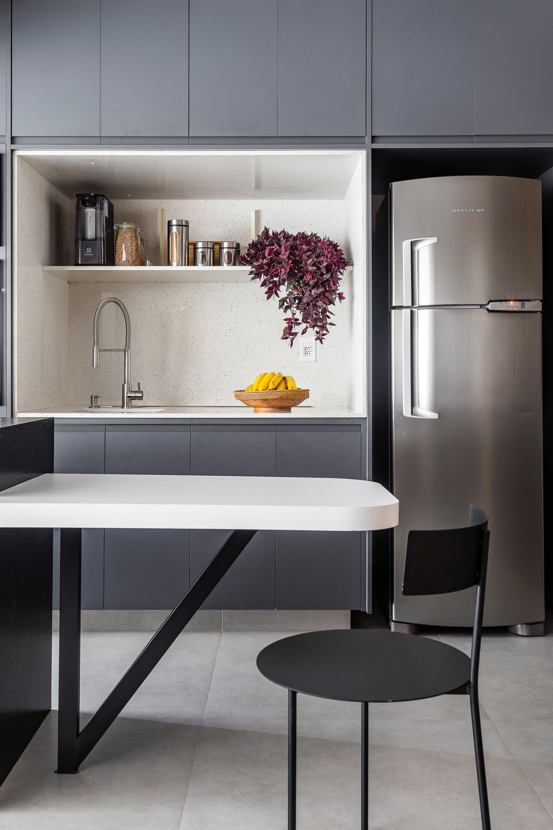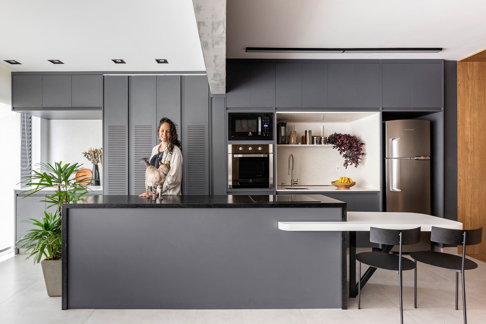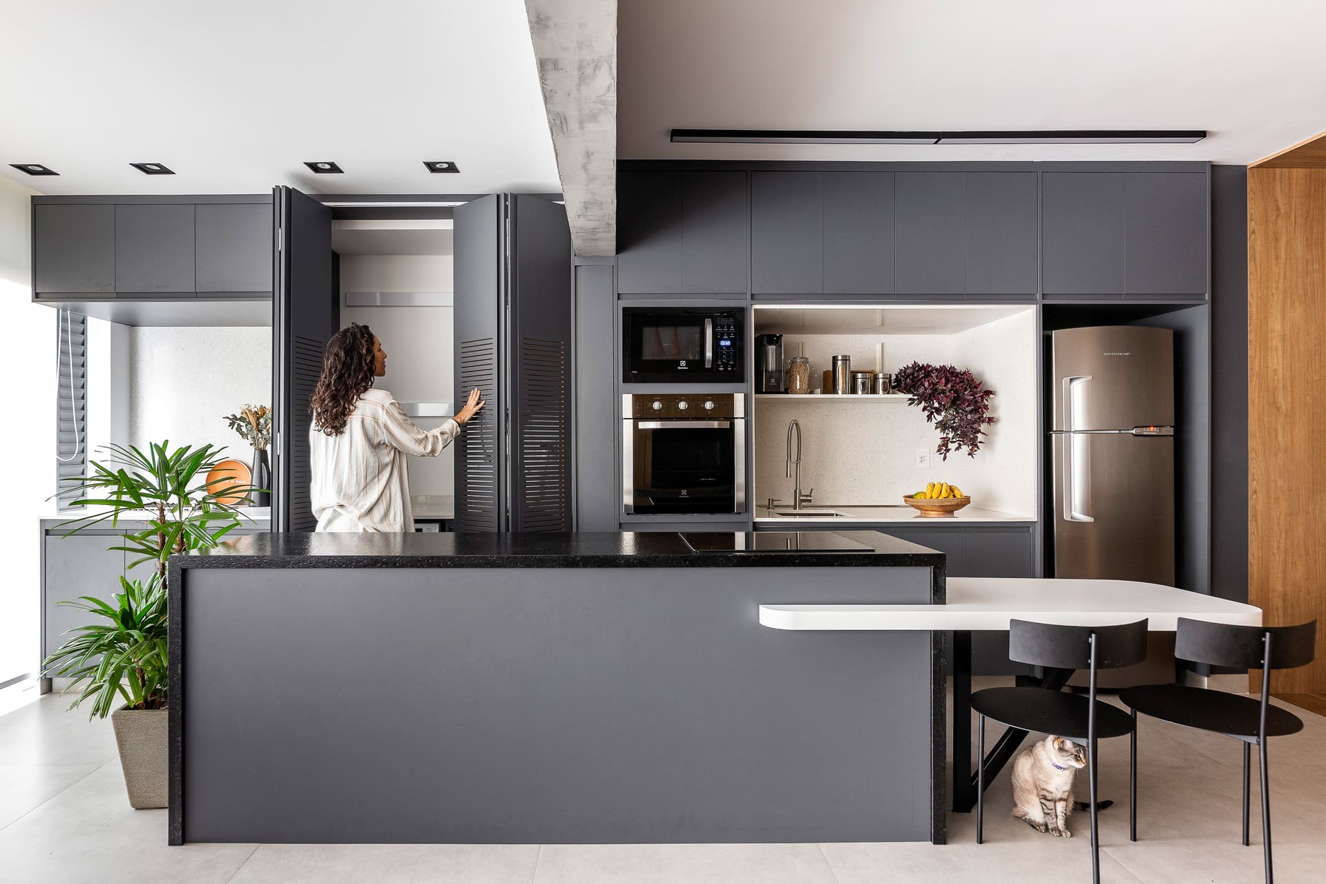 O projeto então estabeleceu uma cor como base: o cinza grafite e para contrastar e trazer um elemento quente a madeira fez o par perfeito com o grafite. Em complementação a esse par de grafite e madeira temos o preto e o branco e claro o verde vibrante da vegetação escolhida. O grafite e a madeira permeiam toda o desenho de marcenaria, que vai do teto (na área do hall de entrada), passando pelas portas dos armários e portas dos ambientes, até o banco da varanda e o piso dos dormitórios. O desenho de marcenaria da cozinha e lavanderia foi cuidadosamente pensado para “mostrar-esconder” todas as instalações necessárias nessas duas áreas. Formando um único pano em uma das laterais da sala-varanda, a cozinha e lavanderia se camuflam entre a decoração, mostrando somente o que é necessário. A ilha preta com a mesa branca auxiliar complementam o apoio a essas áreas, com a instalação do cooktop de indução e da adega, além de mais espaço de armazenamento.