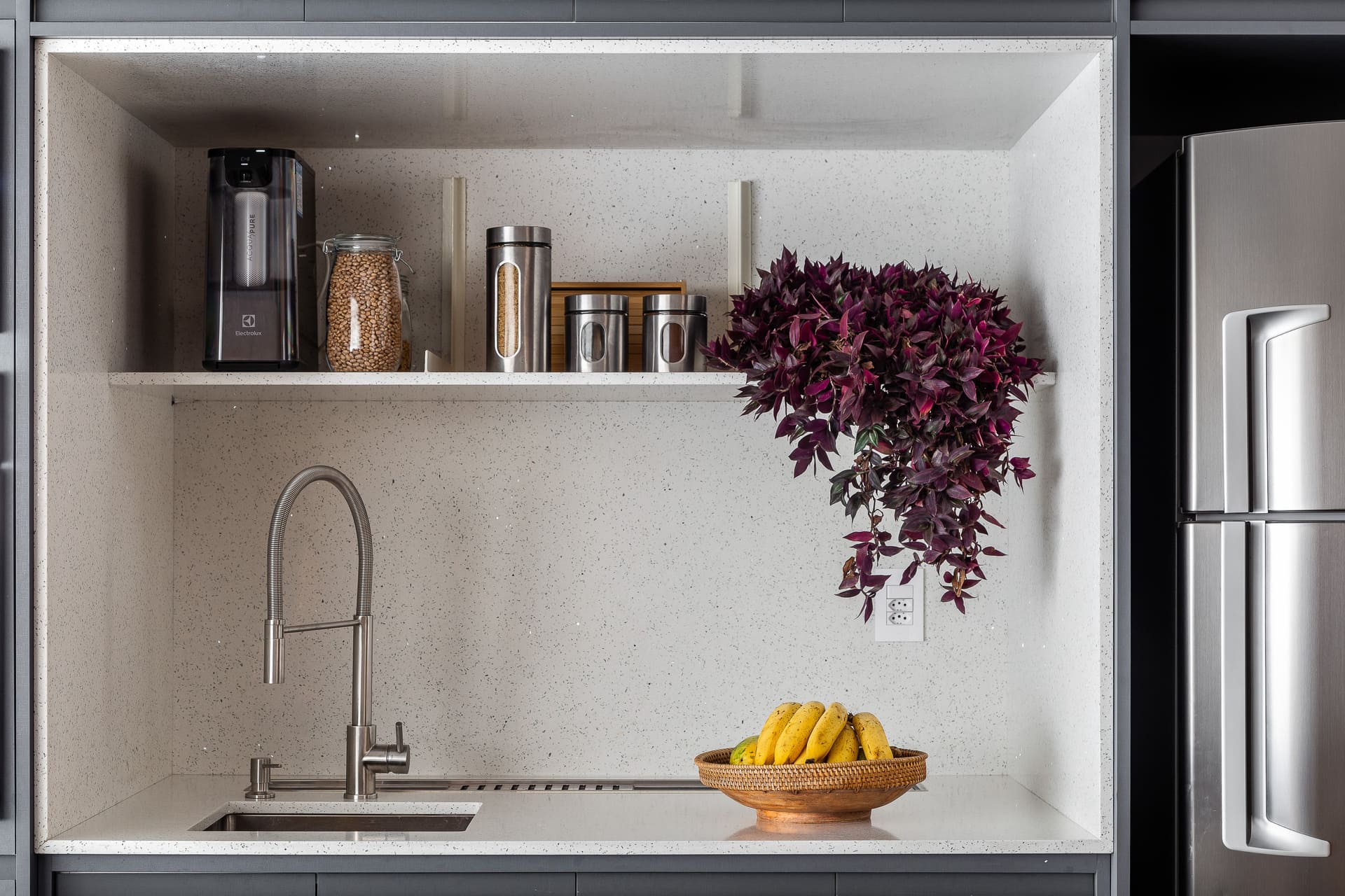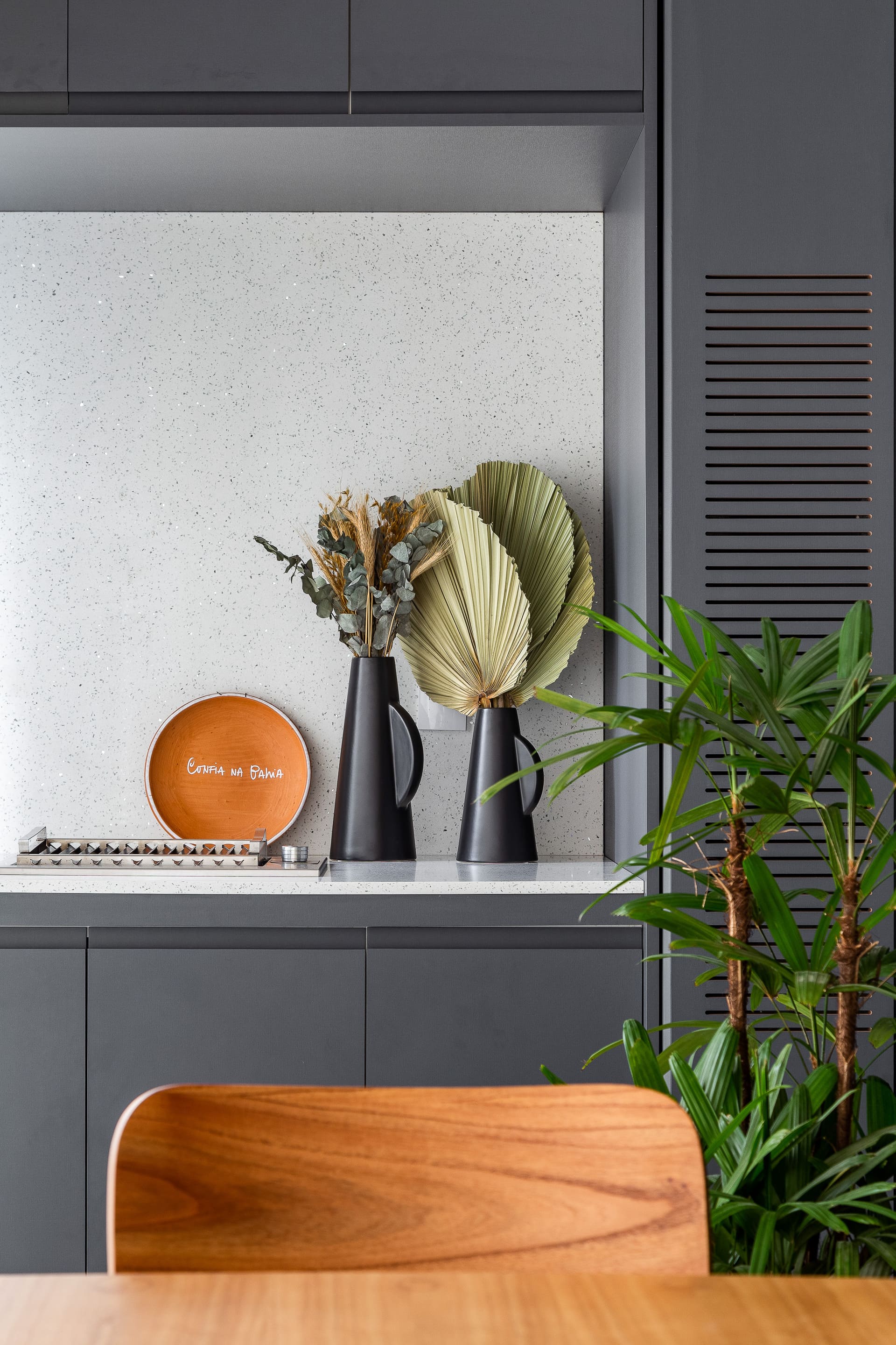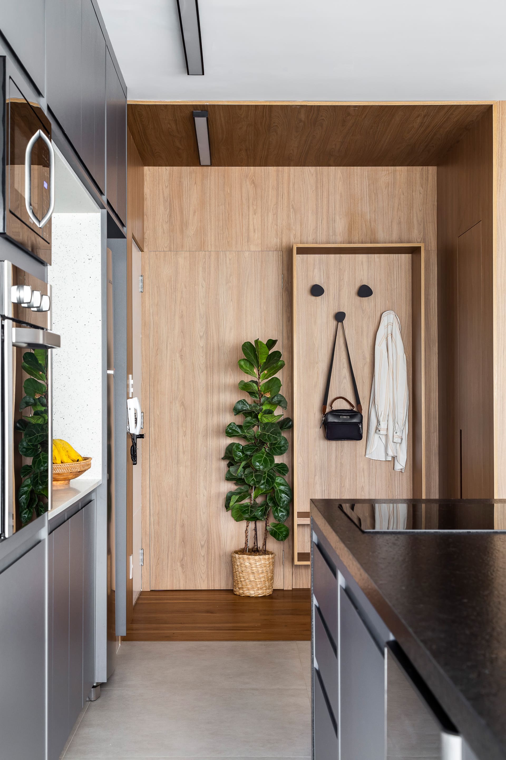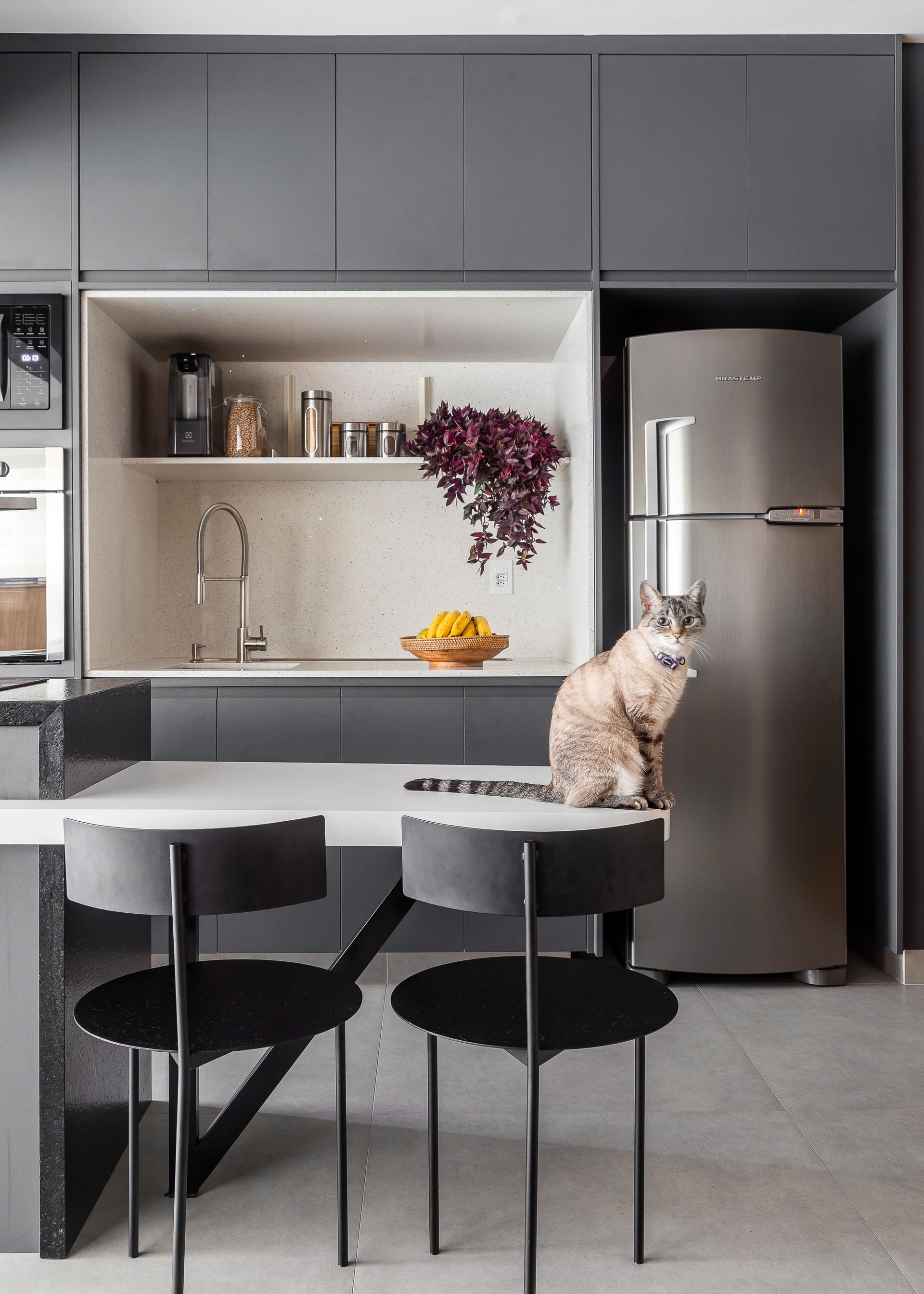 O projeto então estabeleceu uma cor como base: o cinza grafite e para contrastar e trazer um elemento quente a madeira fez o par perfeito com o grafite. Em complementação a esse par de grafite e madeira temos o preto e o branco e claro o verde vibrante da vegetação escolhida. O grafite e a madeira permeiam toda o desenho de marcenaria, que vai do teto (na área do hall de entrada), passando pelas portas dos armários e portas dos ambientes, até o banco da varanda e o piso dos dormitórios. O desenho de marcenaria da cozinha e lavanderia foi cuidadosamente pensado para “mostrar-esconder” todas as instalações necessárias nessas duas áreas. Formando um único pano em uma das laterais da sala-varanda, a cozinha e lavanderia se camuflam entre a decoração, mostrando somente o que é necessário. A ilha preta com a mesa branca auxiliar complementam o apoio a essas áreas, com a instalação do cooktop de indução e da adega, além de mais espaço de armazenamento.