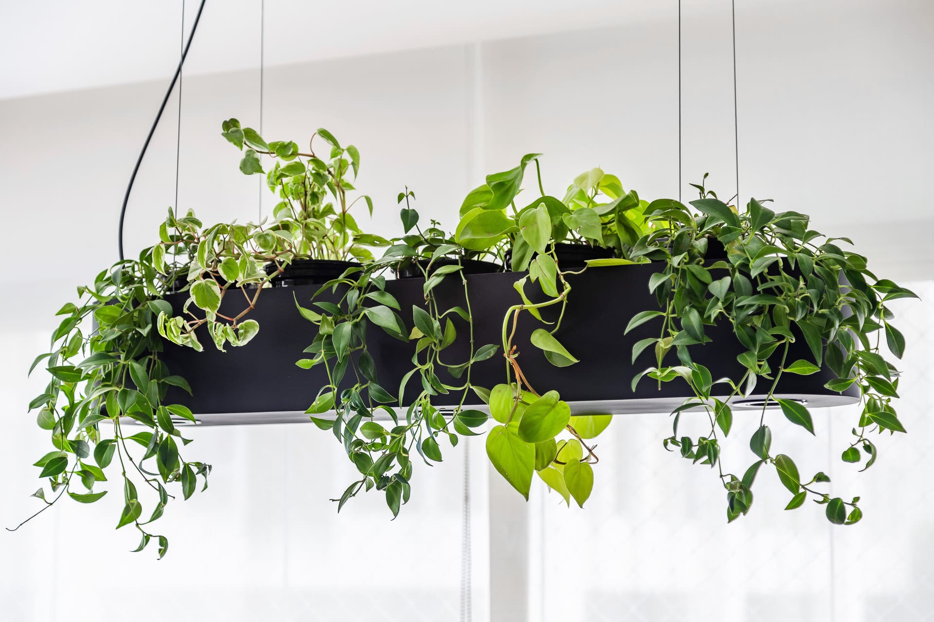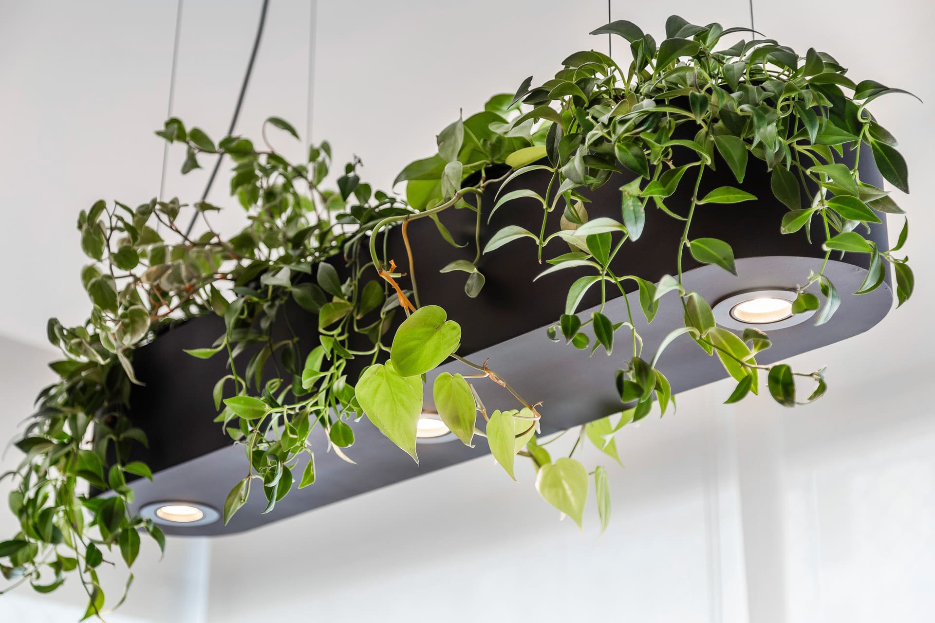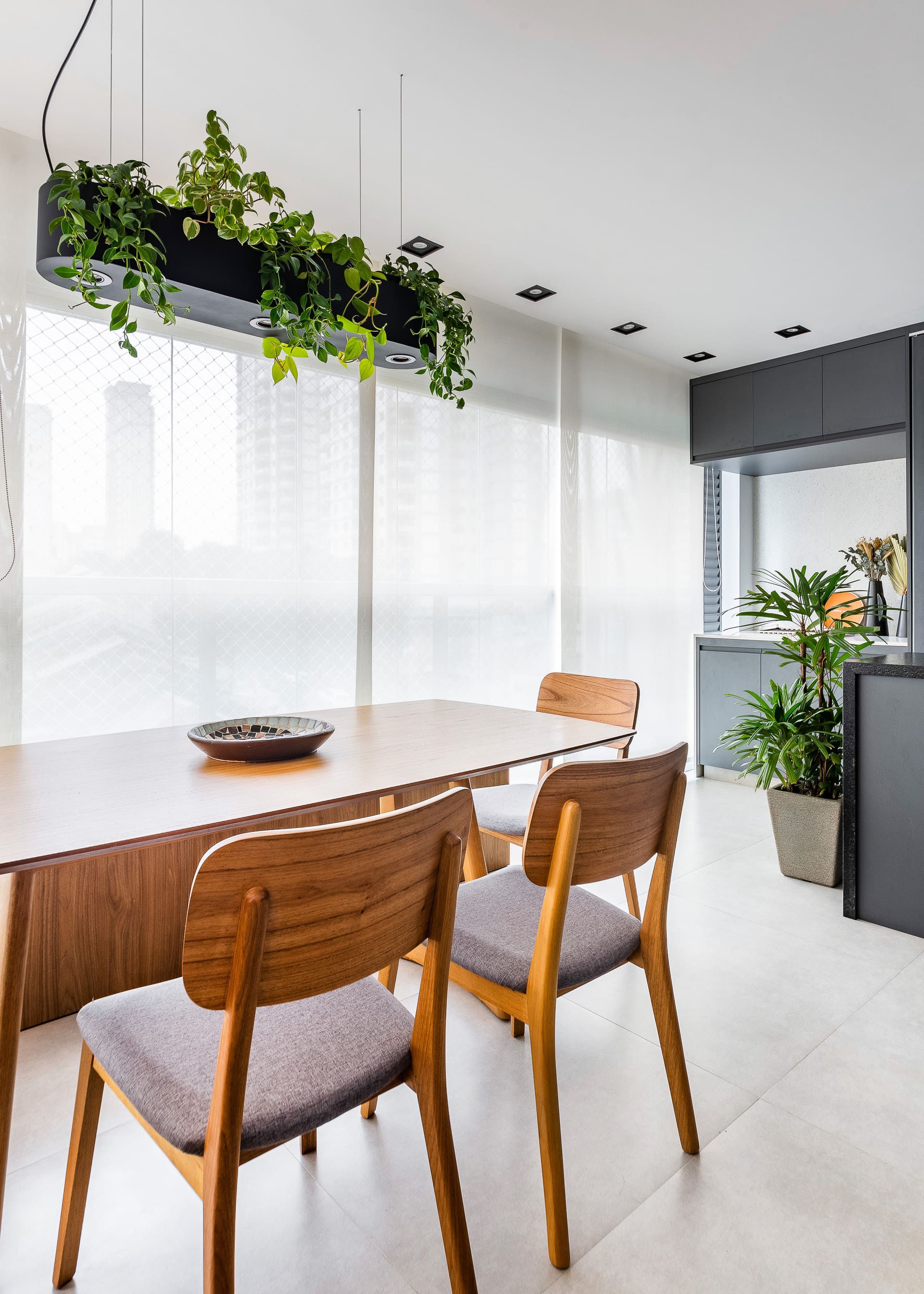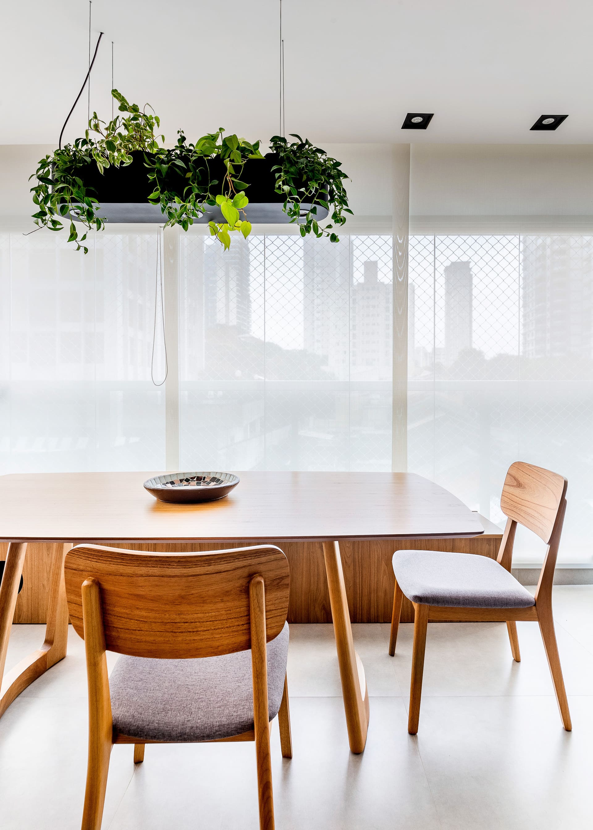 A varanda então foi totalmente integrada com a sala com seu envidraçamento e nesse espaço foi posicionada a mesa de jantar circundada por um banco de marcenaria. Sobre a mesa desenhamos uma luminária pendente executada de forma completamente experimental pela arquiteta em conjunto com a Oficina Azagaia de Serralheria. A luminária além de abrigar a iluminação em si também possui um suporte para vasos de plantas pendentes. O verde então se mistura com a iluminação suave da mesa trazendo ainda mais aconchego.