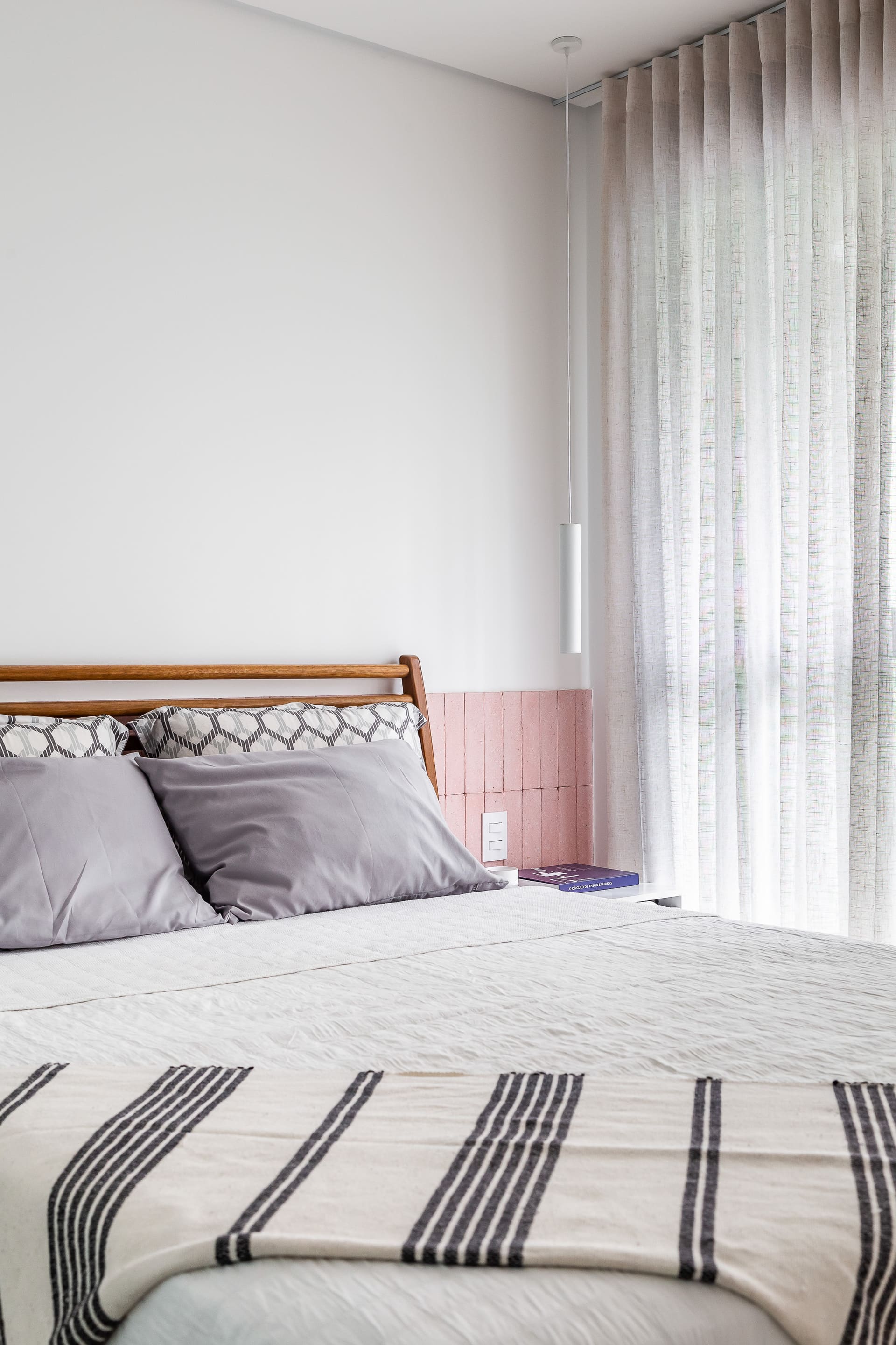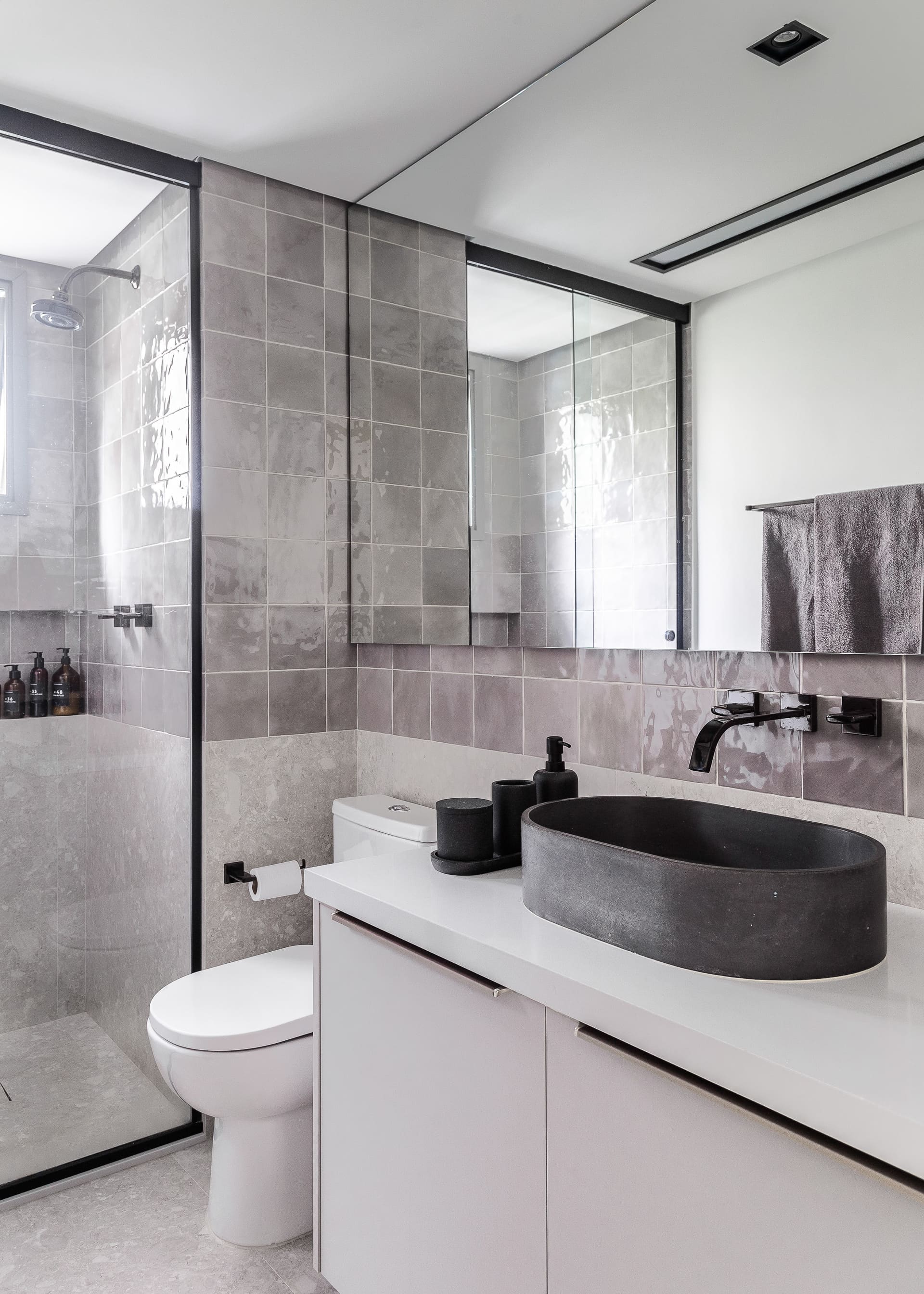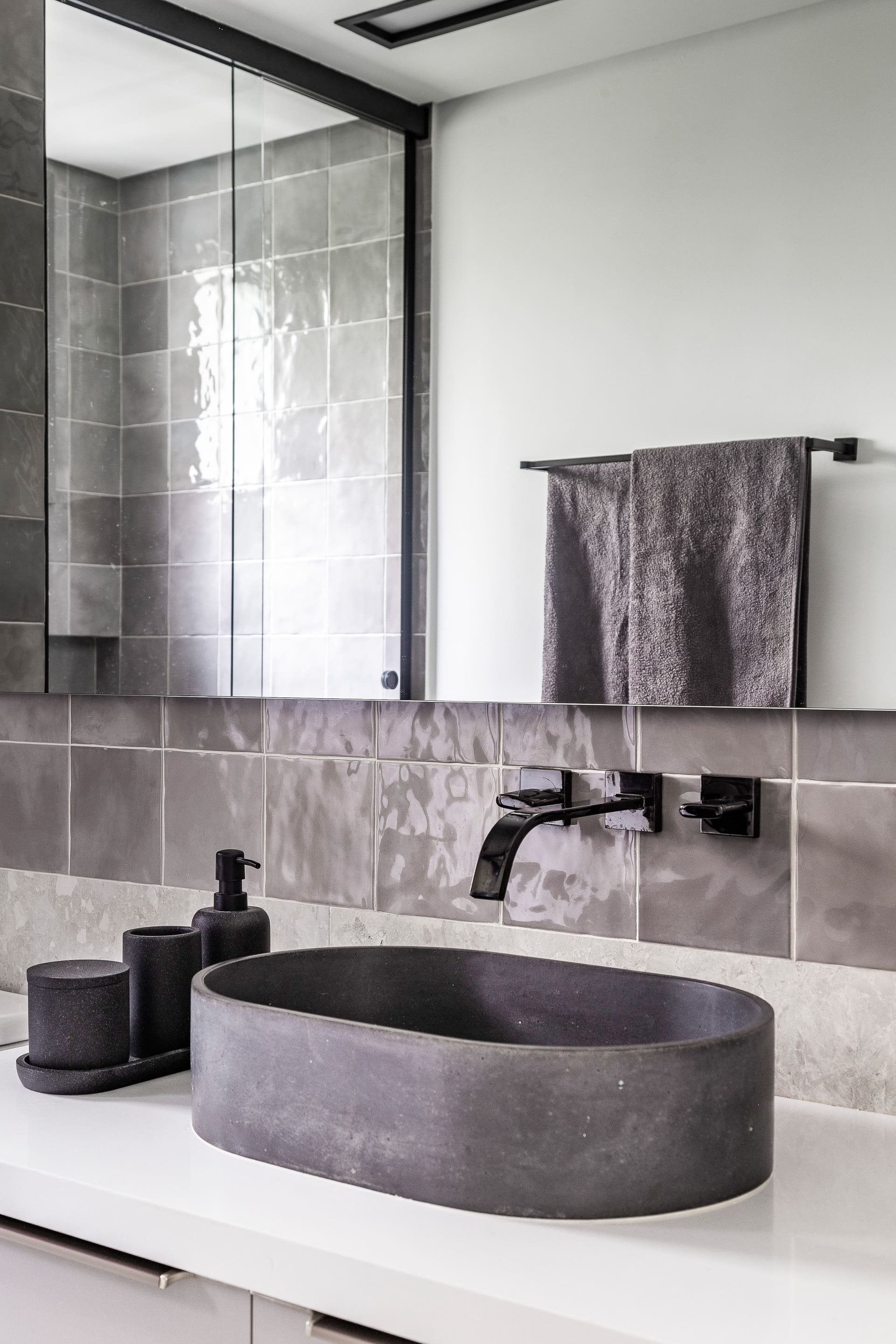 O quarto e banho do casal seguem a mesma linha, minimalista nas cores e conforto em equilíbrio. No banho do casal os revestimentos ora acetinados ora brilhantes mesclam os tons de cinza e são complementados pelos metais pretos e cuba de concreto da marca UMA. No quarto, a cabeceira de tom rosa claro traz um ponto de cor suave.