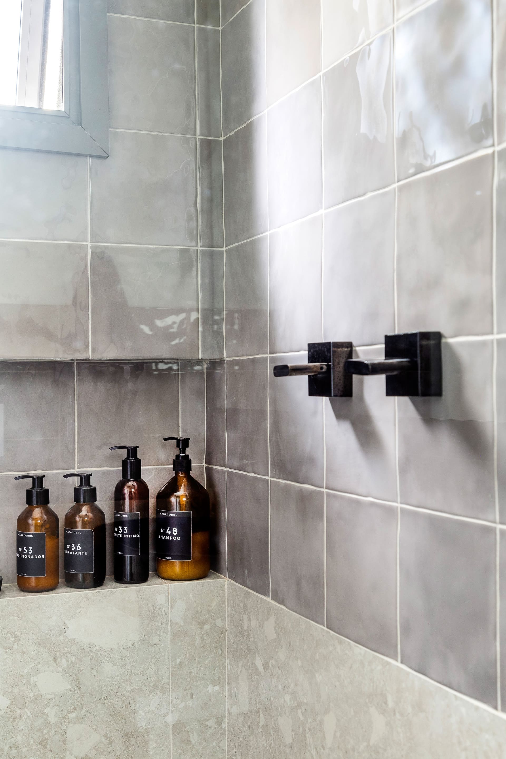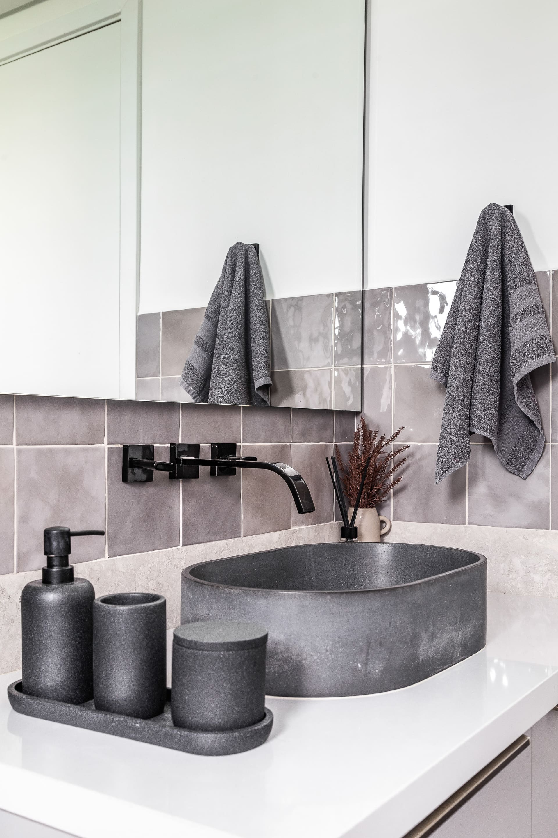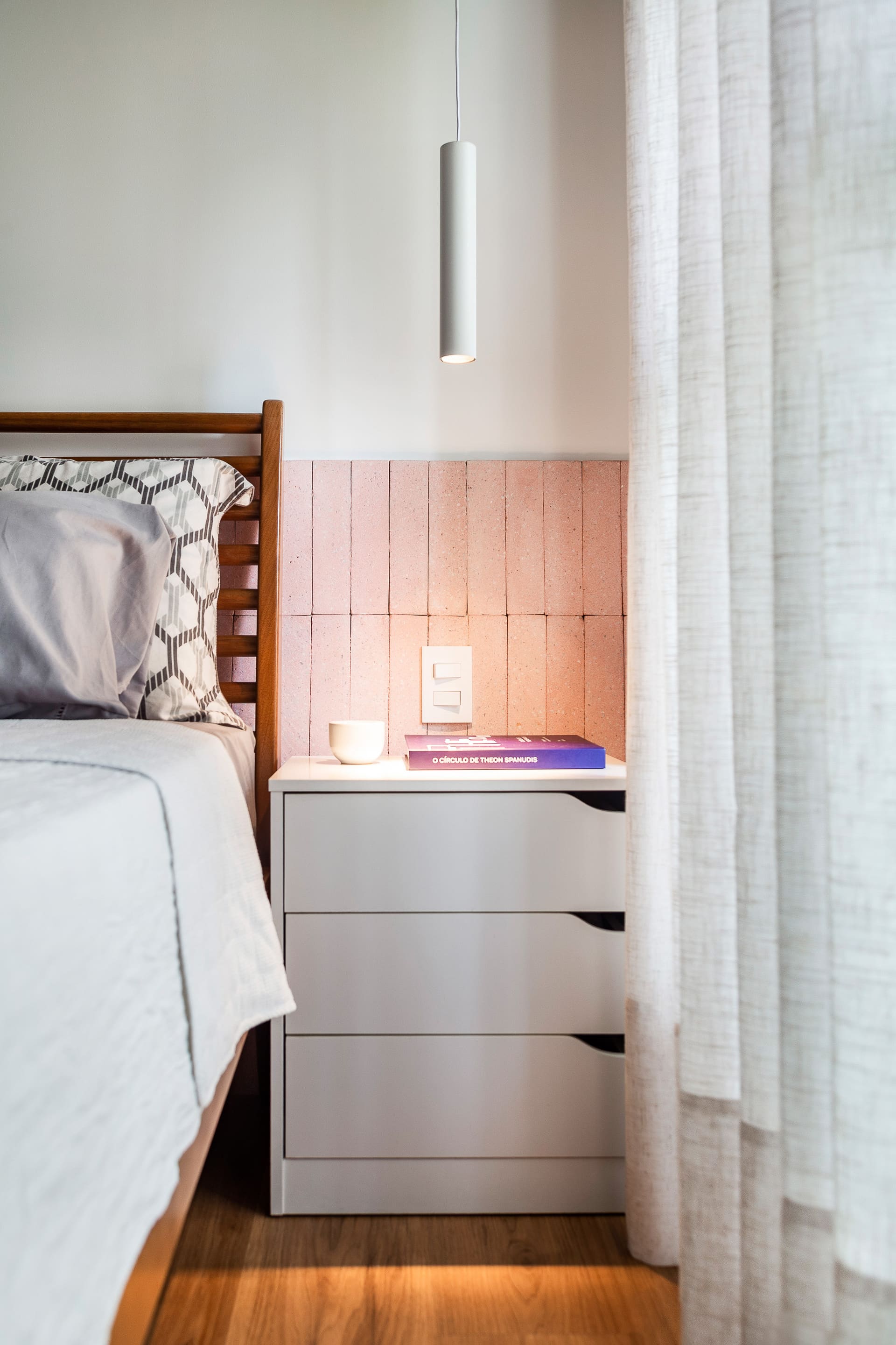 O quarto e banho do casal seguem a mesma linha, minimalista nas cores e conforto em equilíbrio. No banho do casal os revestimentos ora acetinados ora brilhantes mesclam os tons de cinza e são complementados pelos metais pretos e cuba de concreto da marca UMA. No quarto, a cabeceira de tom rosa claro traz um ponto de cor suave.
