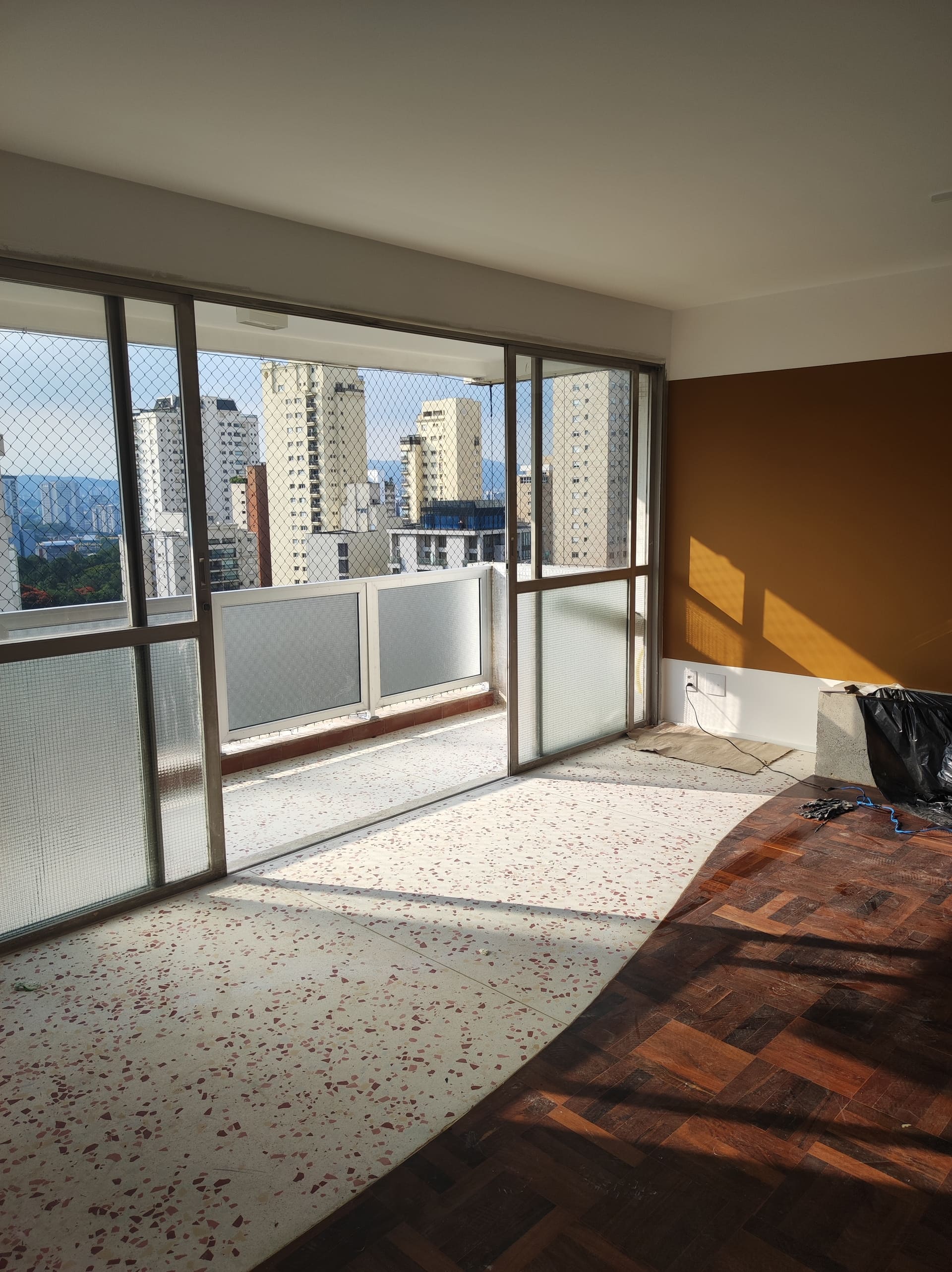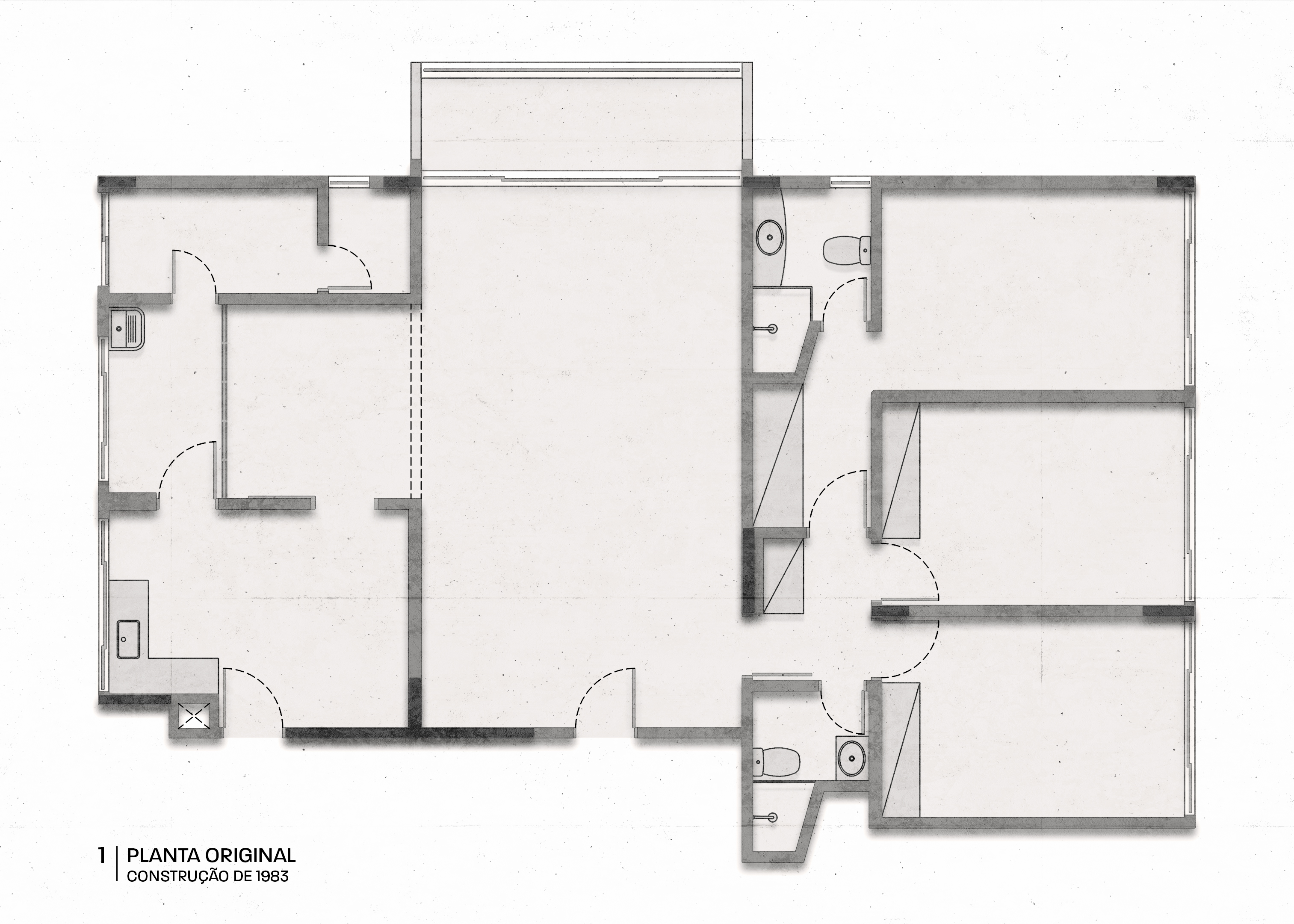 No inícío encontramos um apartamento da década de 1980 totalmente original, com cozinha fechada, lavanderia com o antigo dormítório e banho de serviço, e revestimentos da época. E também com características super positivas das construções antigas: janelas amplas em todos os ambientes, dormitórios enormes, uma sala com uma super iluminação natural e uma varanda que realmente se projeta em balanço para fora da edificação.