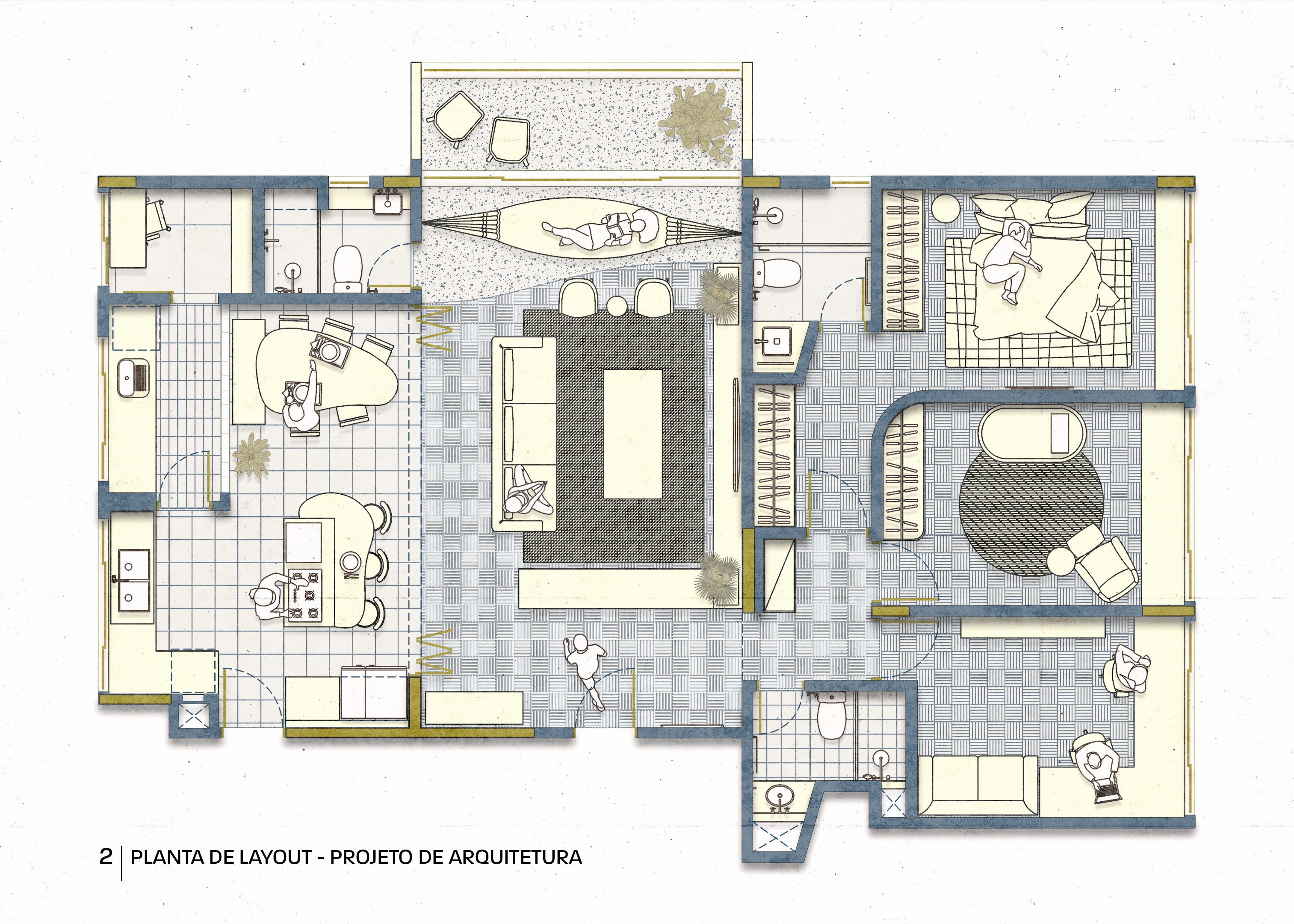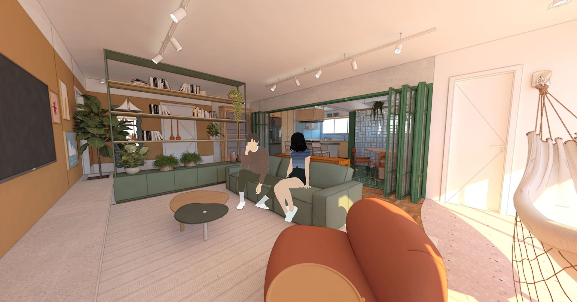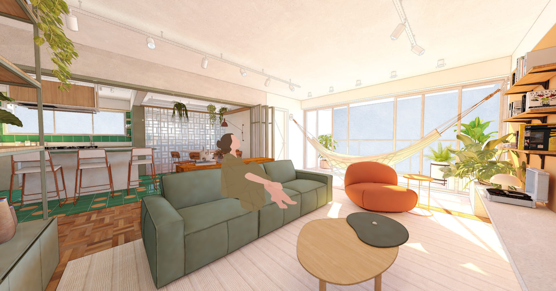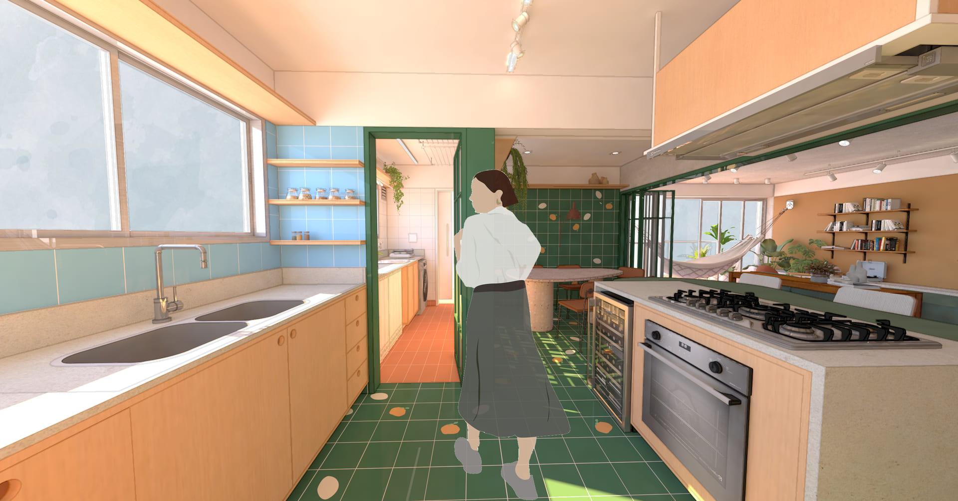 O apartamento Paraguaçu é um projeto com características super marcantes que evidenciam a personalidade da sua proprietária, uma jovem artista plástica que ama cores e texturas. Foi um projeto totalmente colaborativo entre a equipe de arquitetura e sua proprietária que escolheu um por um seus acabamentos e chegou até mesmo a desenhar a estampa dos ladrilhos que compõem a área da cozinha e mesa de jantar.
