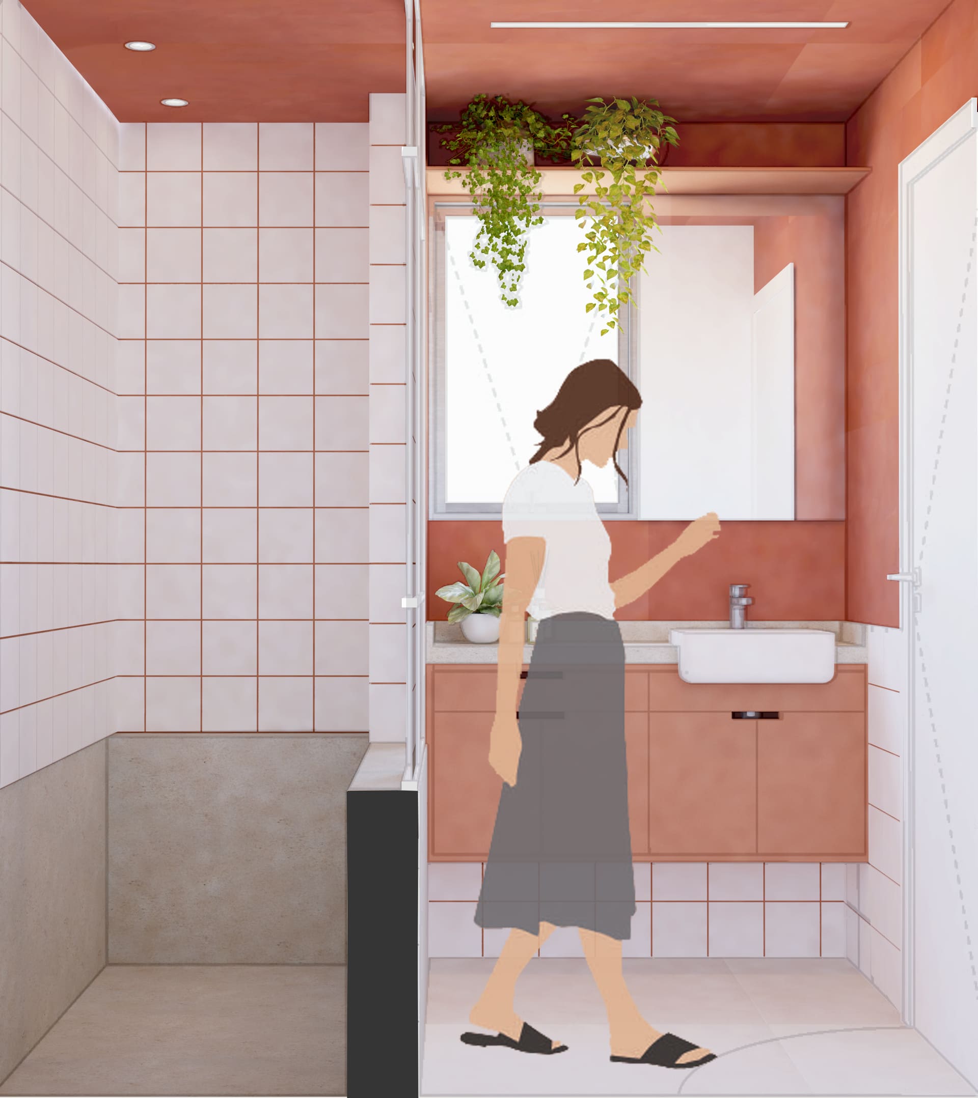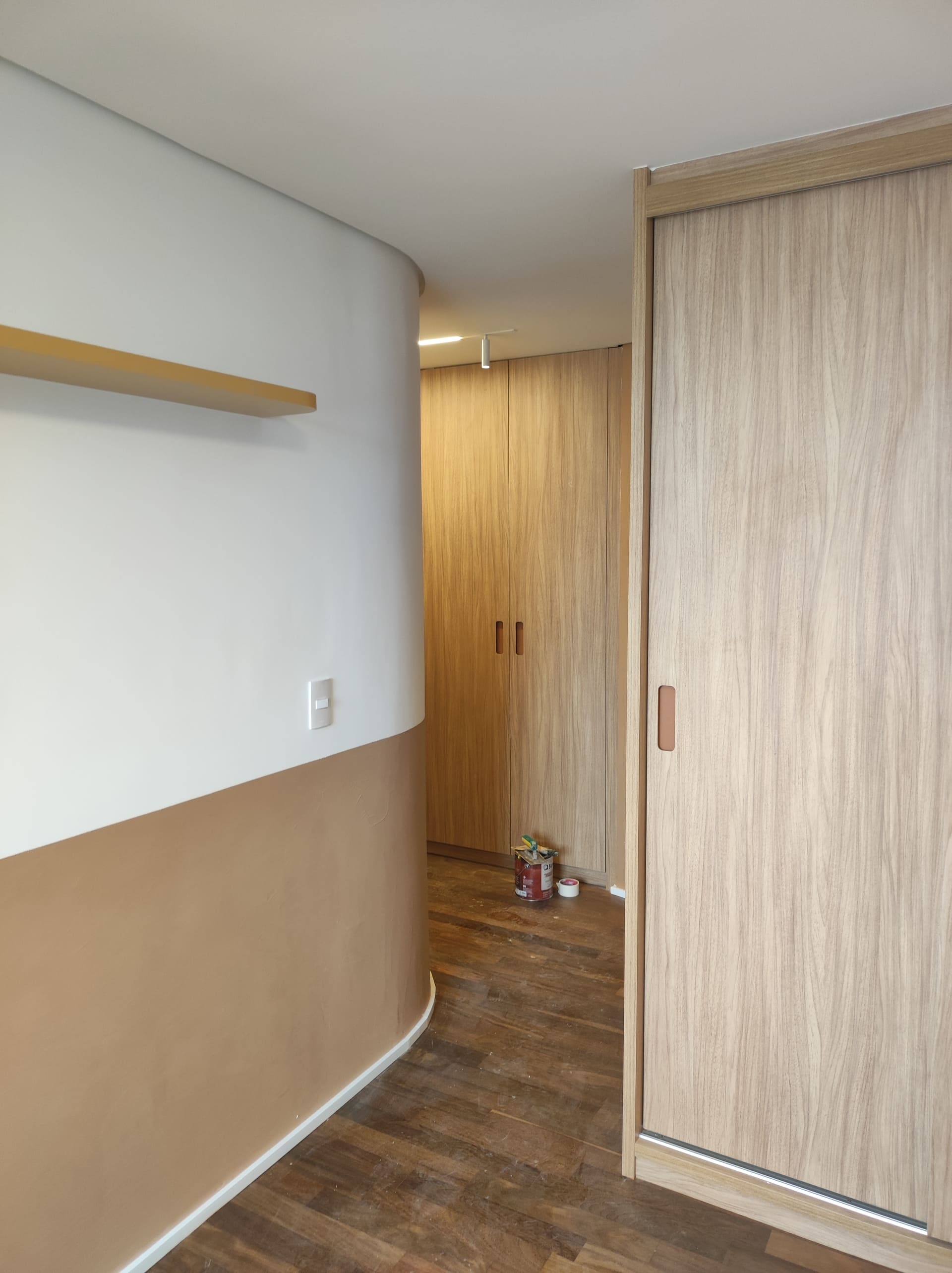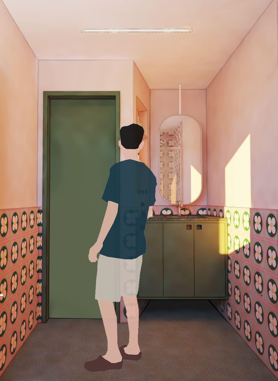 O concreto da estrutura do edifício também foi evidenciado na viga aparente entre cozinha e sala, no rack da televisão e no banco do quarto de casal, ambos feitos durante a obra. Os banheiros foram todos remodelados, ganharam uma mistura de cores vibrantes como o verde e rosa no banho casal, azul e amarelo no banho filho e vermelho e branco no banho social. Dormitórios mantiveram a linguagem do piso de madeira maciço e ganharam nova marcenaria.
