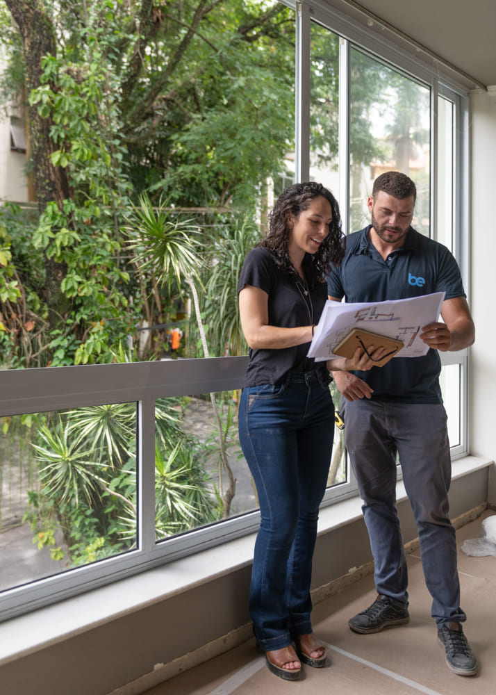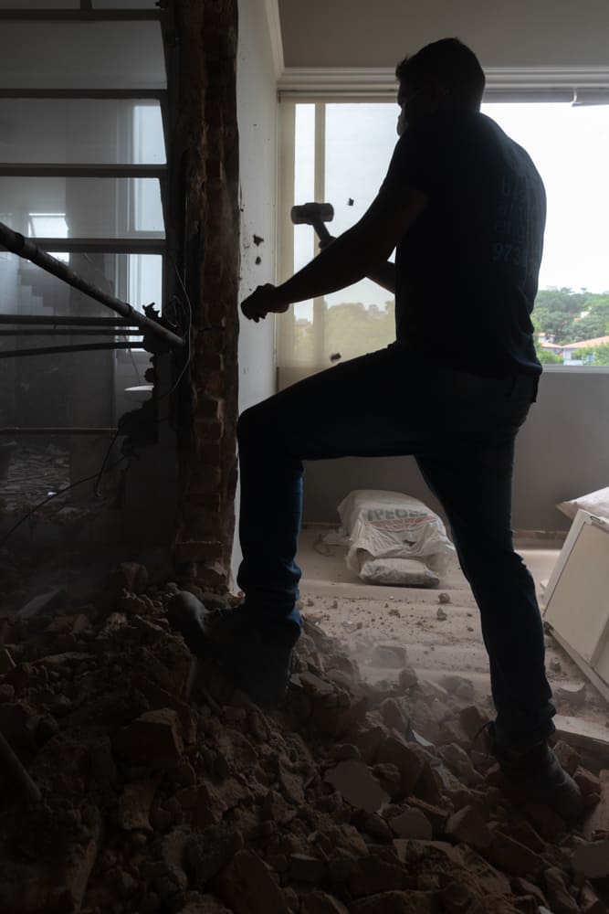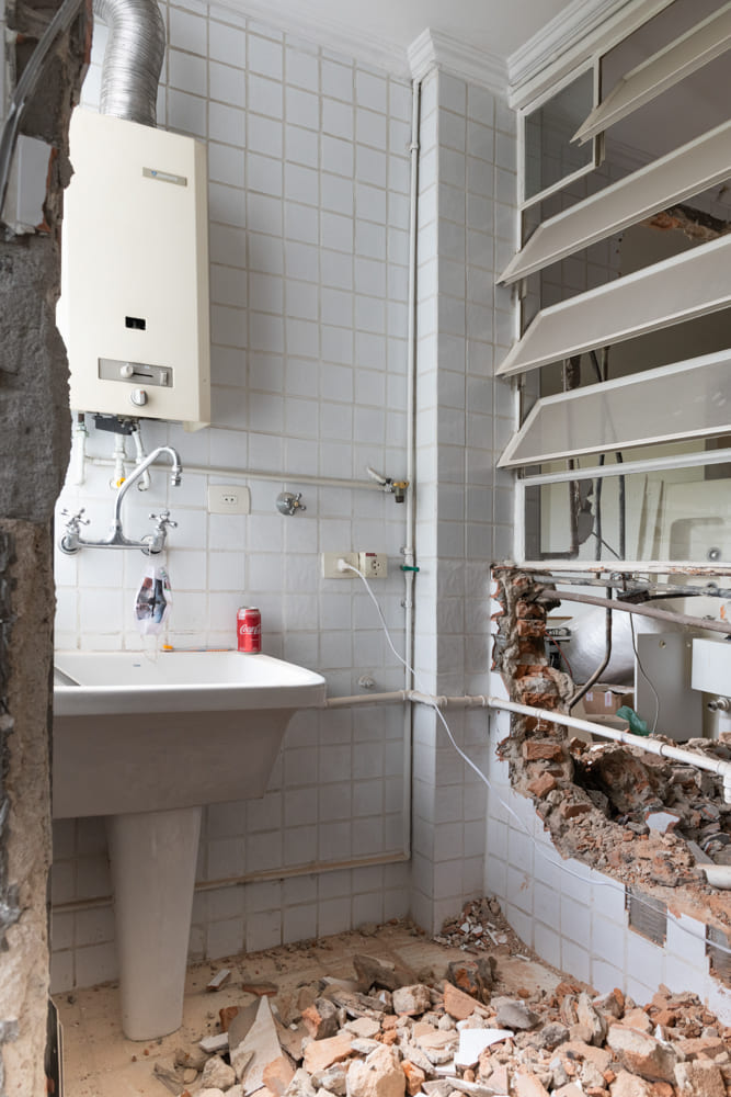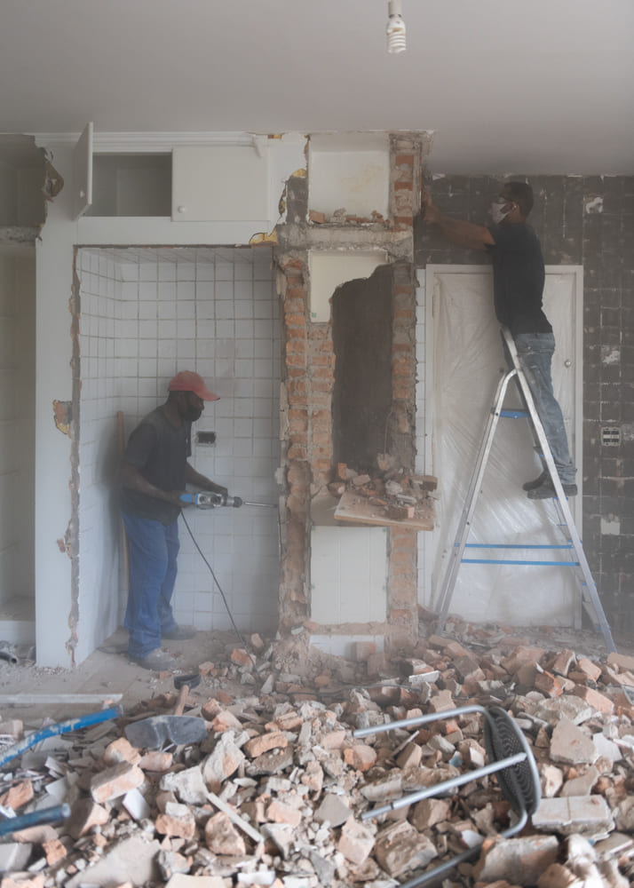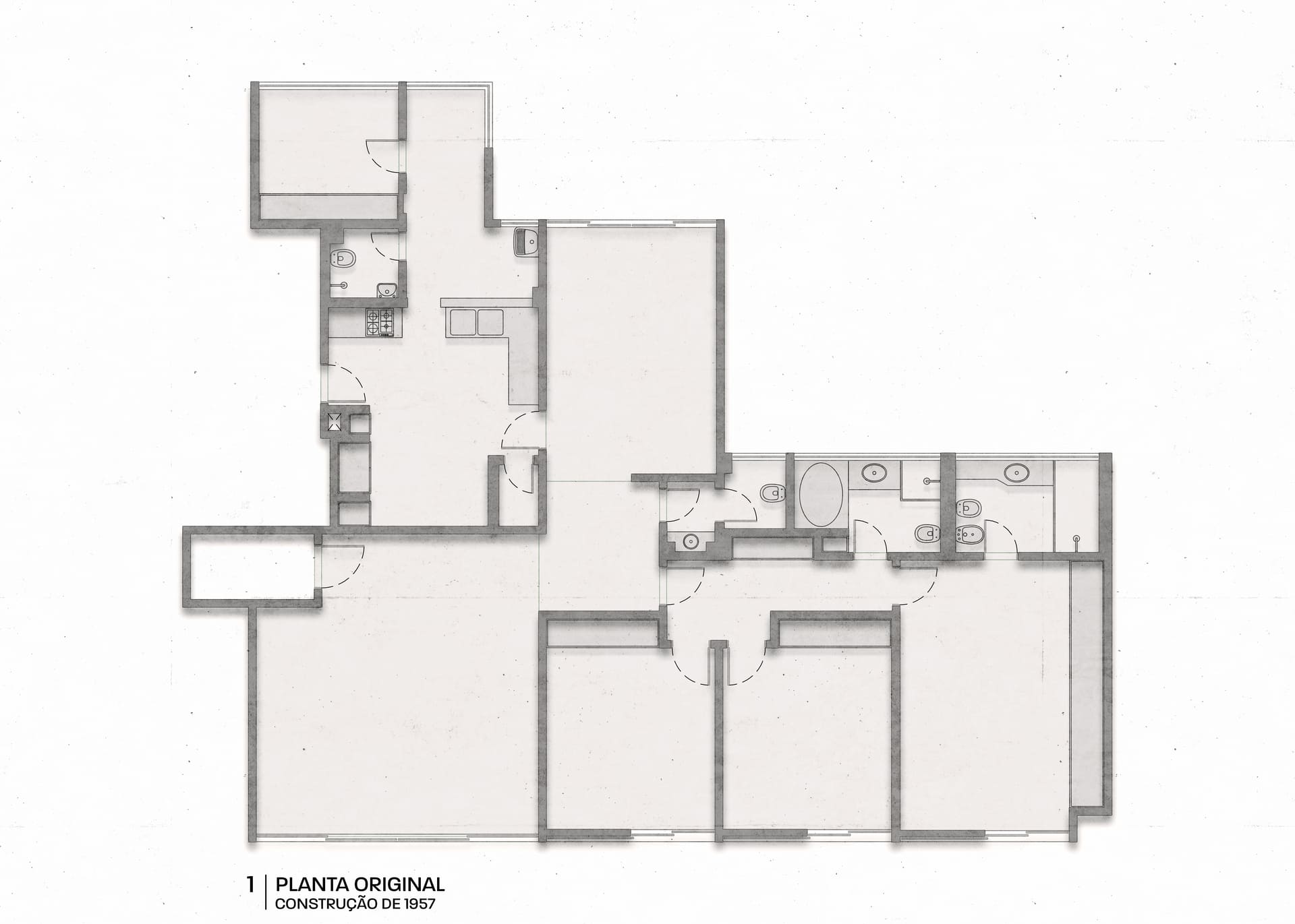 Um jovem casal, com planos de aumentar a familia, comprou um dos apartamentos disponíveis. Apesar da modernidade do edificio, a planta do apartamento carregava caracteristicas que não faziam mais sentido como a cozinha fechada para a sala de jantar e a existência do dormitório de serviço.