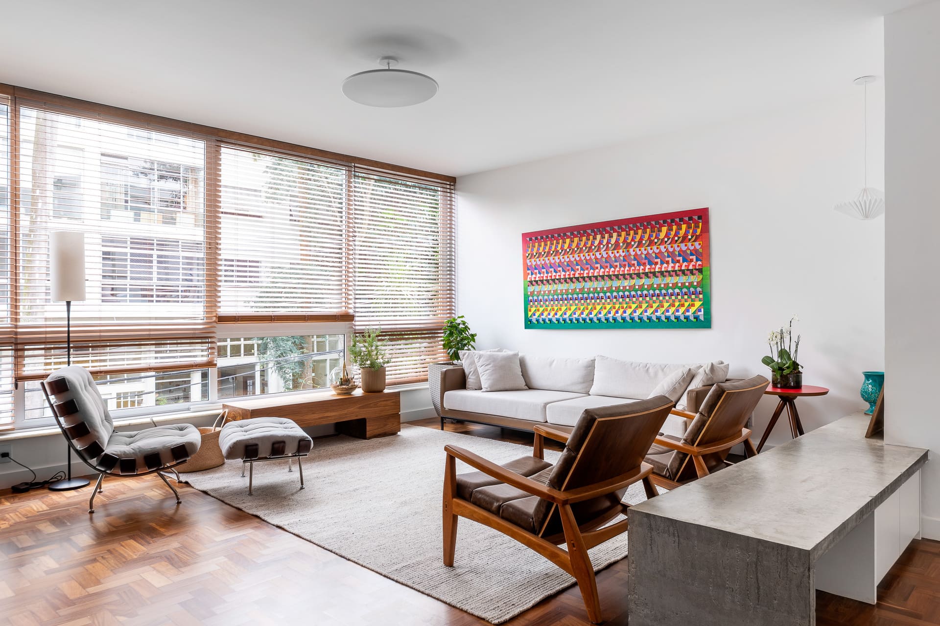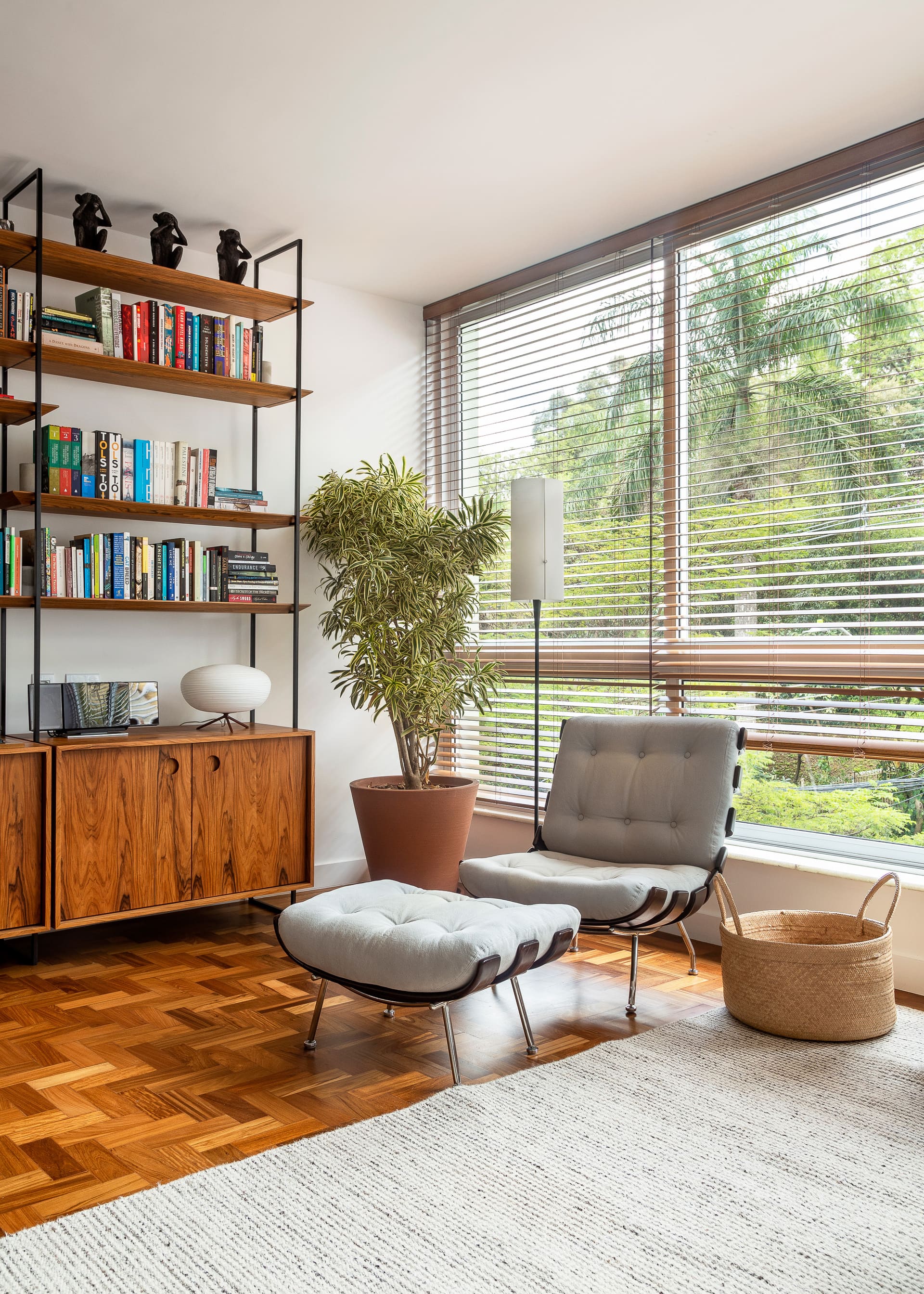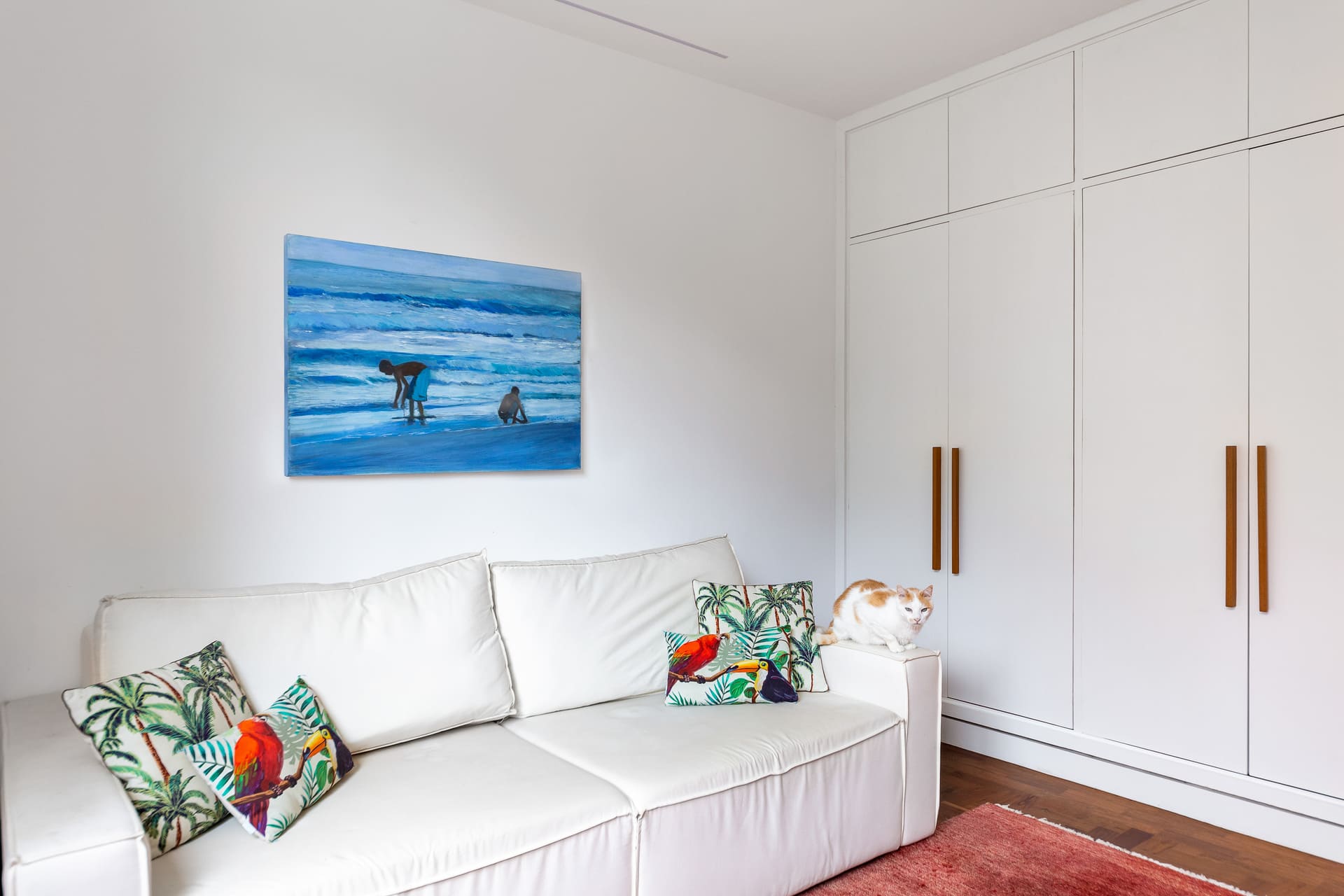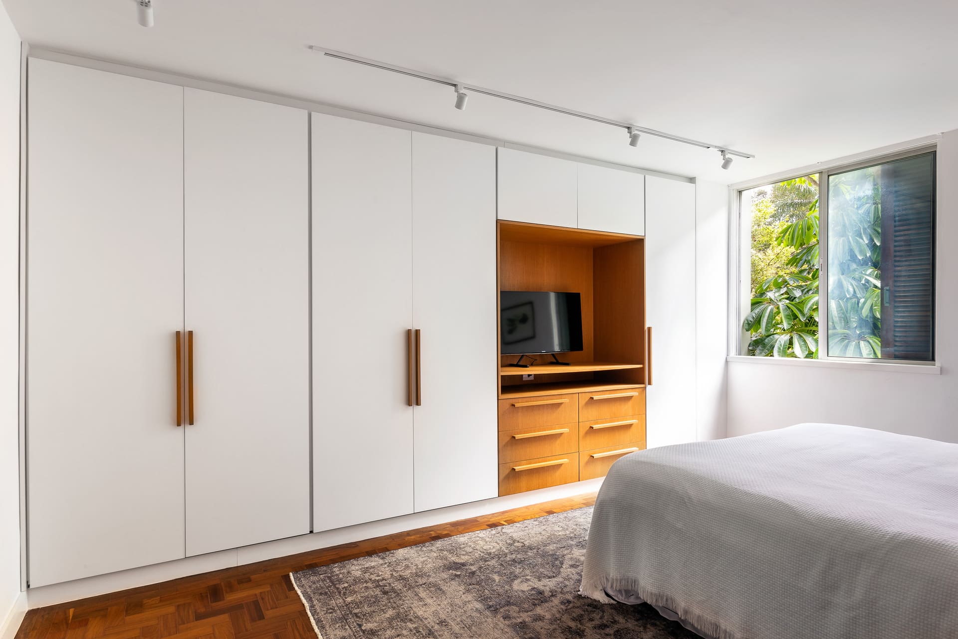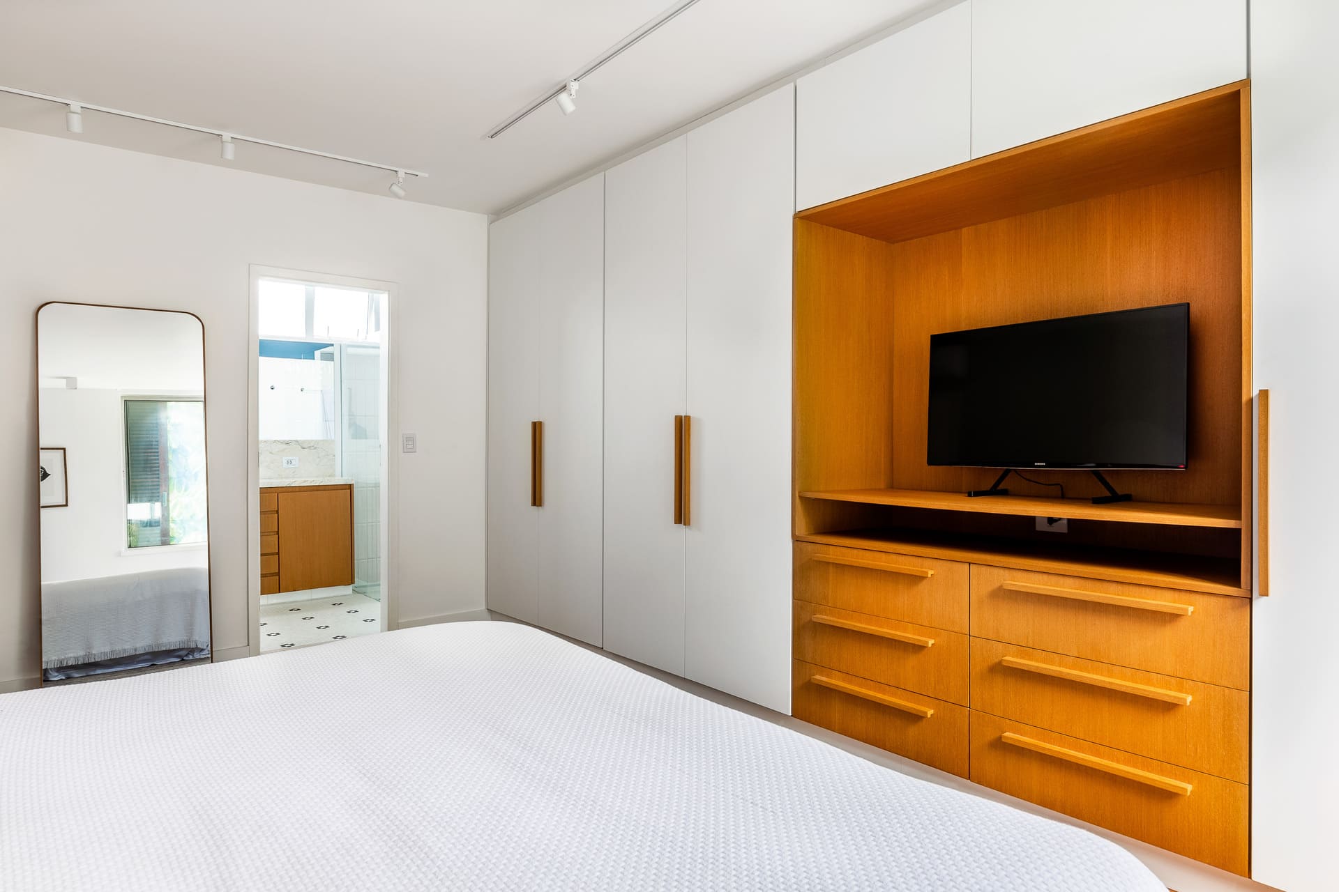 A sala de estar manteve-se sem televisão, seu espaço é dedicado à leitura e à conversa com ampla iluminação natural. Na área intima os dormitórios receberam revisão de elétrica, iluminação, pintura, instalação de ar condicionado e marcenaria totalmente nova. Os banheiros foram atualizados com revestimentos, louças e metais novos.