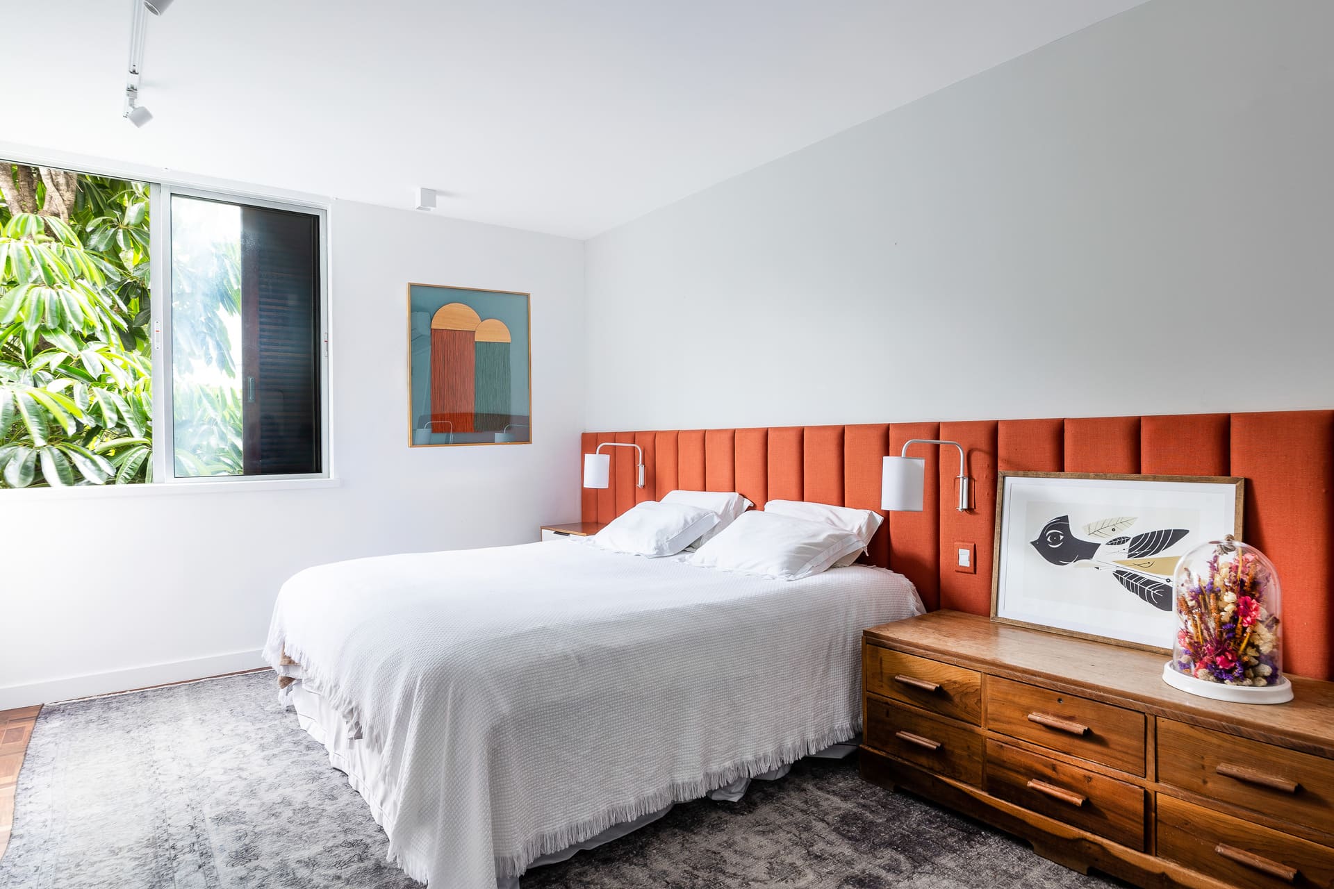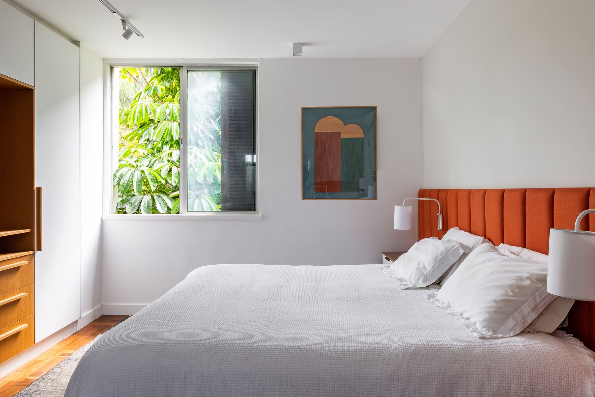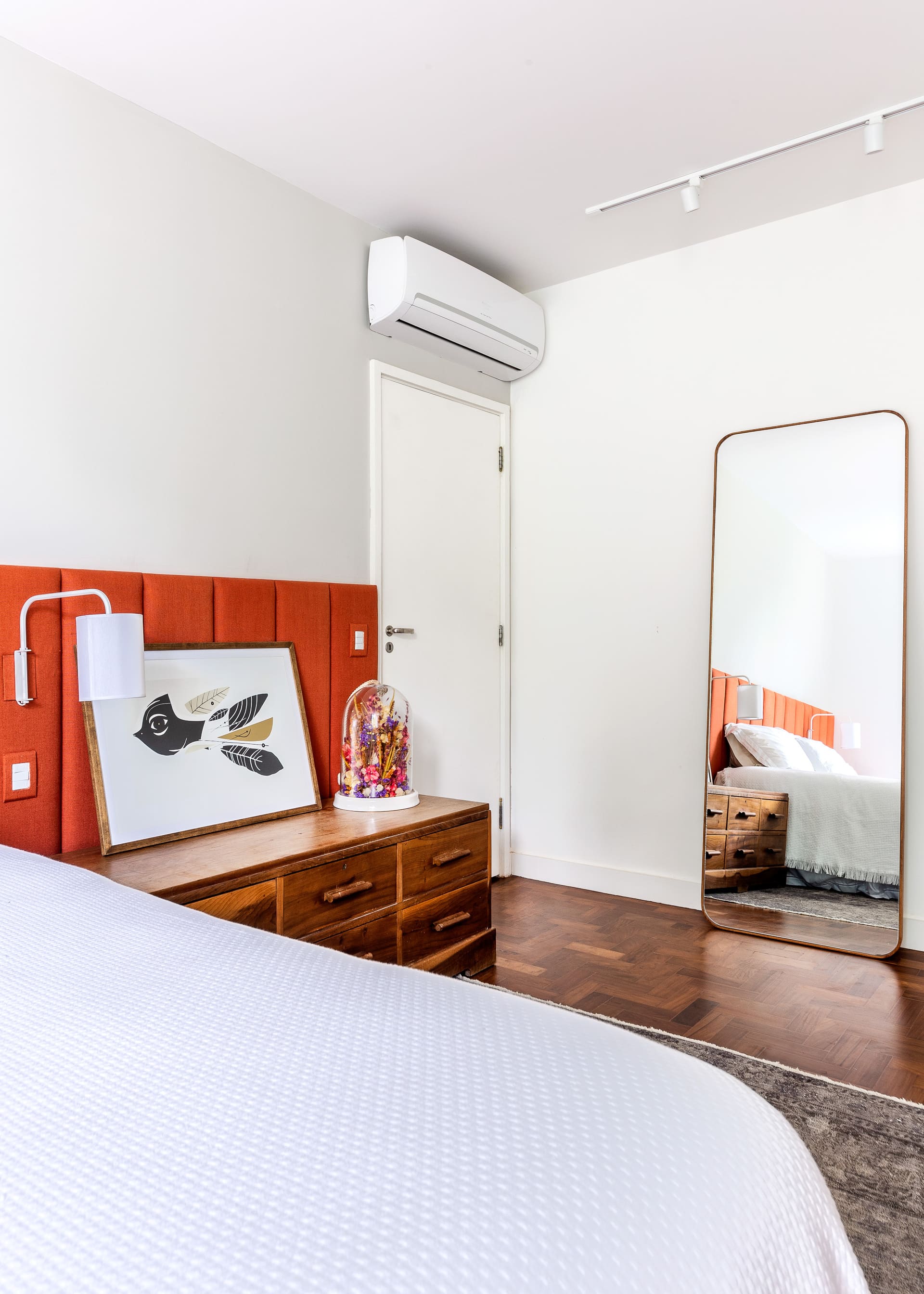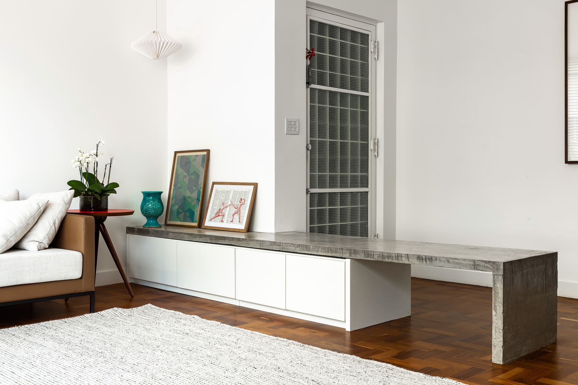 A sala de estar manteve-se sem televisão, seu espaço é dedicado à leitura e à conversa com ampla iluminação natural. Na área intima os dormitórios receberam revisão de elétrica, iluminação, pintura, instalação de ar condicionado e marcenaria totalmente nova. Os banheiros foram atualizados com revestimentos, louças e metais novos.