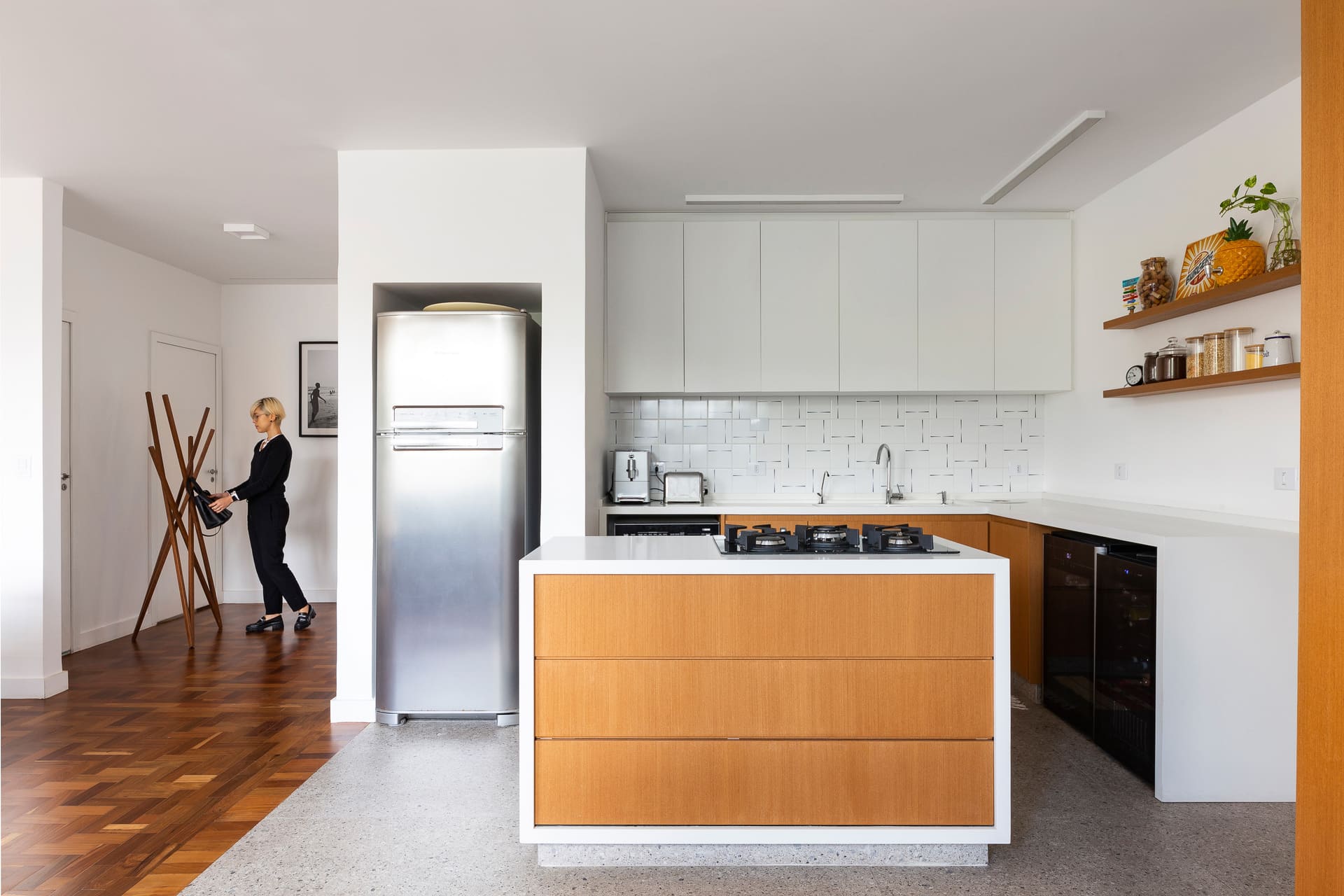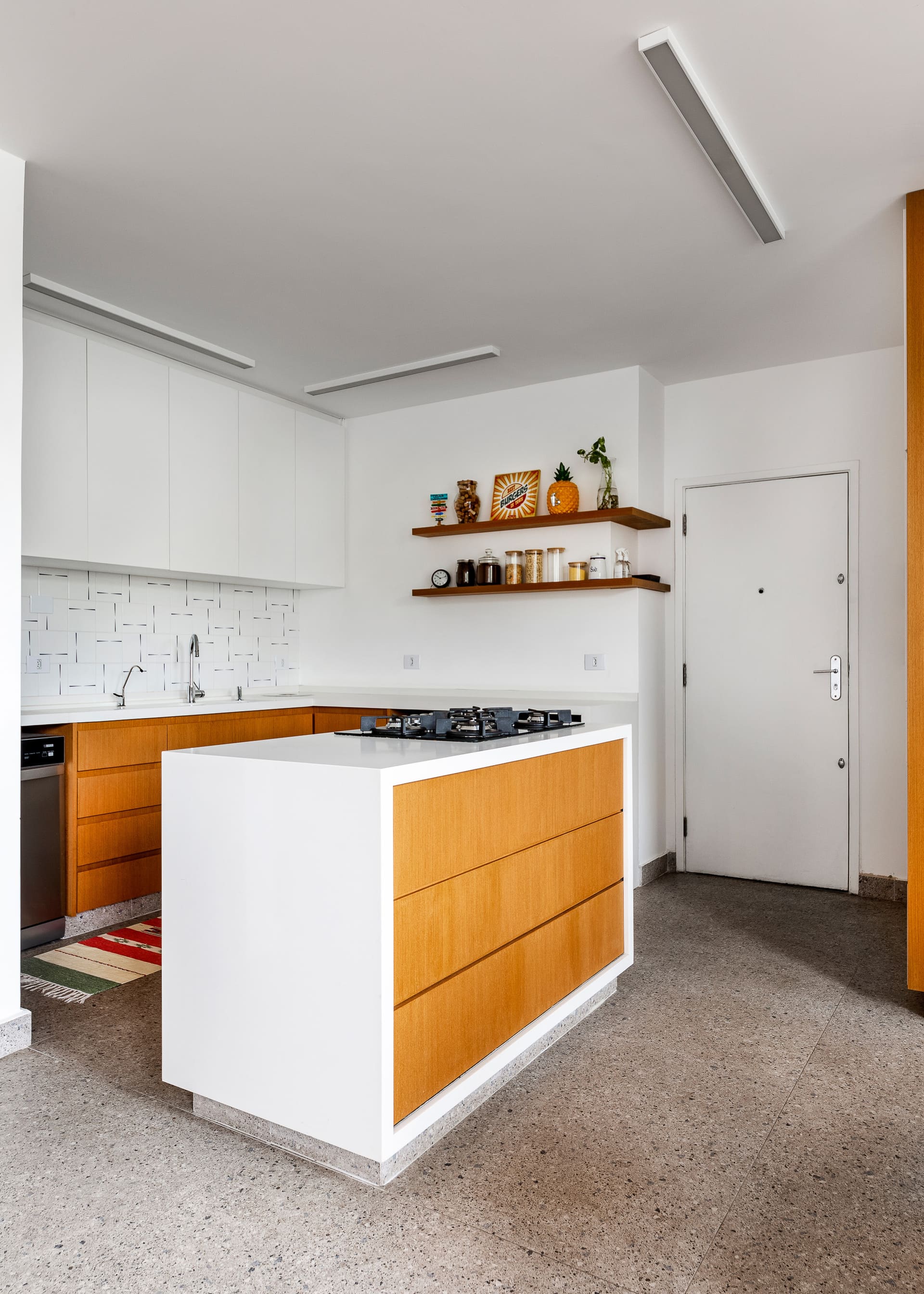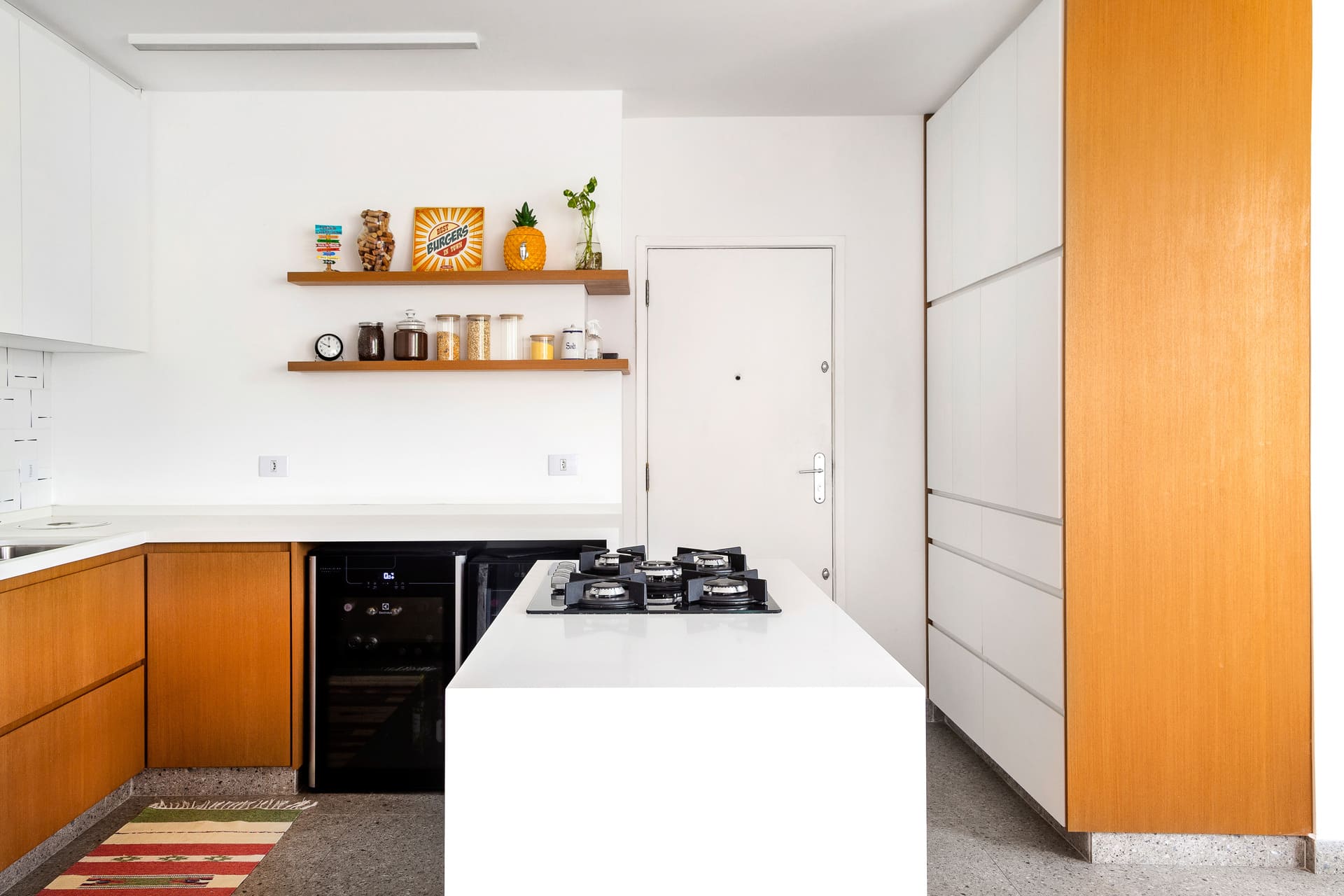O projeto de reforma iniciou revendo a relação da cozinha com o restante do apartamento. Agora aberta e com uma ilha central a cozinha faz parte da area social. Todos os pontos hidraulicos assim como a disposição das bancadas foi alterado, exigindo um alto grau de detalhamento no projeto e de qualidade na execução. O antigo dormitório de serviço foi transformado em um escritório para home office.