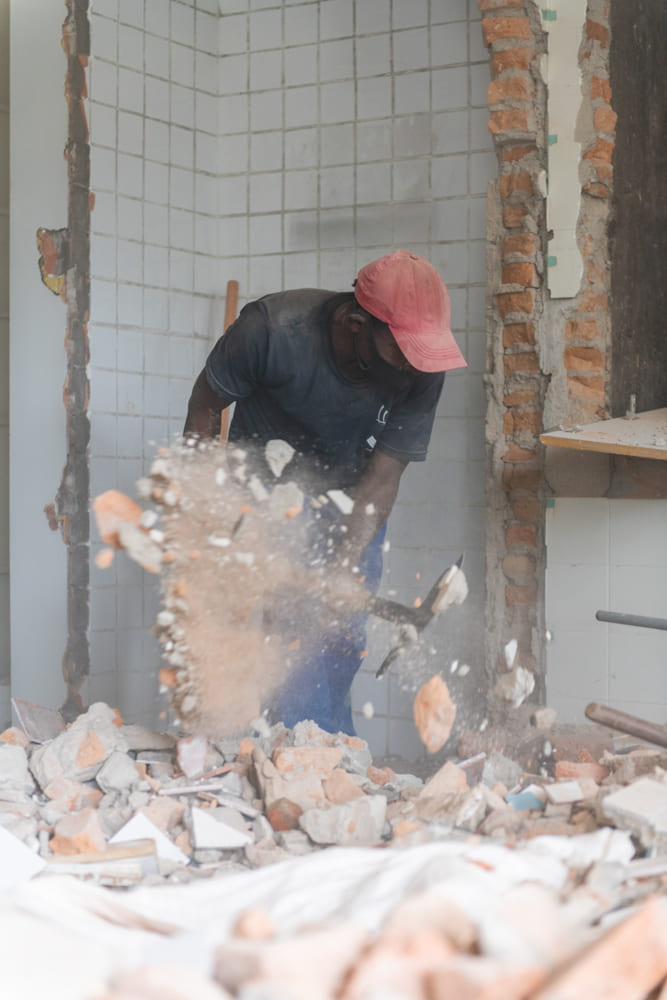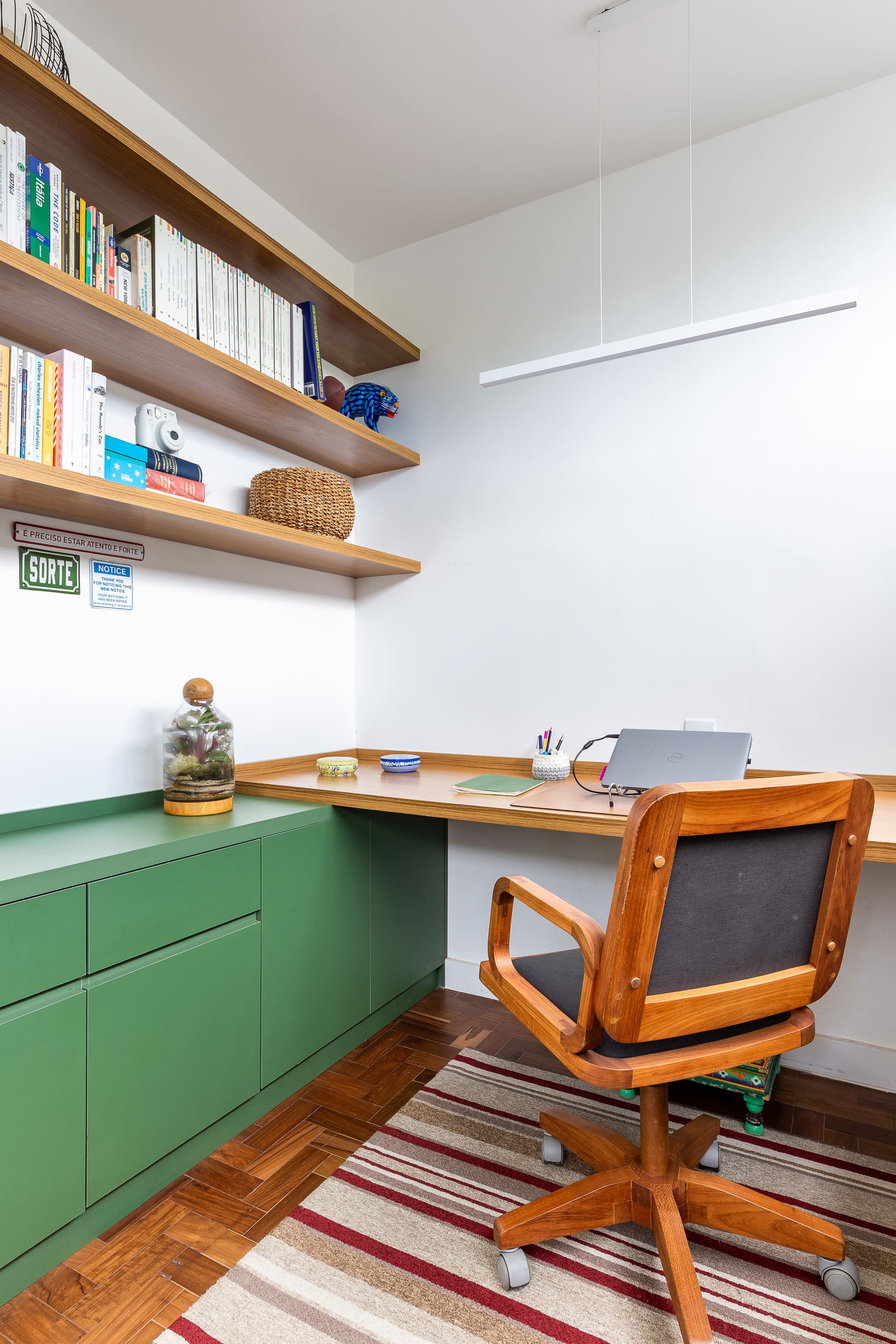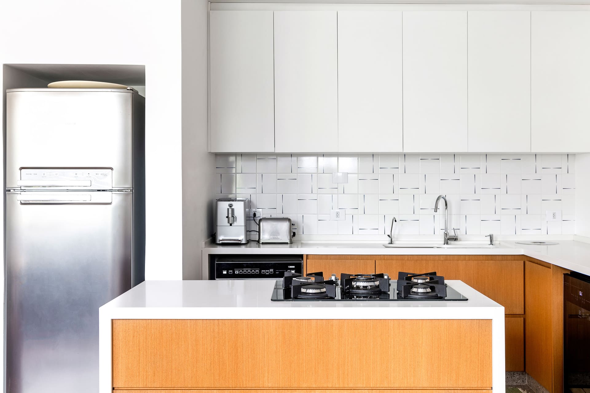 O projeto de reforma iniciou revendo a relação da cozinha com o restante do apartamento. Agora aberta e com uma ilha central a cozinha faz parte da area social. Todos os pontos hidraulicos assim como a disposição das bancadas foi alterado, exigindo um alto grau de detalhamento no projeto e de qualidade na execução. O antigo dormitório de serviço foi transformado em um escritório para home office.