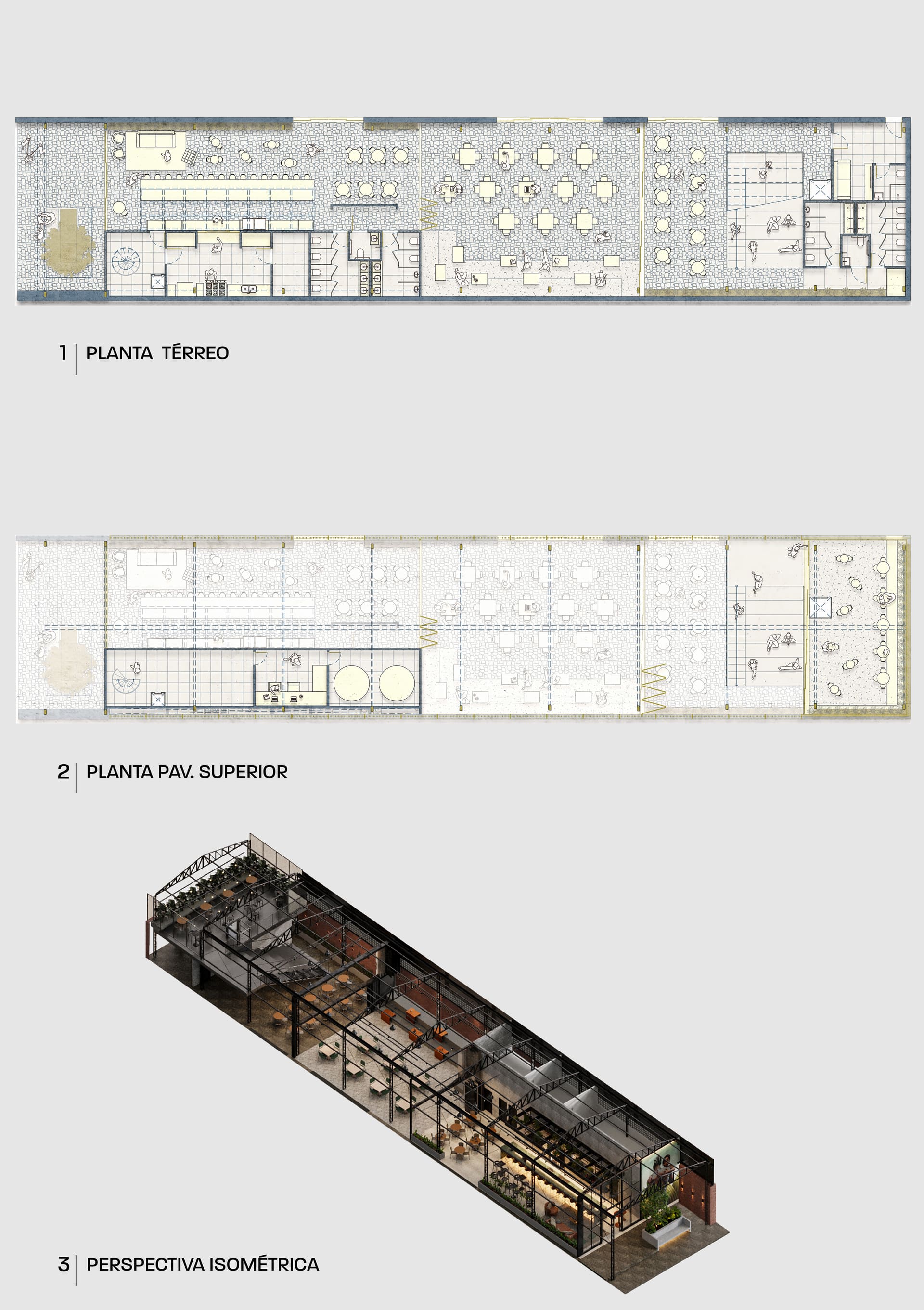 No layout de ocupação setorizamos esse grande retangulo que é a planta em 3 partes distintas: a primeira porção é destinada ao bar propriamente dito, com o apoio de cozinha completo, amplo balcão de atendimento e banheiros para os clientes. A segunda porção é destinada a apresentações musicais de pequeno porte com uma arquibancada lateral que forma um pequeno anfi-teatro. A ultima porção conta com uma escada-arquibancada que dá acesso ao terraço dos fundos aberto para ser uma área de fumantes.