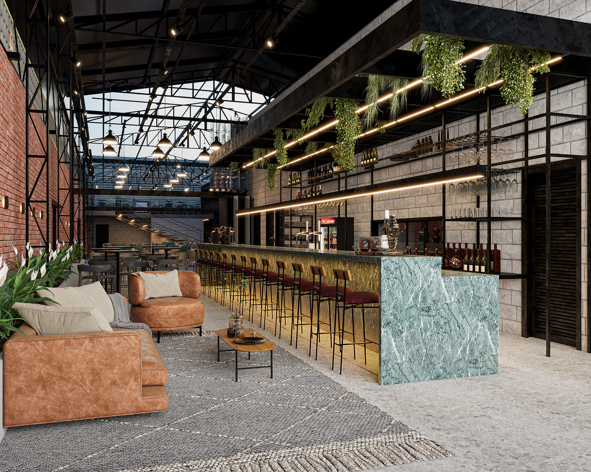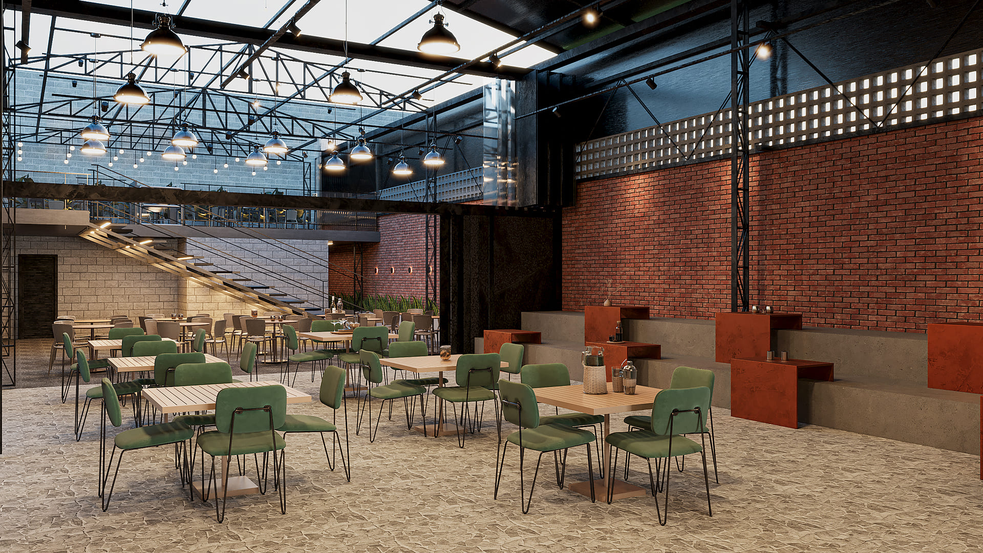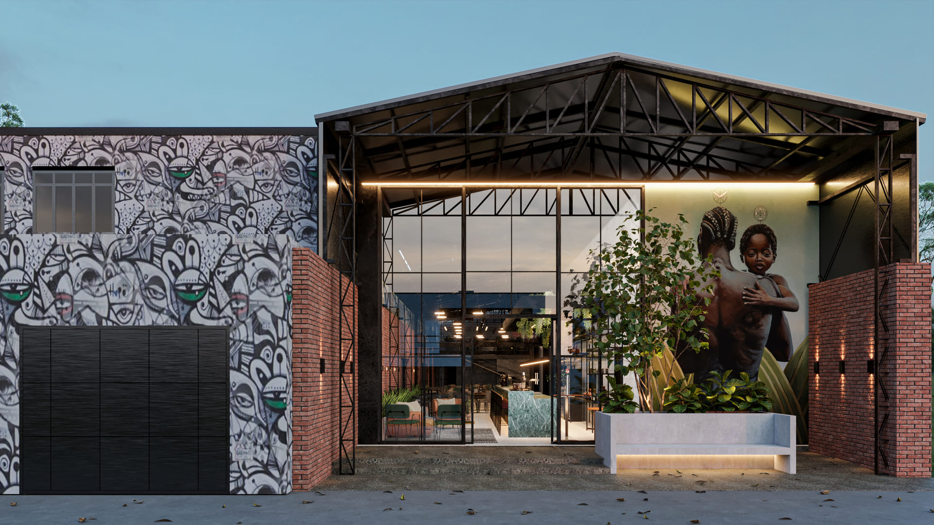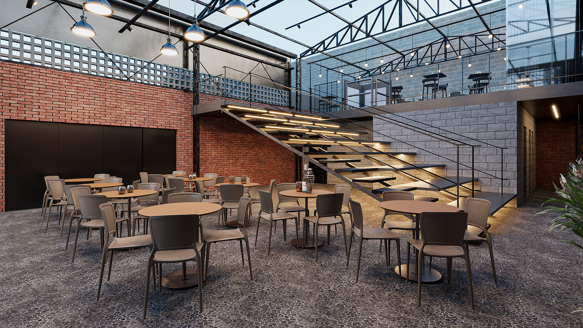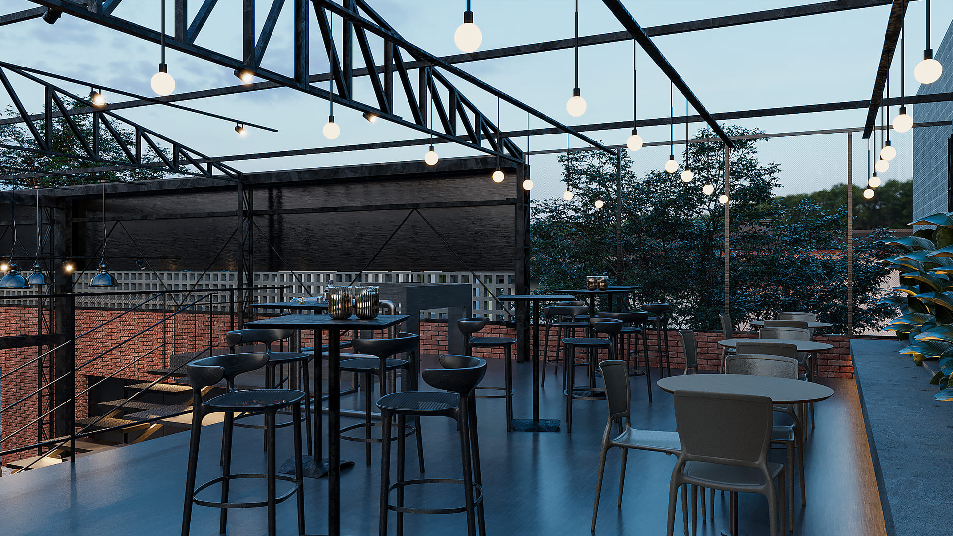 Nosso projeto objetivou mantér a estrutura metálica de cobertura, preservando a ambiência de armazém industrial. Ao invés de uma cobertura fixa de telhas metálicas propusemos uma cobertura retratíl para poder abrir em dias de sol e tempo firme.