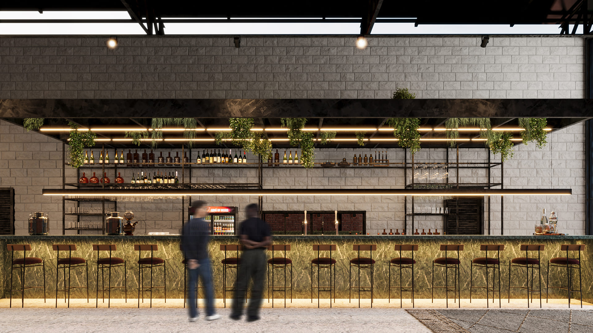 O proprietário desse galpão já tem um bar em funcionamento no lote vizinho e com o sucesso desse primeiro endereço nos contratou para desenhar o segundo bar em uma construção existente com 10 metros de frente e 50 metros de fundo, contando com uma estrutura metálica com vãos de 5 metros que garante o suporte à grande cobertura de telhas metálicas de ponta a ponta do lote.