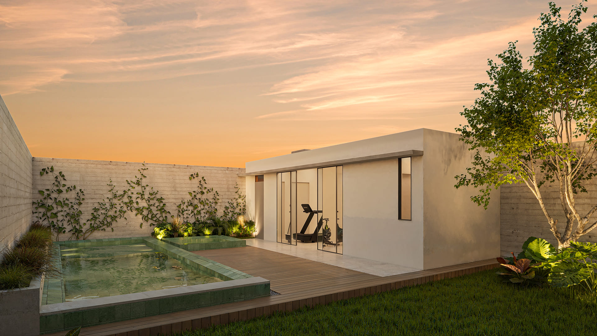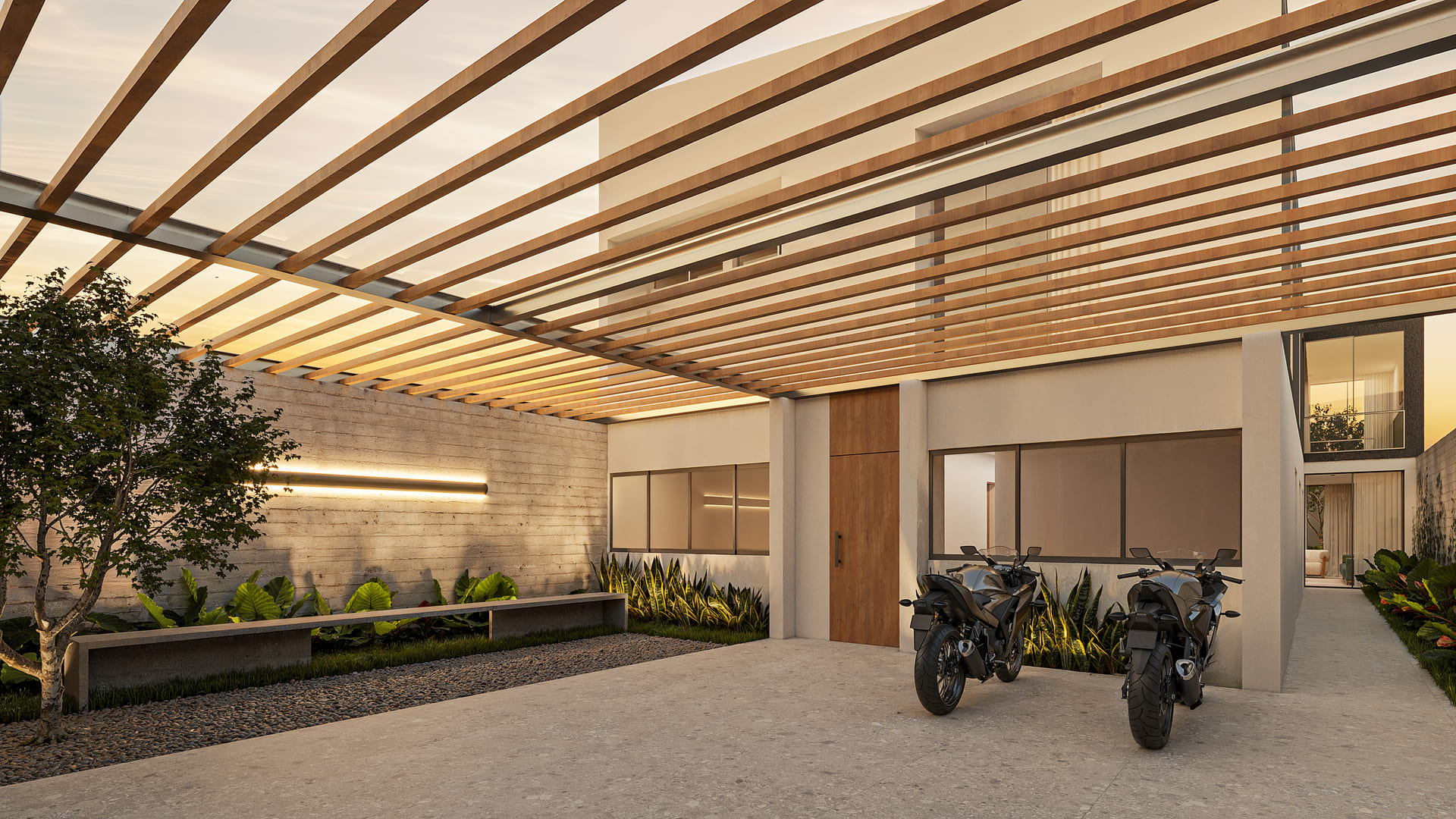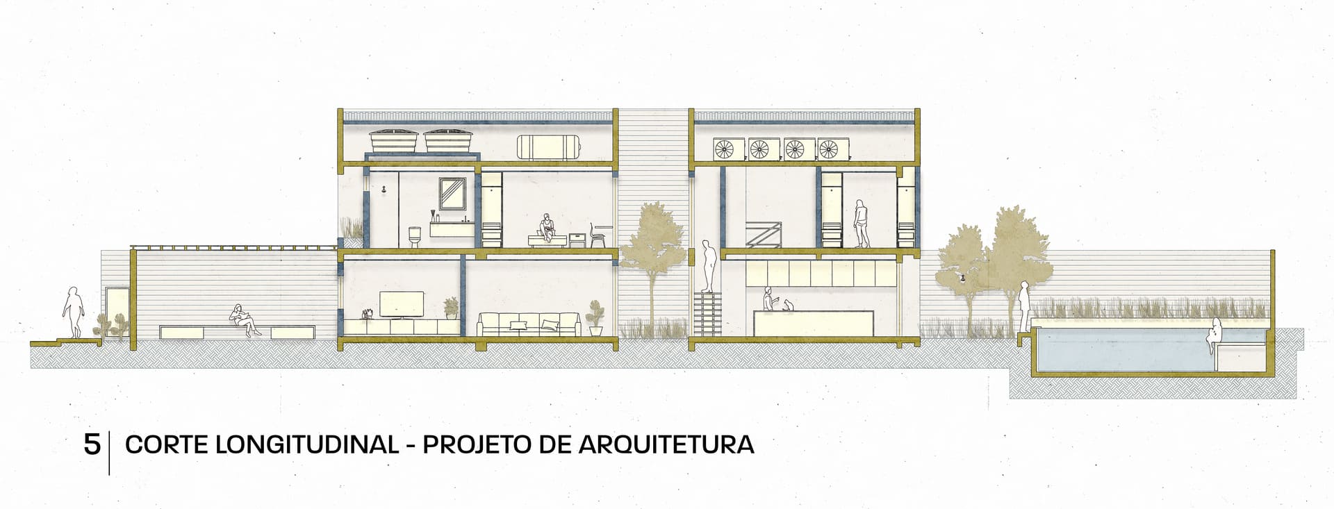 A cobertura, desenhada em uma água só, abrigou toda a área tecnica com caixa dágua, boiler e ar condicionado. A garagem ganhou uma cobertura leve de estrutura metálica e vidro, com um pergolado de madeira. Inserimos jardins na parte frontal e lateral da casa.