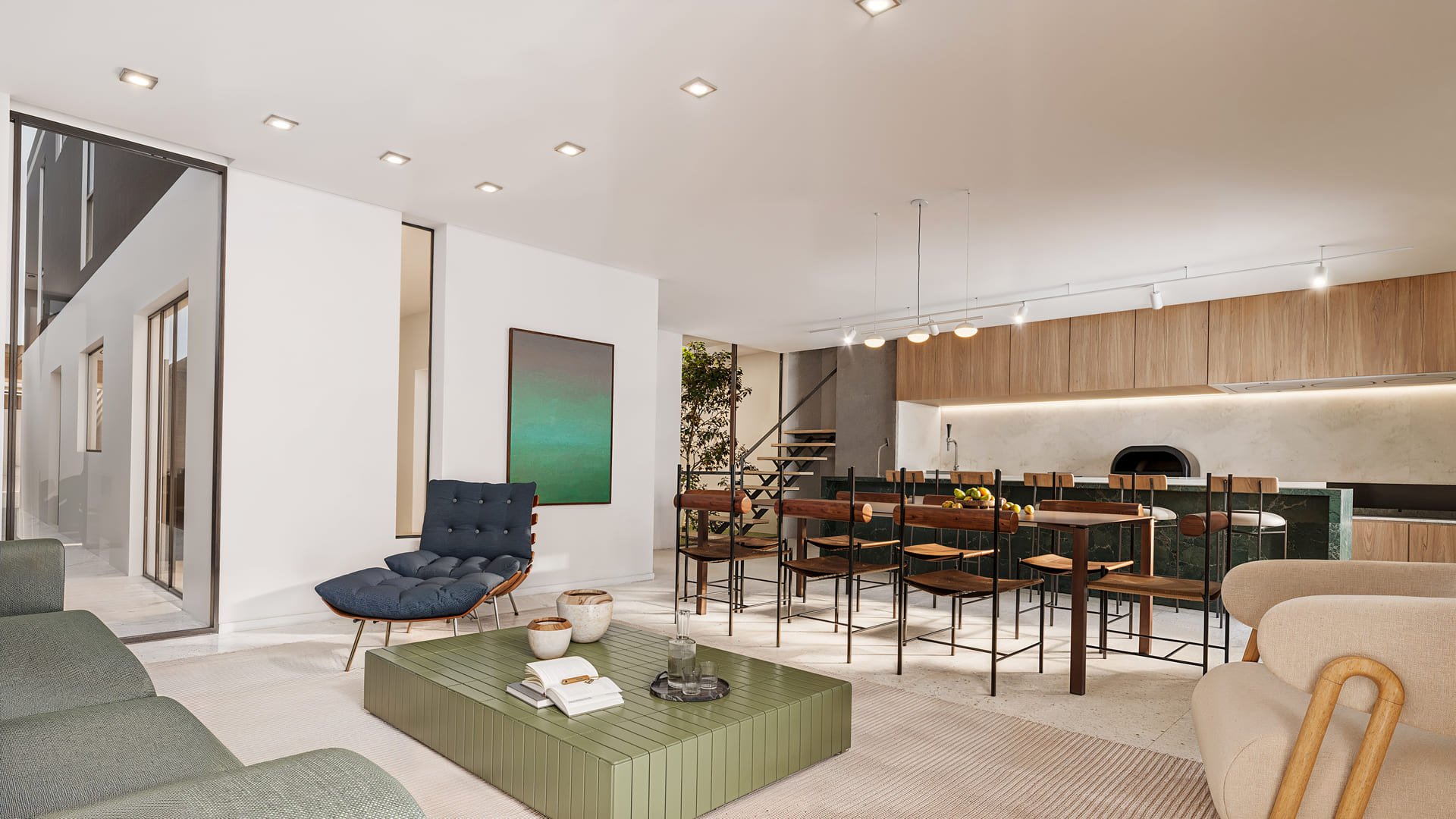 No projeto de reforma e ampliação dessa casa invertemos a lógica de distribuição original: toda a área social da casa foi voltada para o fundo do lote, com grande comunicação com a piscina e a área externa. A área gourmet veio pra dentro da casa com uma ampla sala de estar e jantar. A cozinha manteve-se no centro da construção, mesma posição da casa original, pórem foi reorganizada com bancada em L e canto alemão, trazendo maior conforto no dia-a-dia