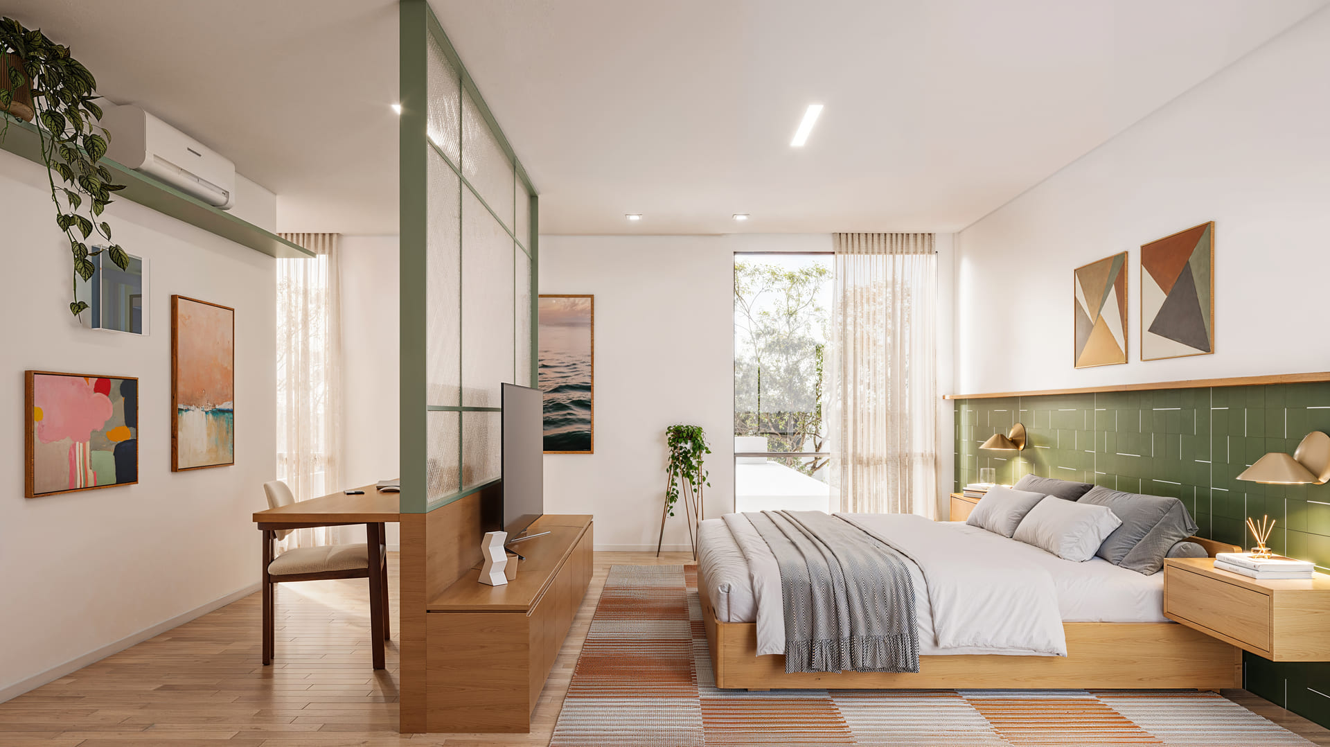 Todos os dormitórios foram locados no segundo pavimento, acessado por uma escada metálica ao lado do jardim de inverno. A casa passou a ter 4 dormitórios amplos com banheiro suíte. O dormitório master conta ainda com closet e escritório integrado.