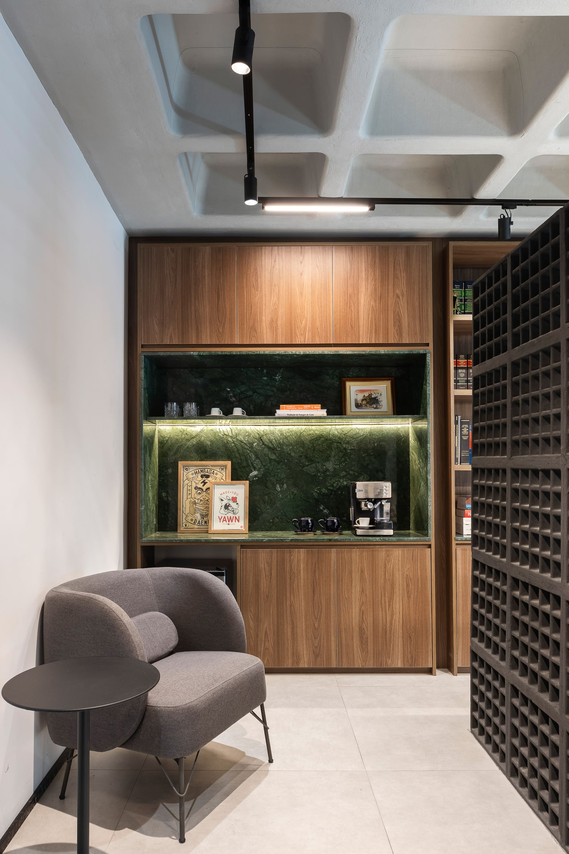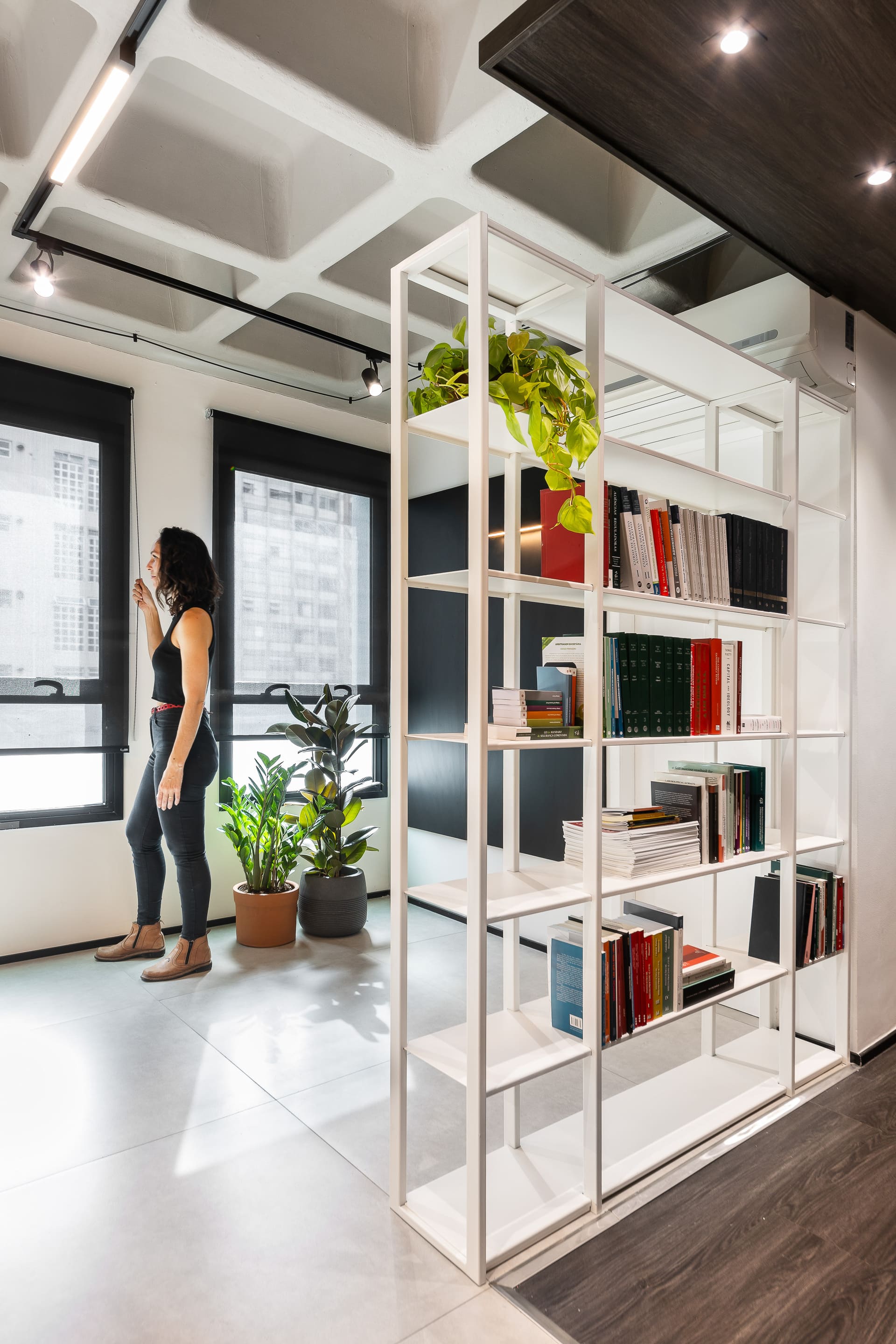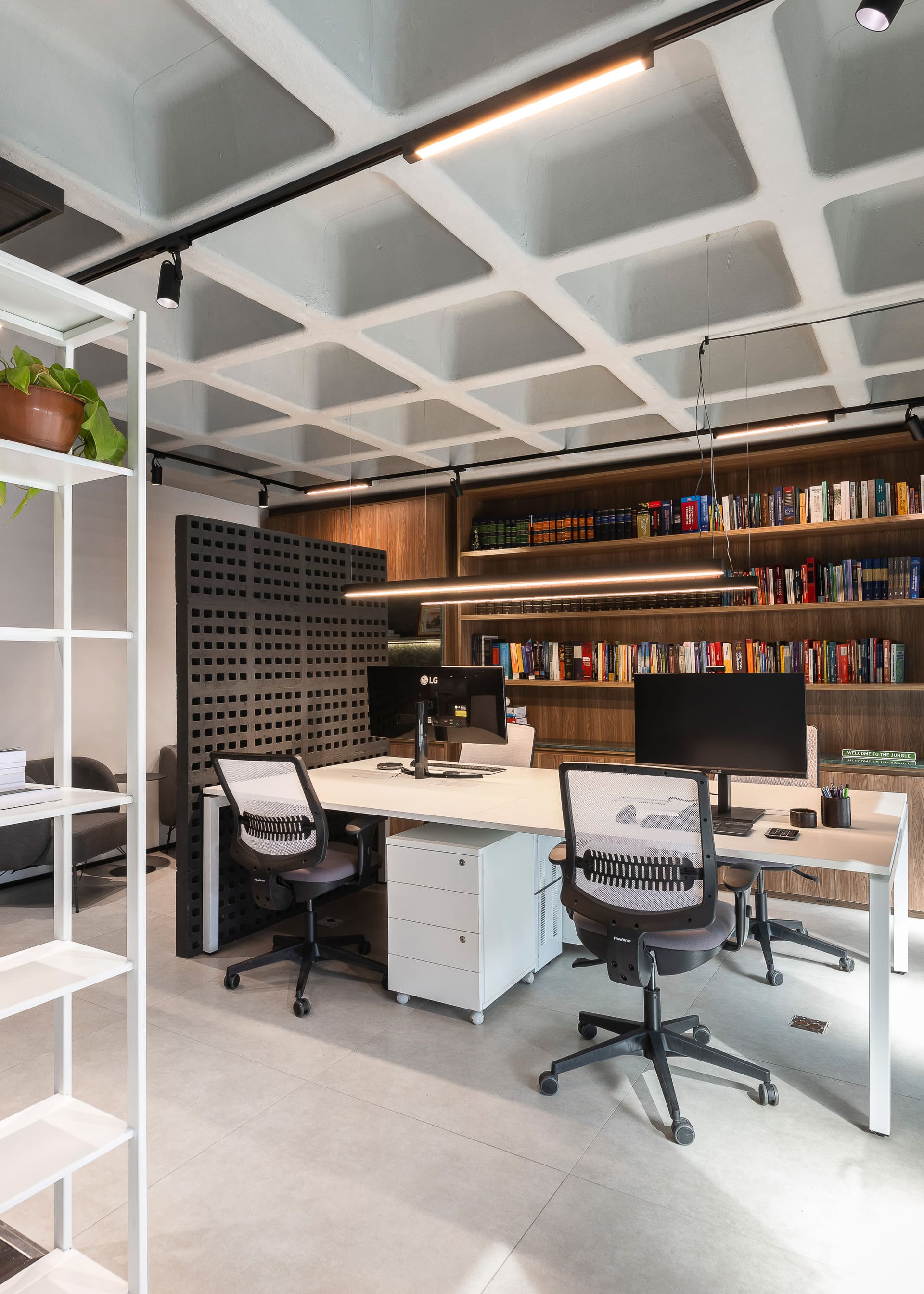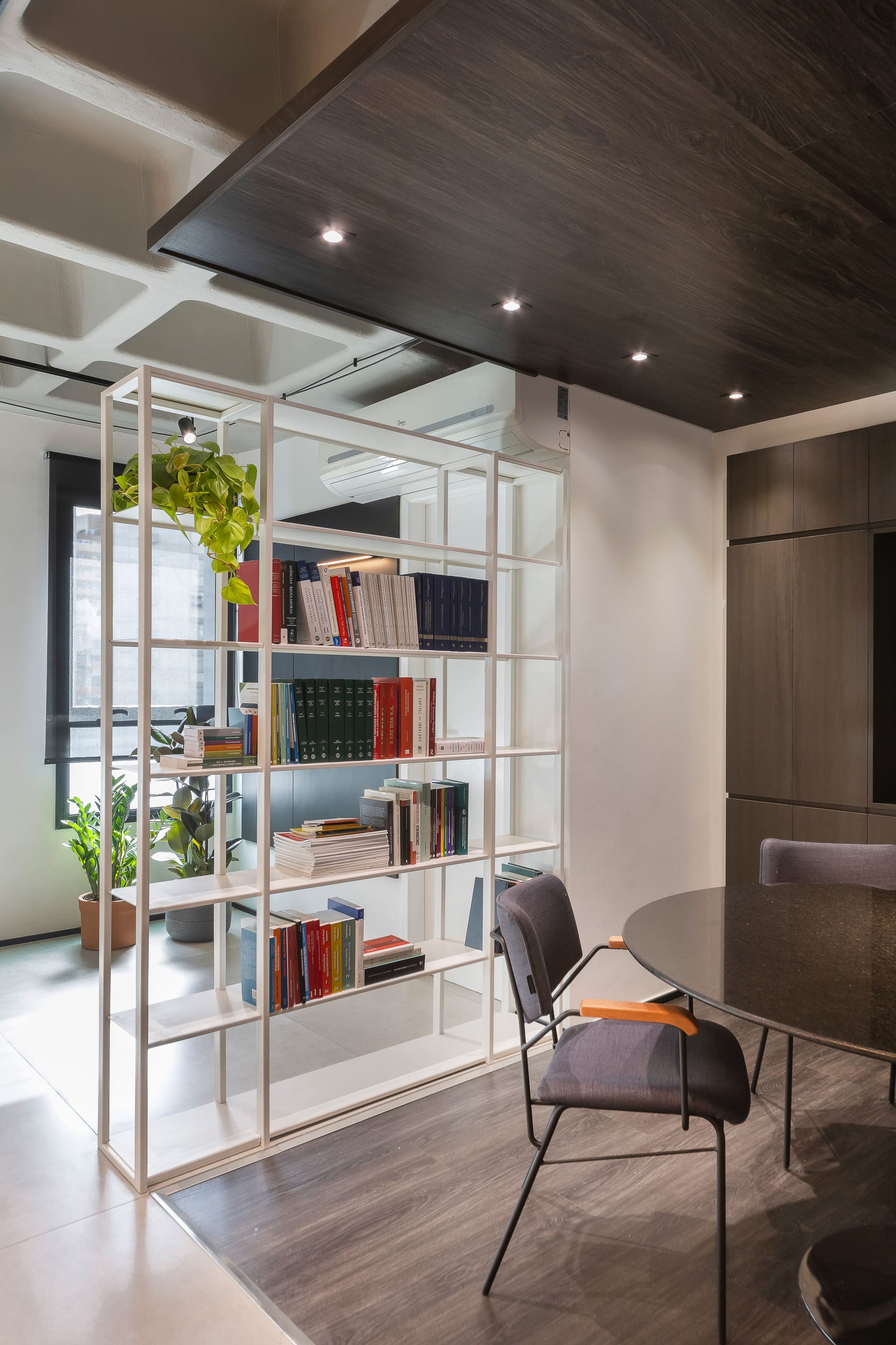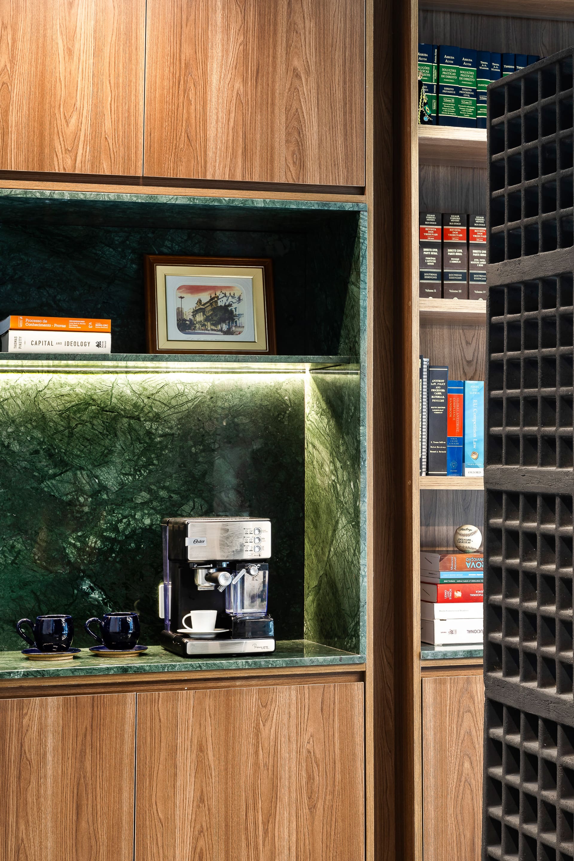 Entre as principais premissas estava a necessidade de organizar o ambiente de trabalho e criar soluções inteligentes de armazenagem para o amplo acervo de livros jurídicos. Assim, o projeto desenhou uma estante de marcenaria sob medida, que ocupa toda a parede de fundo das mesas de trabalho. Essa estante foi pensada em dois setores bem definidos: um dedicado à área do café e frigobar, e outro voltado ao trabalho e guarda de livros.