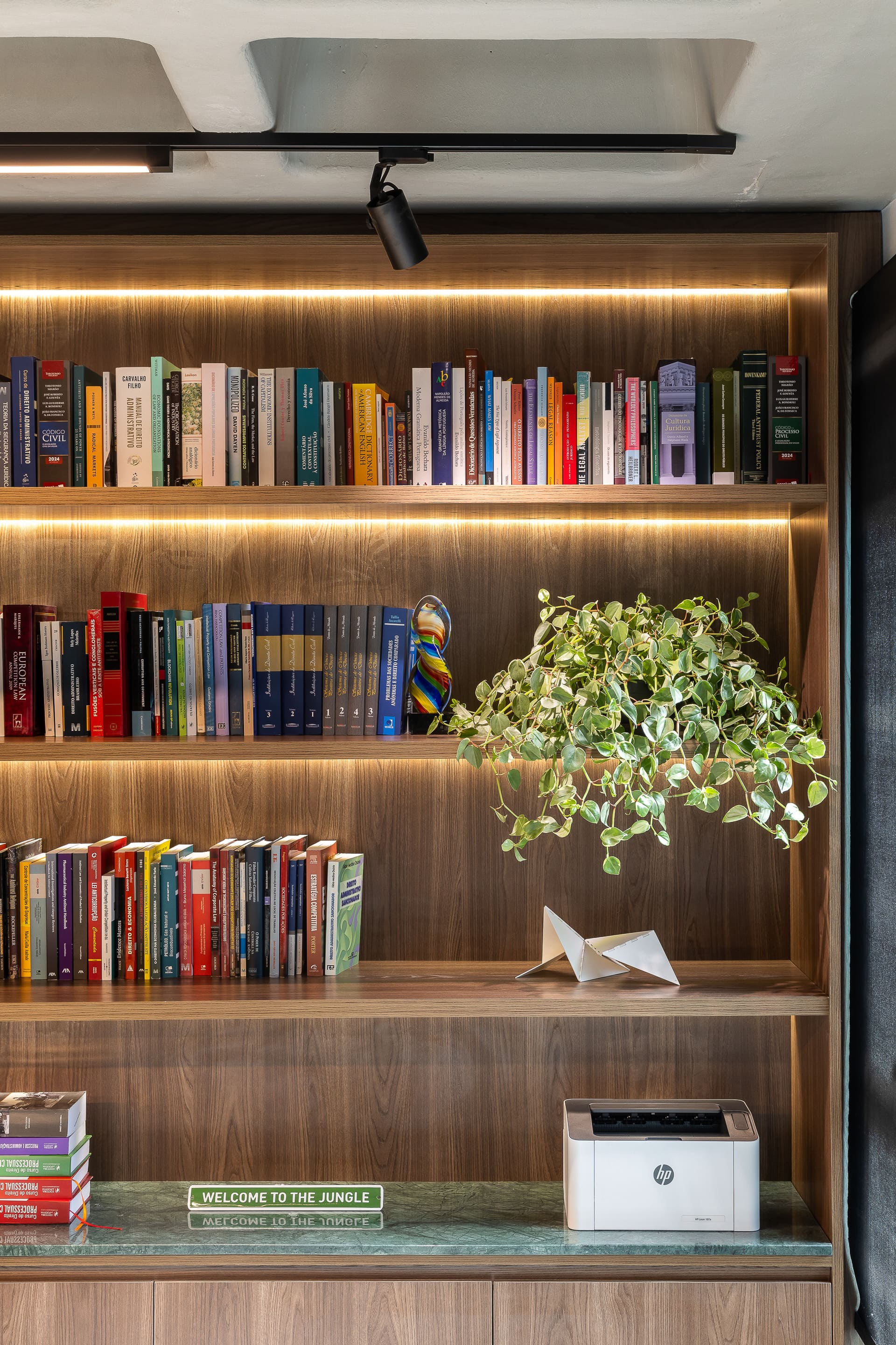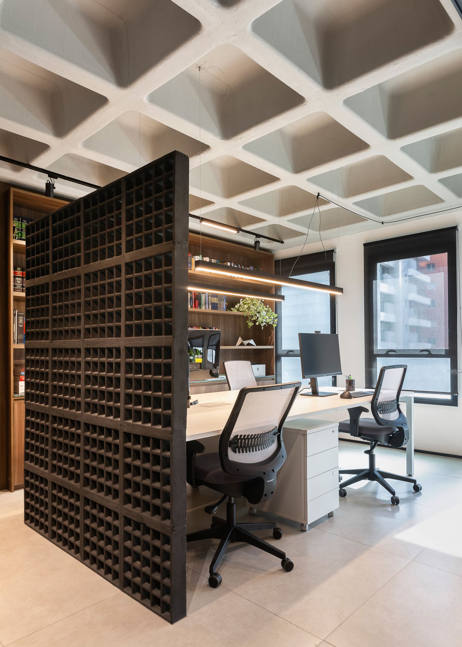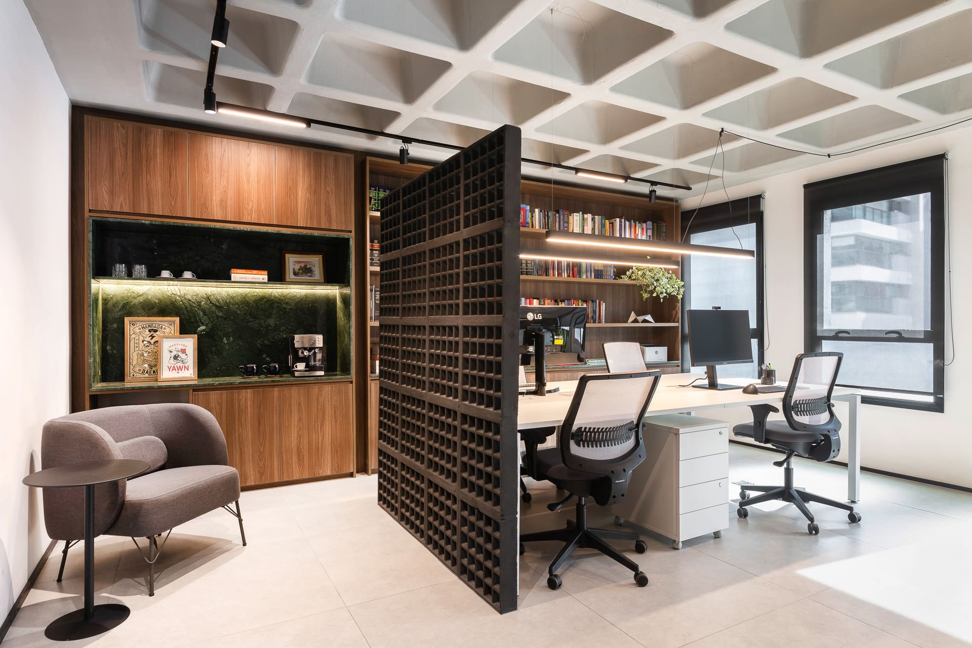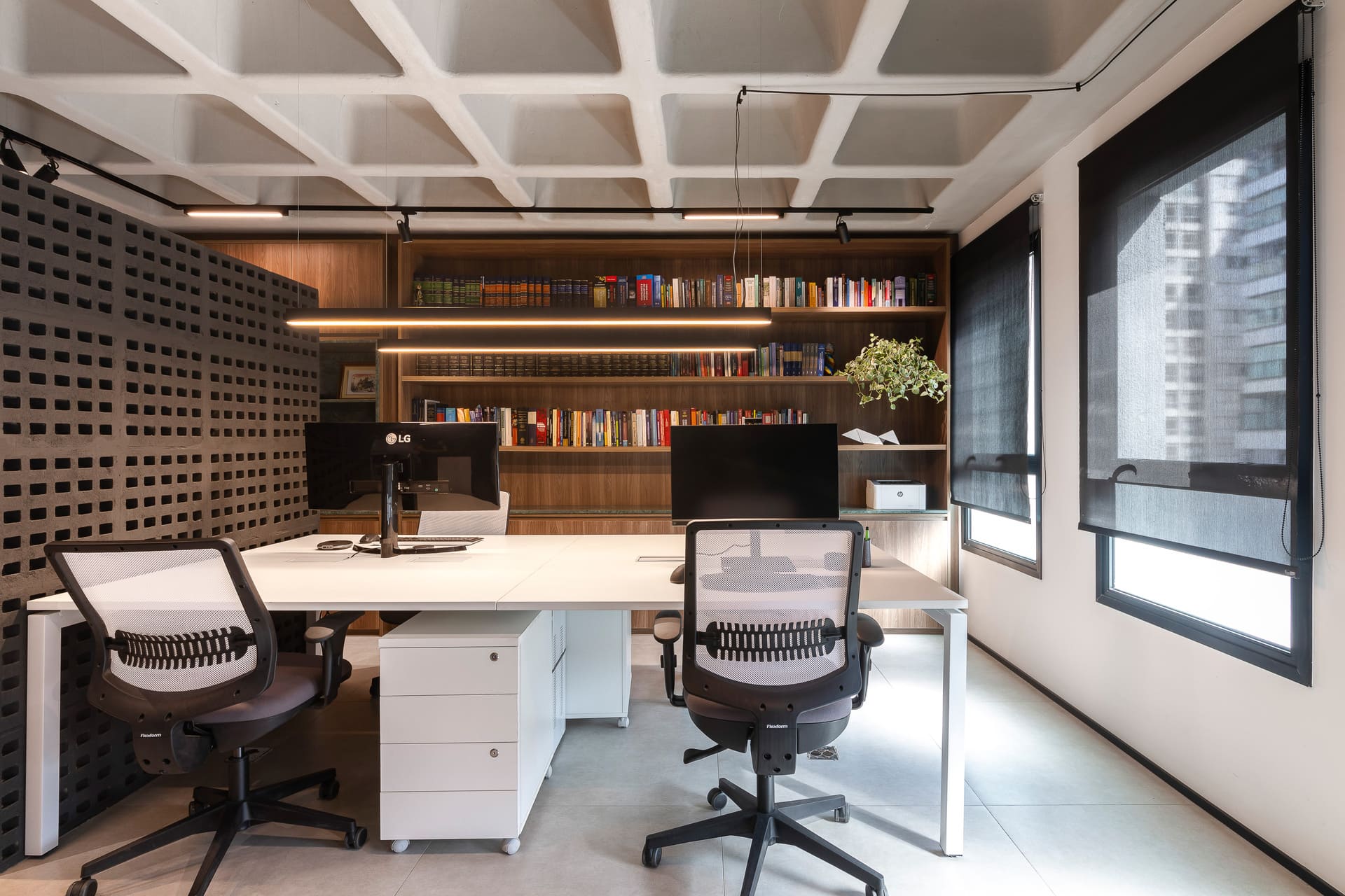 Entre as principais premissas estava a necessidade de organizar o ambiente de trabalho e criar soluções inteligentes de armazenagem para o amplo acervo de livros jurídicos. Assim, o projeto desenhou uma estante de marcenaria sob medida, que ocupa toda a parede de fundo das mesas de trabalho. Essa estante foi pensada em dois setores bem definidos: um dedicado à área do café e frigobar, e outro voltado ao trabalho e guarda de livros.