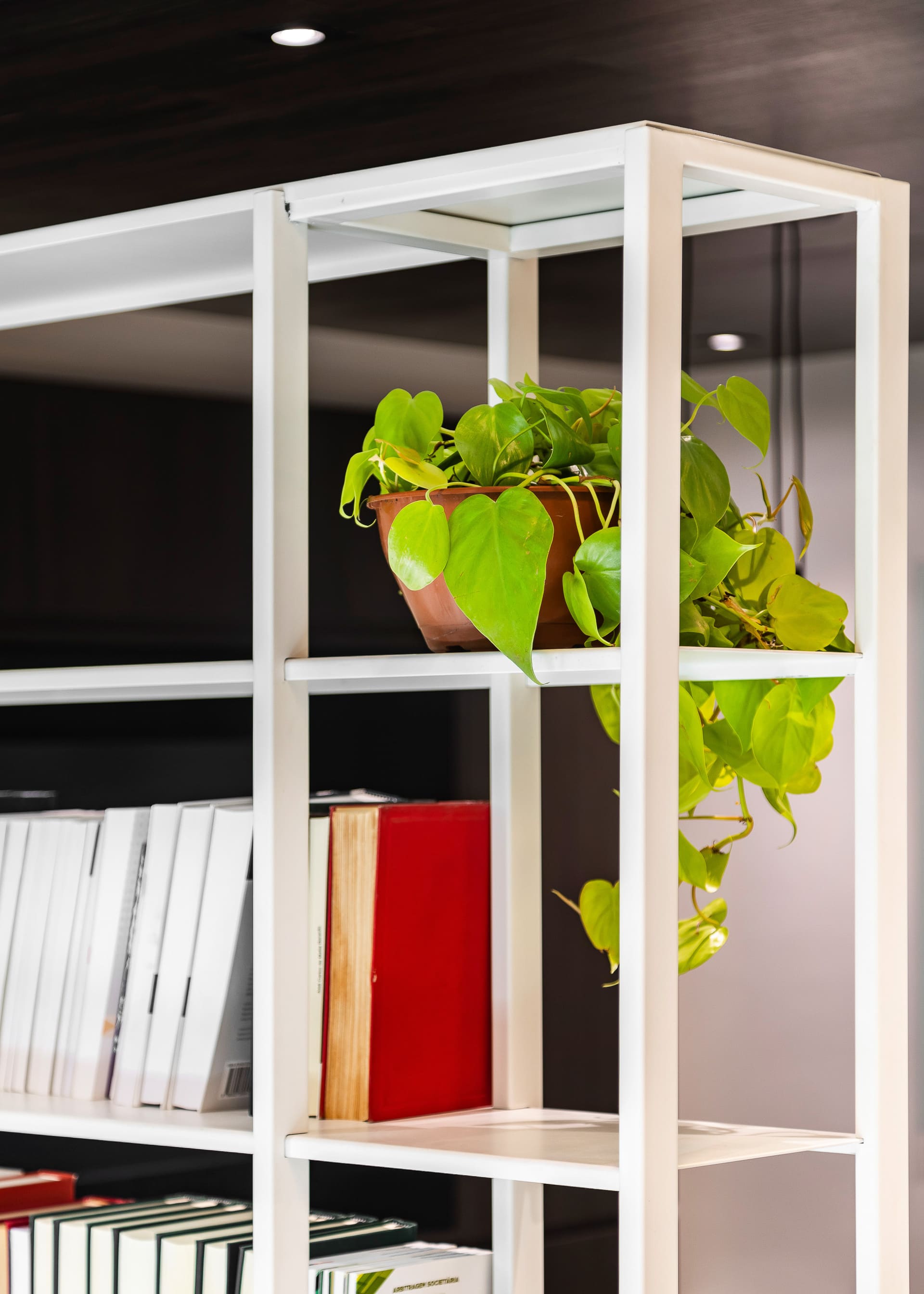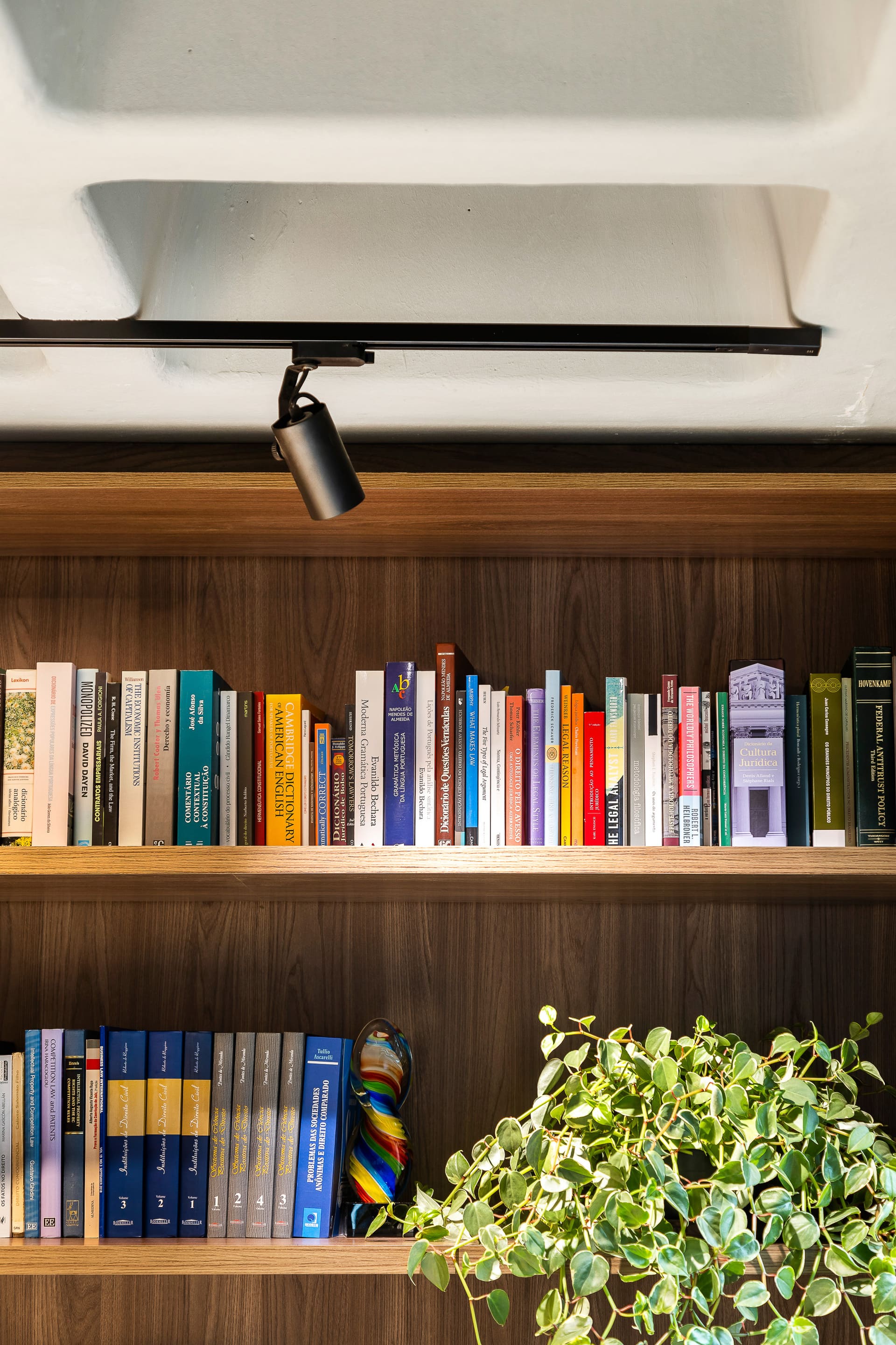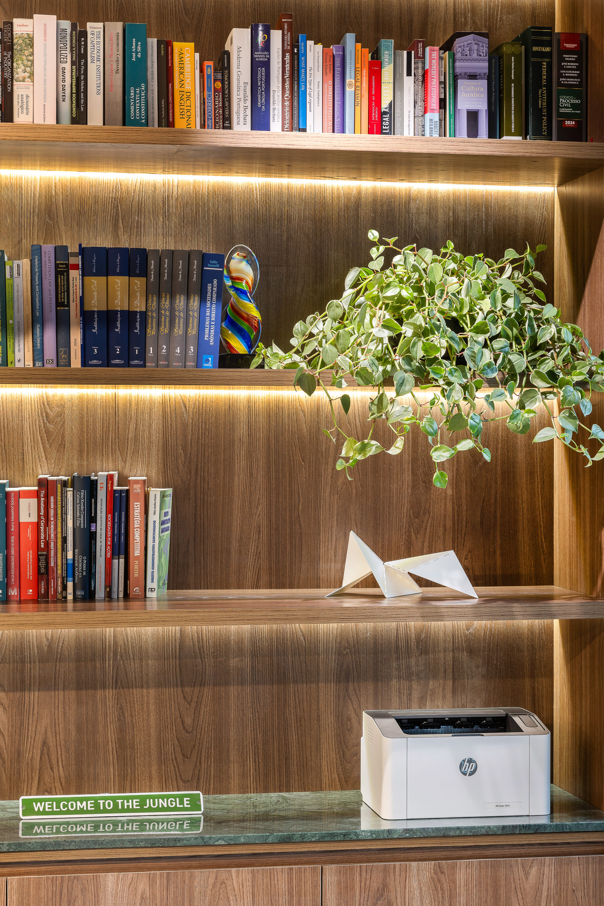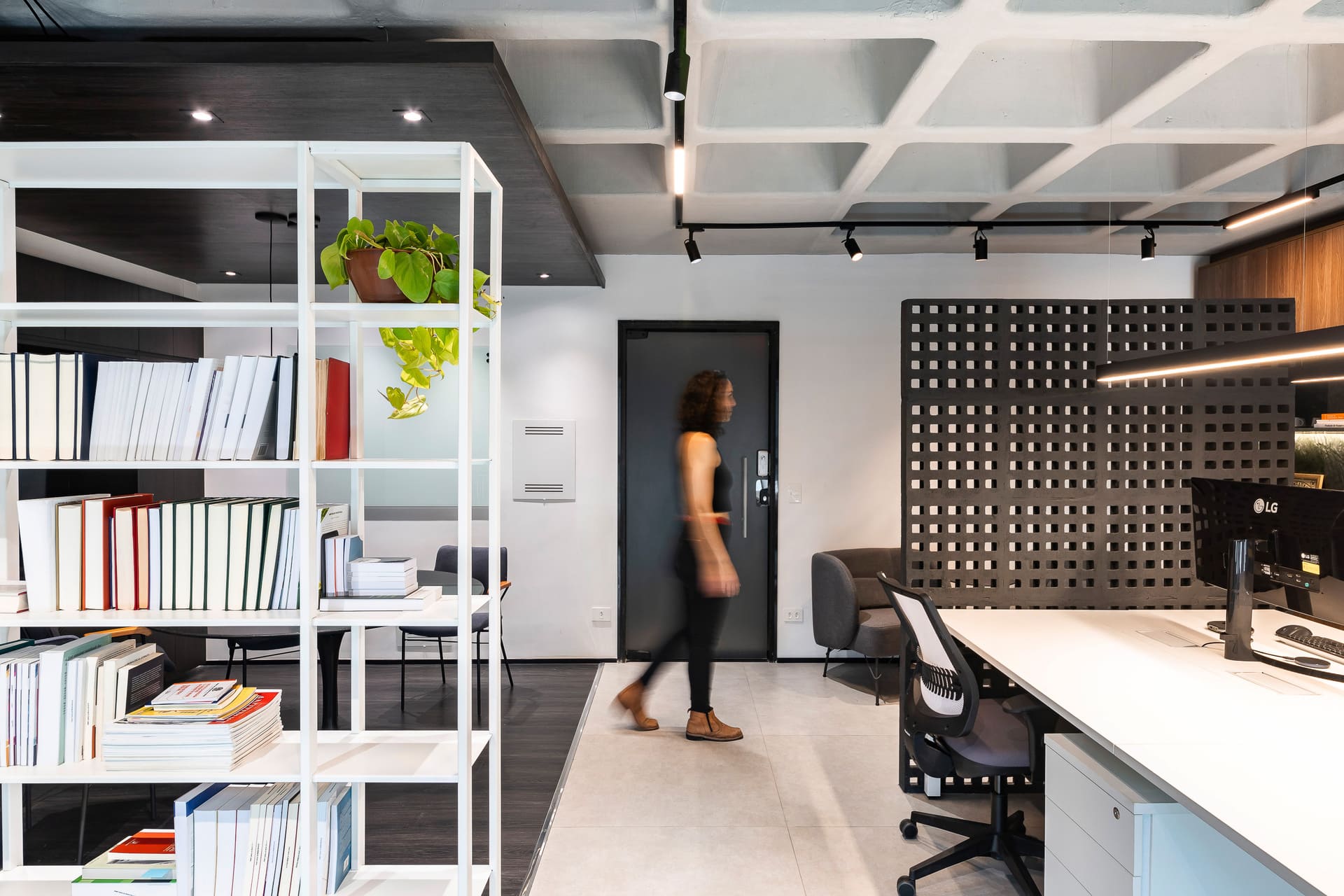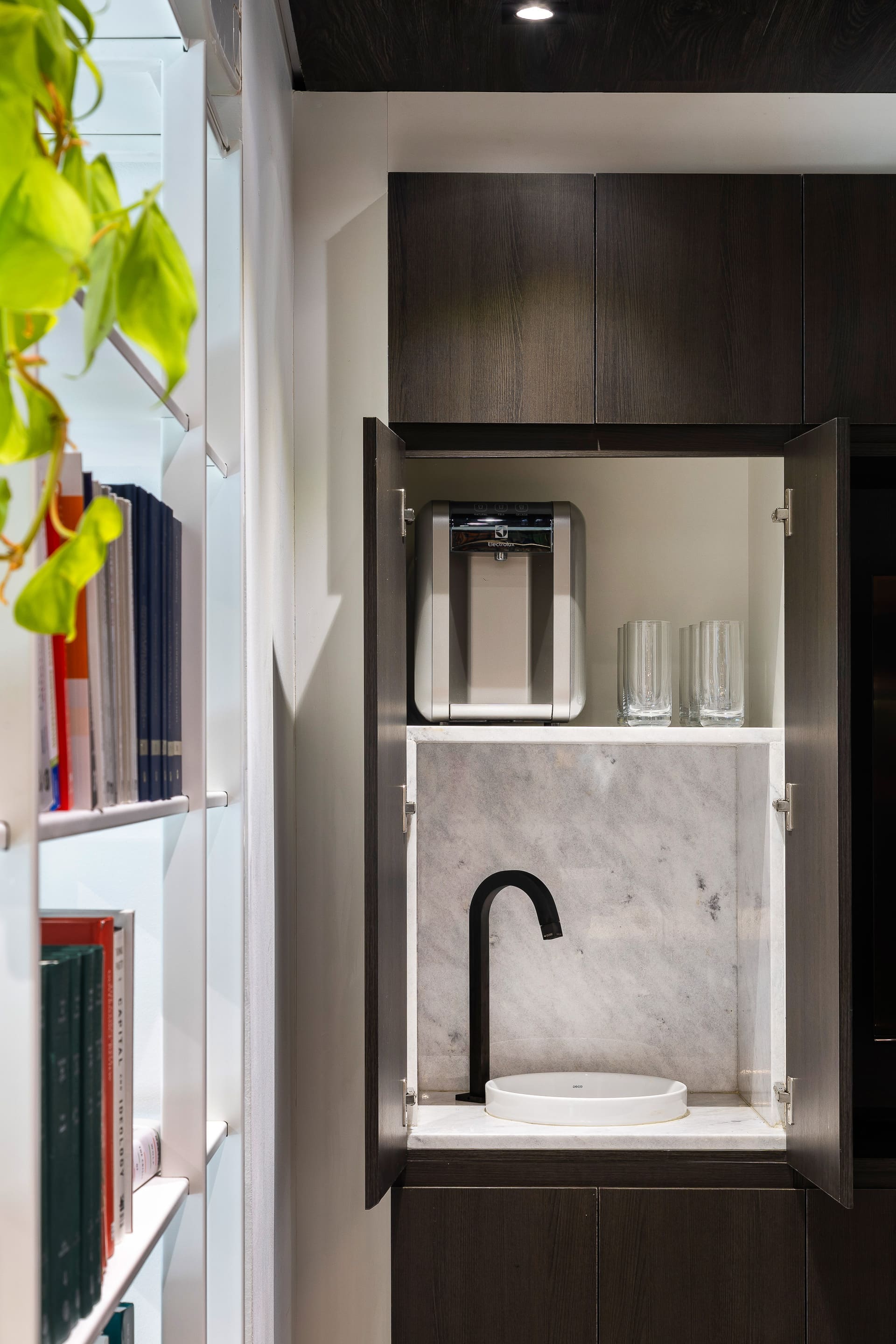 Entre as principais premissas estava a necessidade de organizar o ambiente de trabalho e criar soluções inteligentes de armazenagem para o amplo acervo de livros jurídicos. Assim, o projeto desenhou uma estante de marcenaria sob medida, que ocupa toda a parede de fundo das mesas de trabalho. Essa estante foi pensada em dois setores bem definidos: um dedicado à área do café e frigobar, e outro voltado ao trabalho e guarda de livros.