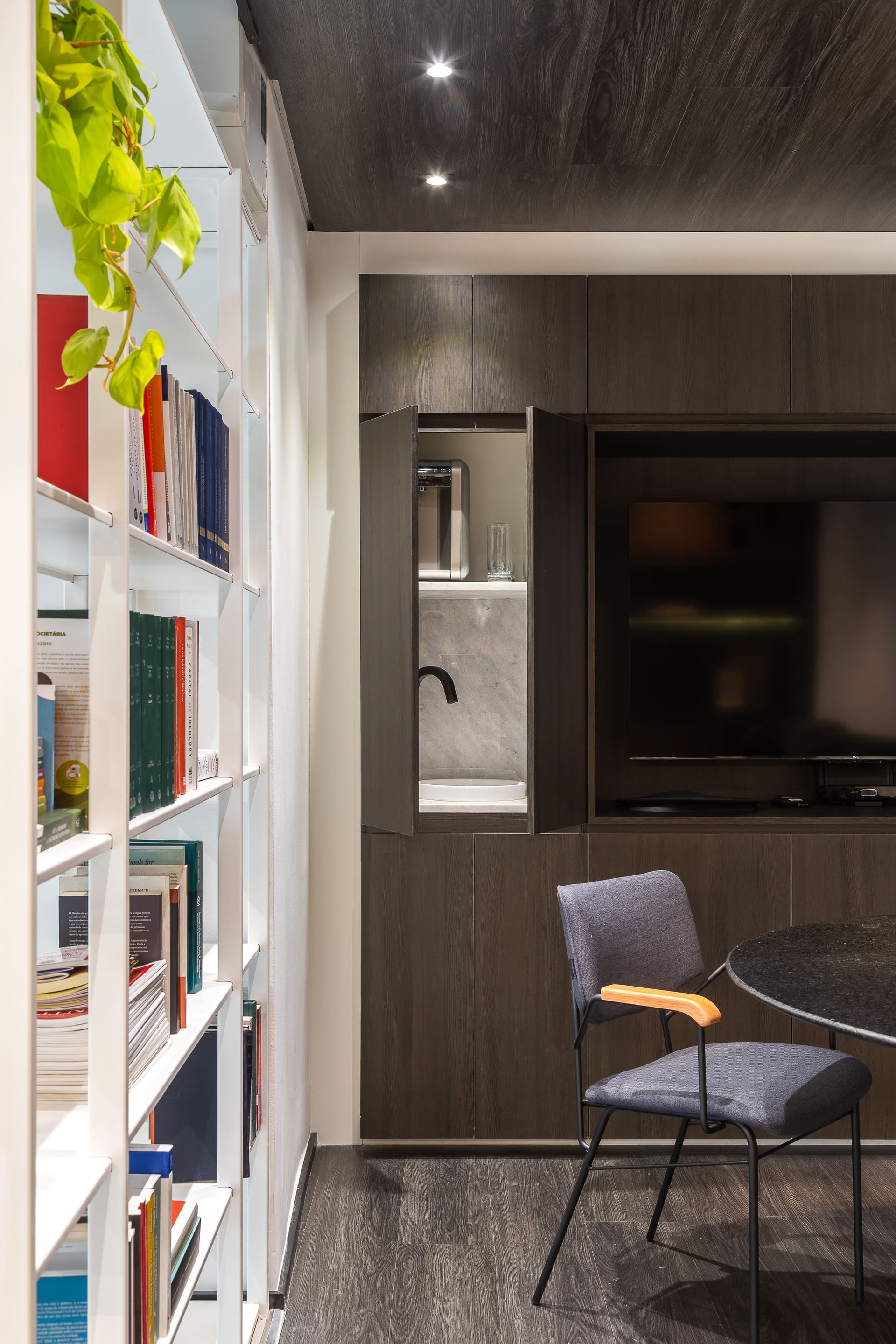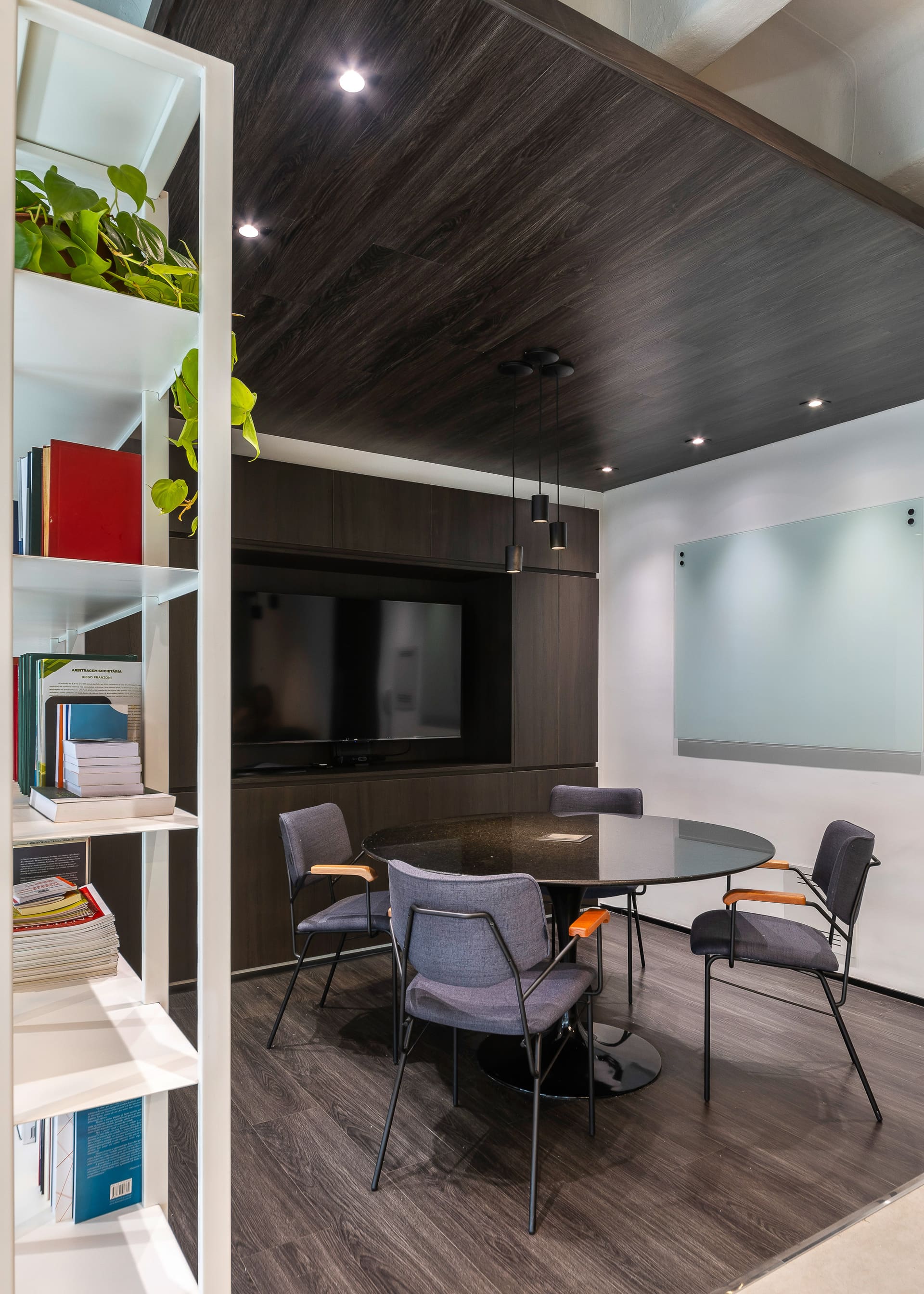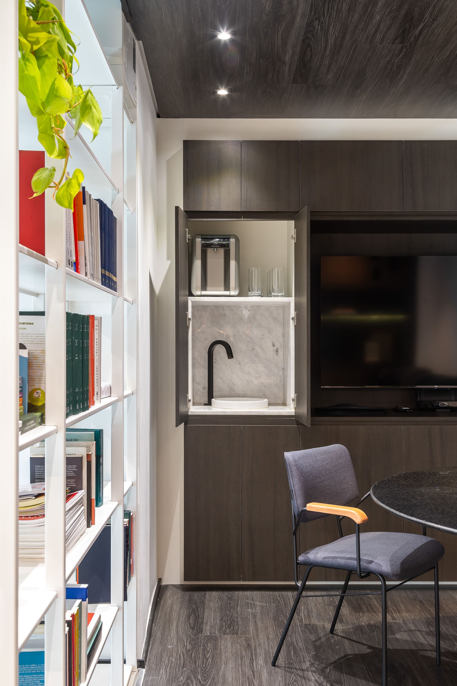 Para a sala de reuniões, criamos uma verdadeira “caixa preta”: o mesmo material do piso sobe para o forro, garantindo unidade e aconchego. No fundo, um armário de marcenaria abriga a TV e o sistema de cabeamento embutido, além de esconder uma mini copa com pia e filtro de água. Tudo milimetricamente planejado para funcionar na prática.