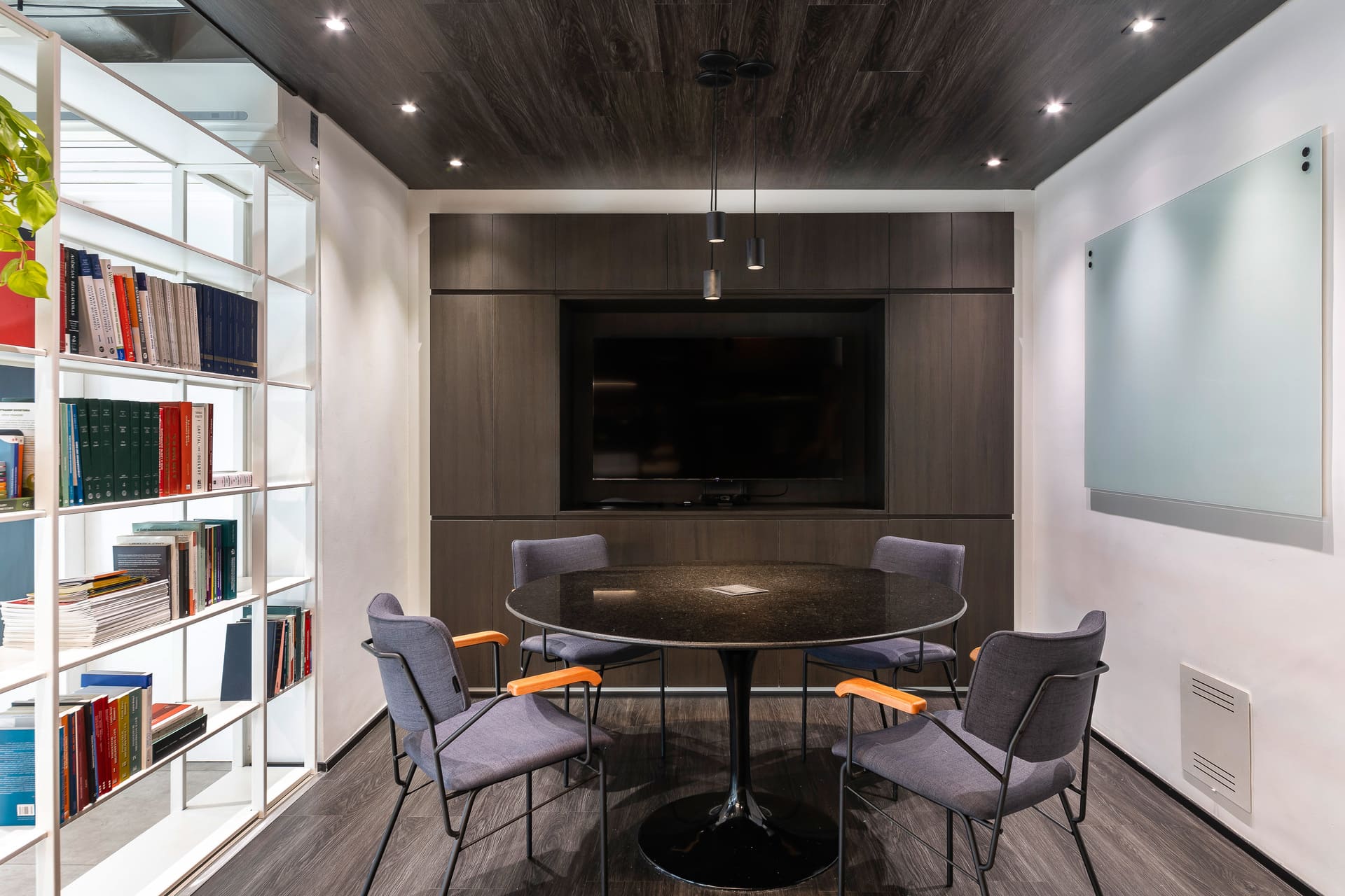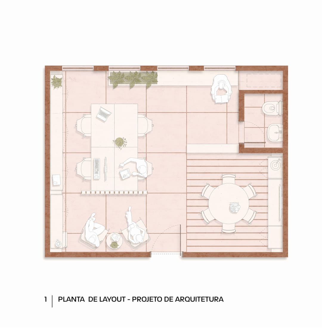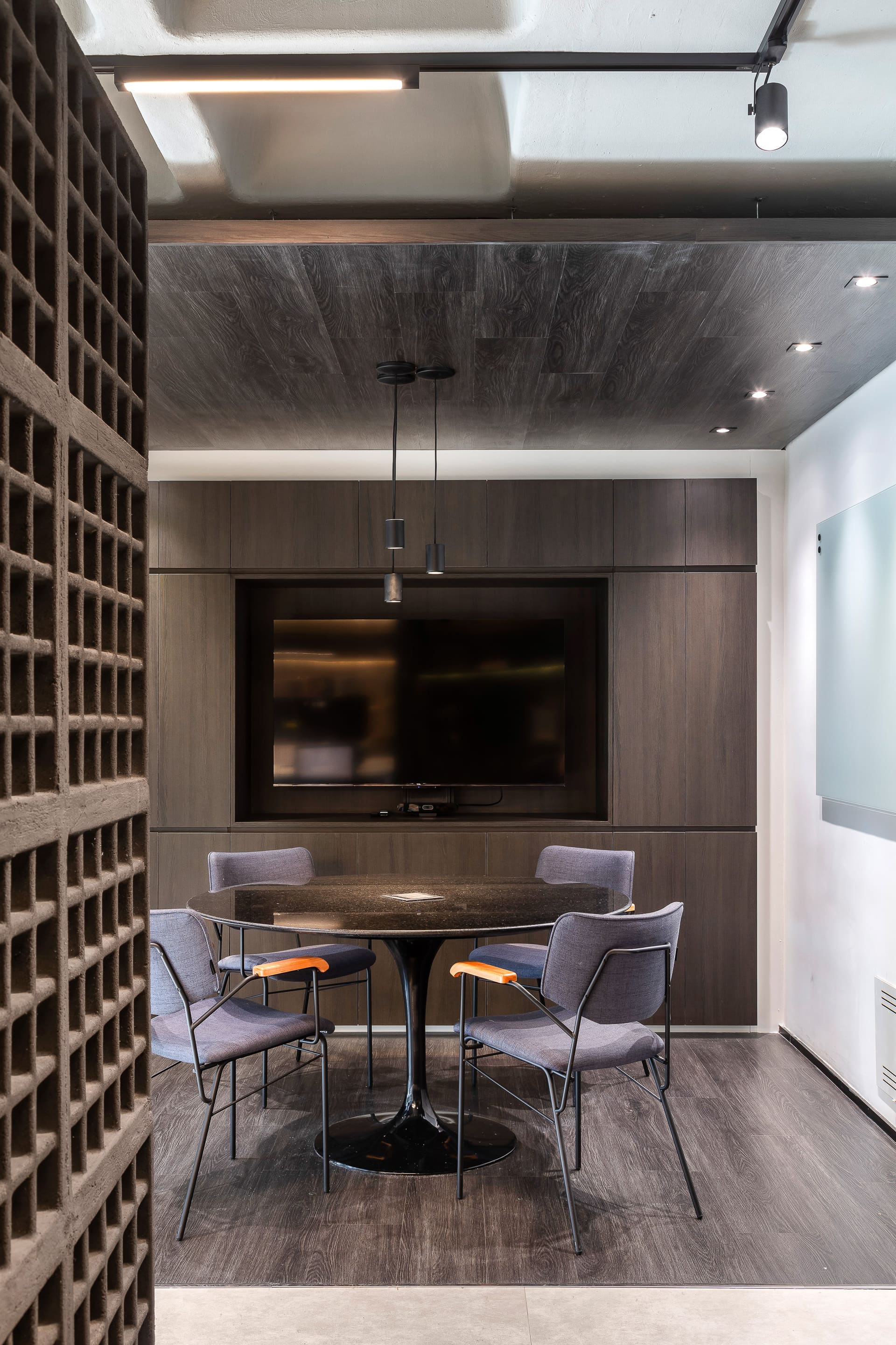 Para a sala de reuniões, criamos uma verdadeira “caixa preta”: o mesmo material do piso sobe para o forro, garantindo unidade e aconchego. No fundo, um armário de marcenaria abriga a TV e o sistema de cabeamento embutido, além de esconder uma mini copa com pia e filtro de água. Tudo milimetricamente planejado para funcionar na prática.