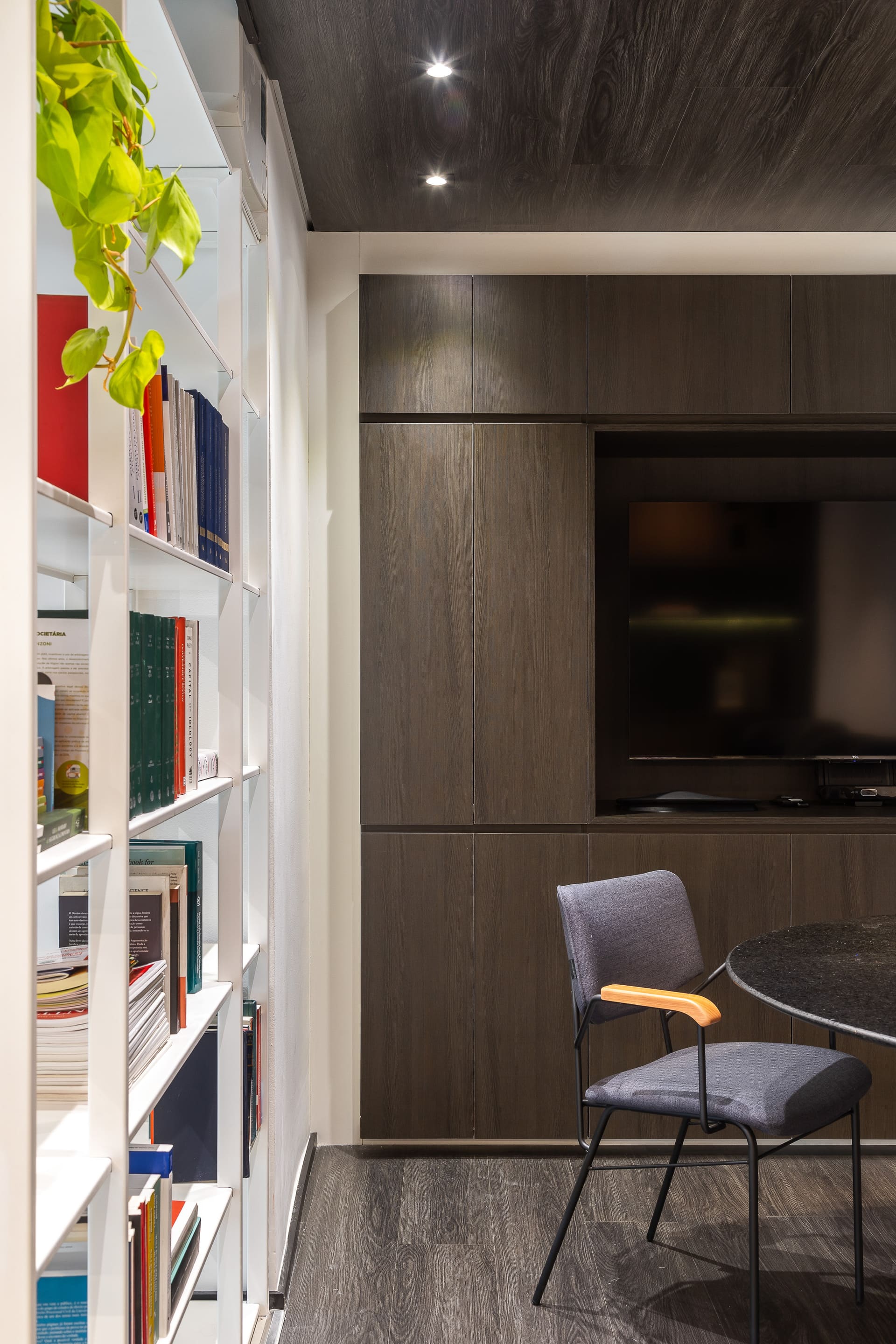 Para delimitar o espaço e disfarçar o acesso ao banheiro, desenhamos uma estante metálica leve, que permite a passagem da luz natural e cria um contraponto elegante à marcenaria escura. Um gesto simples, mas que reafirma a essência do projeto: o equilíbrio entre funcionalidade e estética.
