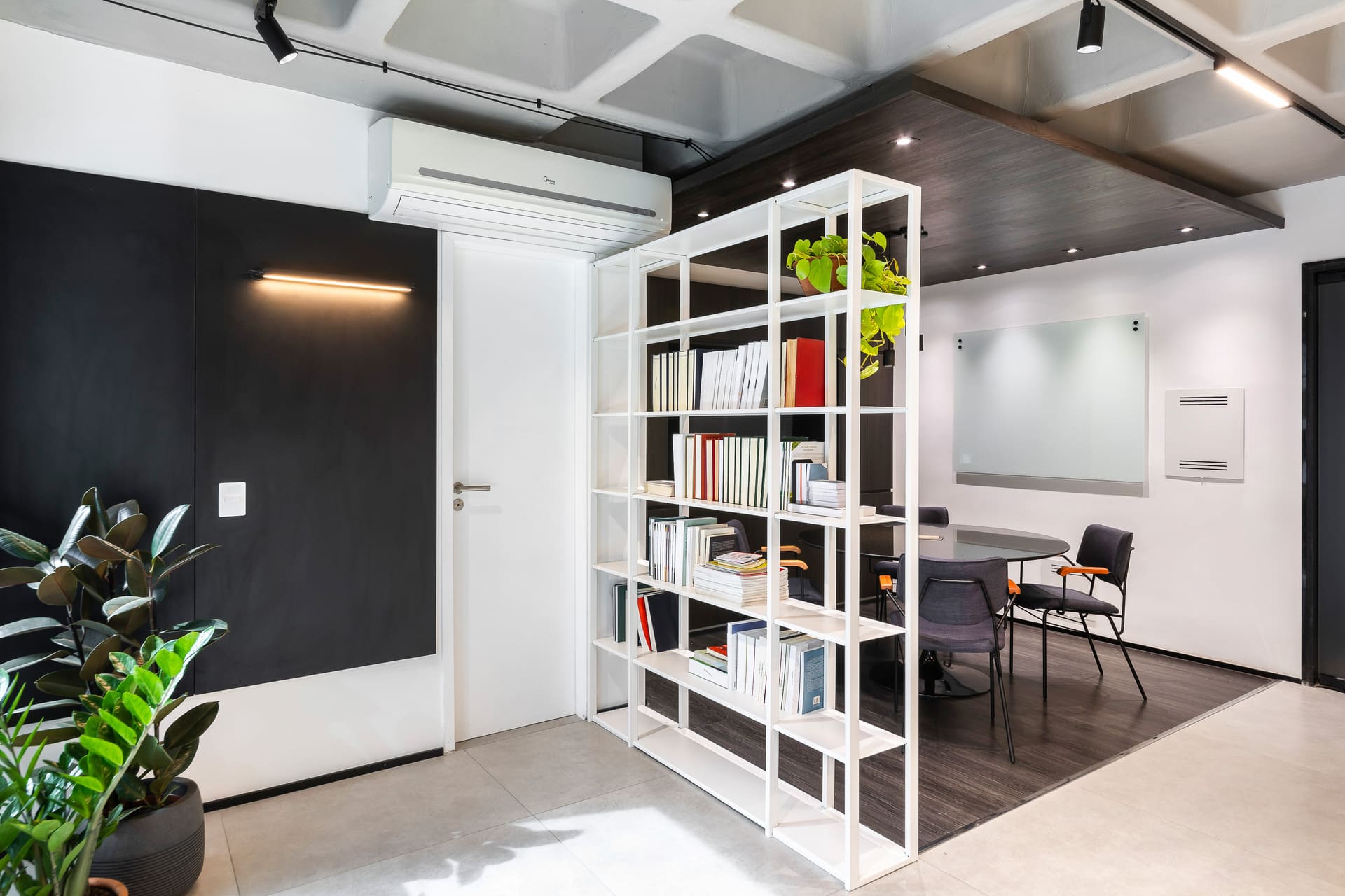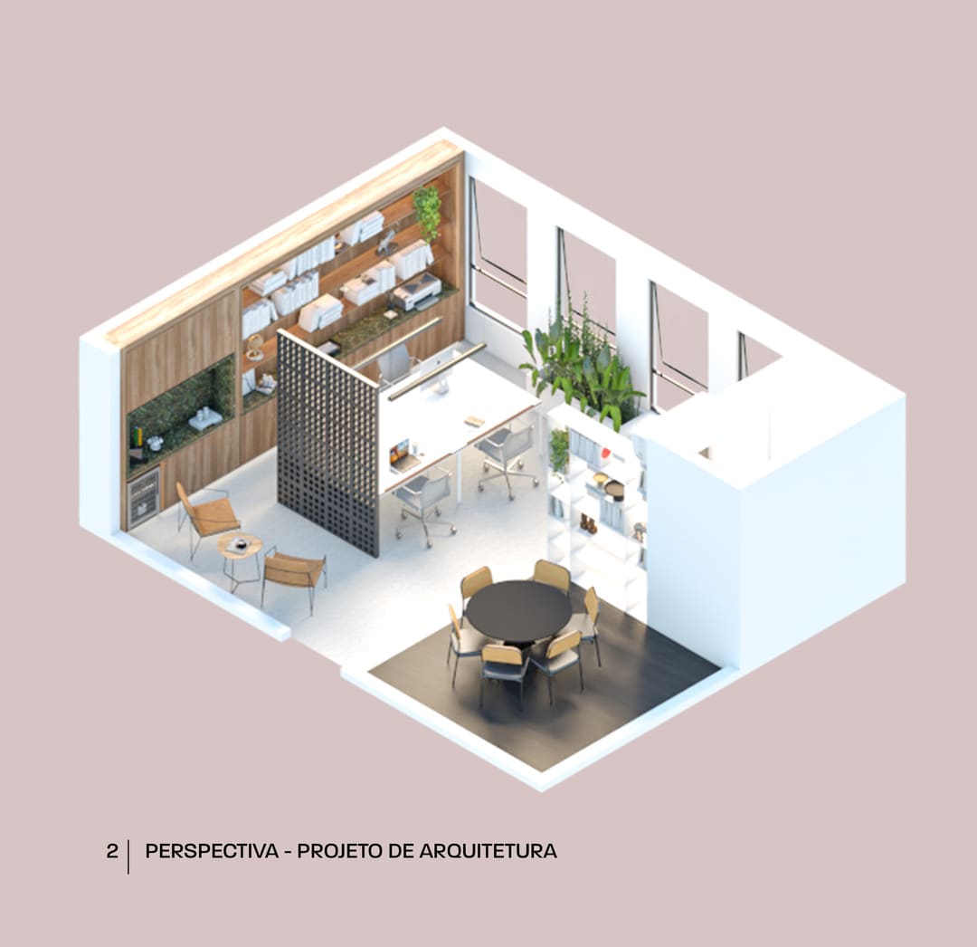 Esse foi o primeiro projeto de 2024 — e também um reencontro muito especial. O cliente, um advogado querido, já havia confiado em nosso trabalho na reforma de seu apartamento em 2022, quando criamos um espaço dedicado ao home office. Dois anos depois, o escritório cresceu, e a vida pediu uma nova etapa: tirar o trabalho de dentro de casa.