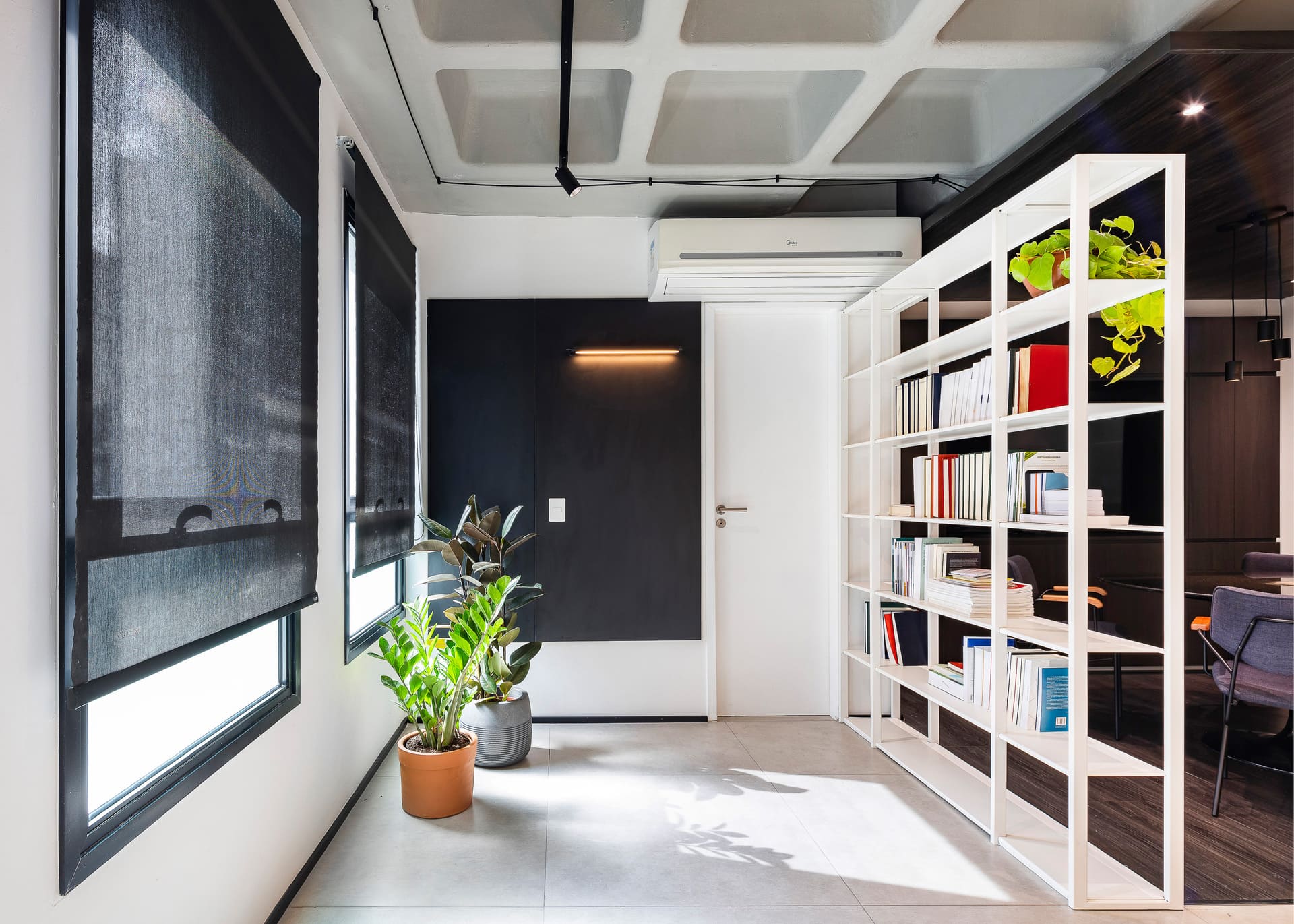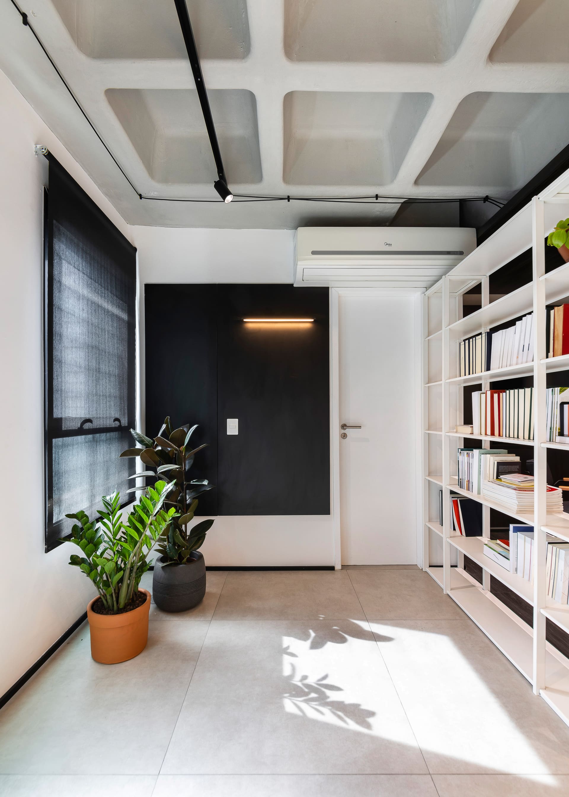 A reforma da Sala Comercial Oscar Freire foi direta e prazerosa — daquelas obras “sem rodeios”. O espaço original, uma verdadeira tela em branco, ganhou um ar contemporâneo e cheio de personalidade. A laje nervurada foi deixada aparente, revelando a estrutura do edifício e trazendo autenticidade ao conjunto. A iluminação em acabamento preto e a divisória de cobogós de concreto, executada especialmente durante a obra, reforçam a estética industrial que norteia o projeto.