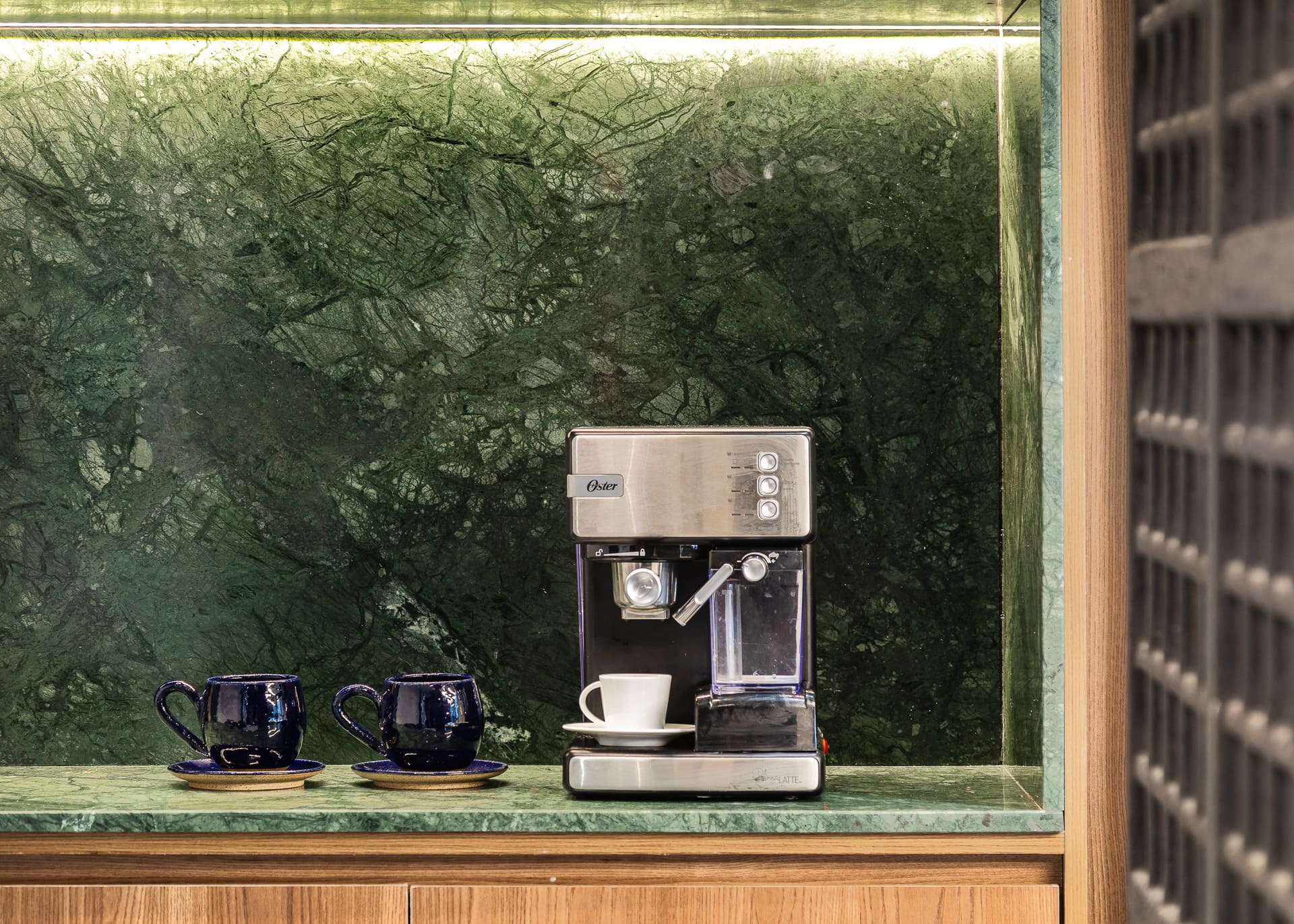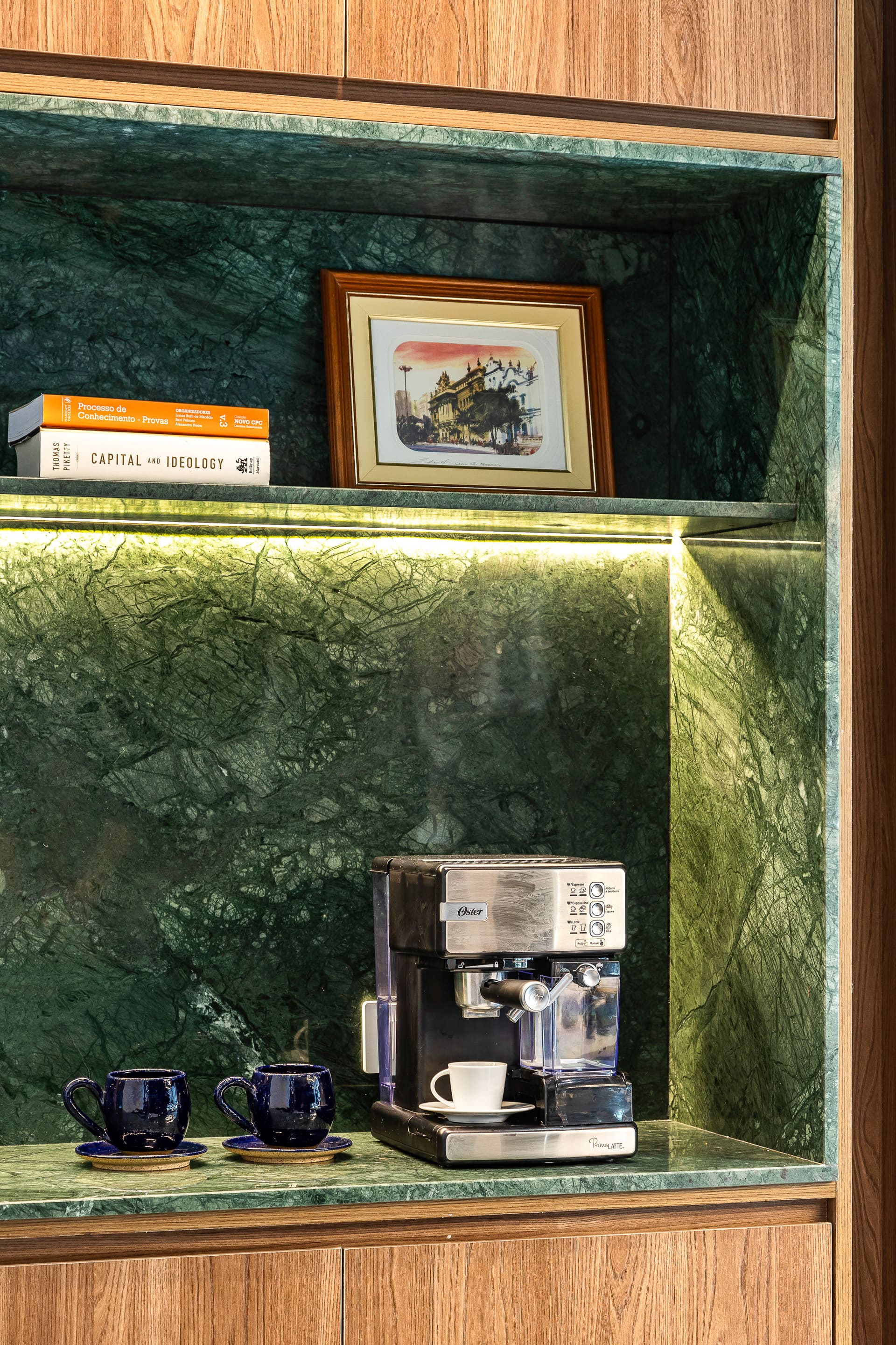 Um dos destaques da reforma foi a sincronia entre marcenaria e marmoraria — as peças em mármore Verde Guatemala foram apoiadas diretamente na estrutura de madeira, e não na parede, como costuma acontecer. Um detalhe técnico e estético que traduz o cuidado com cada decisão do projeto.